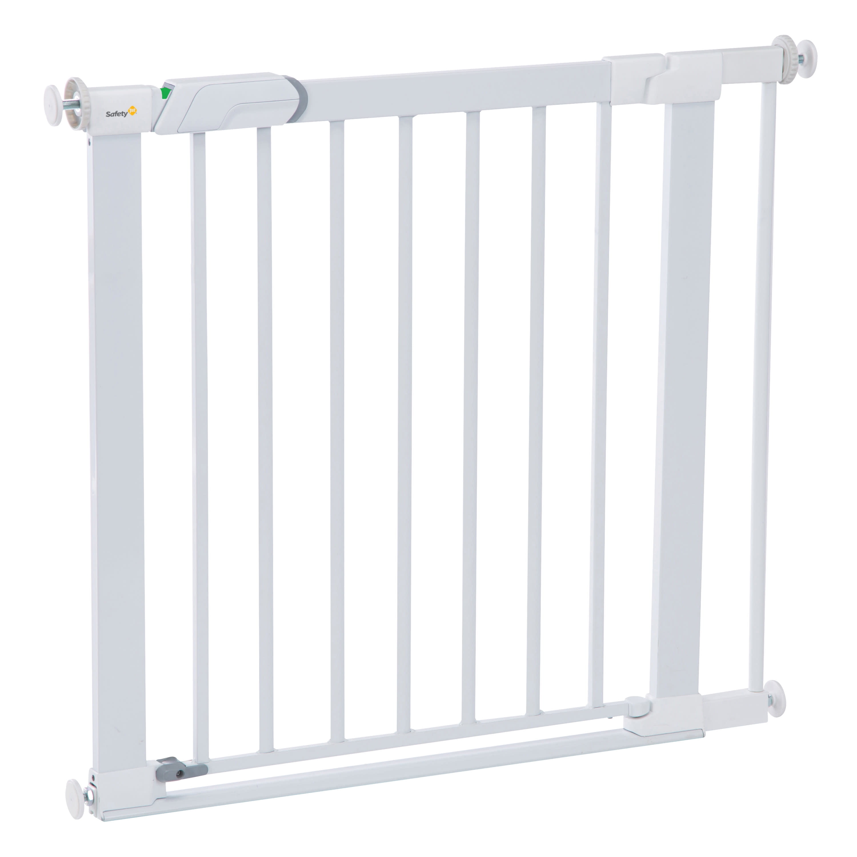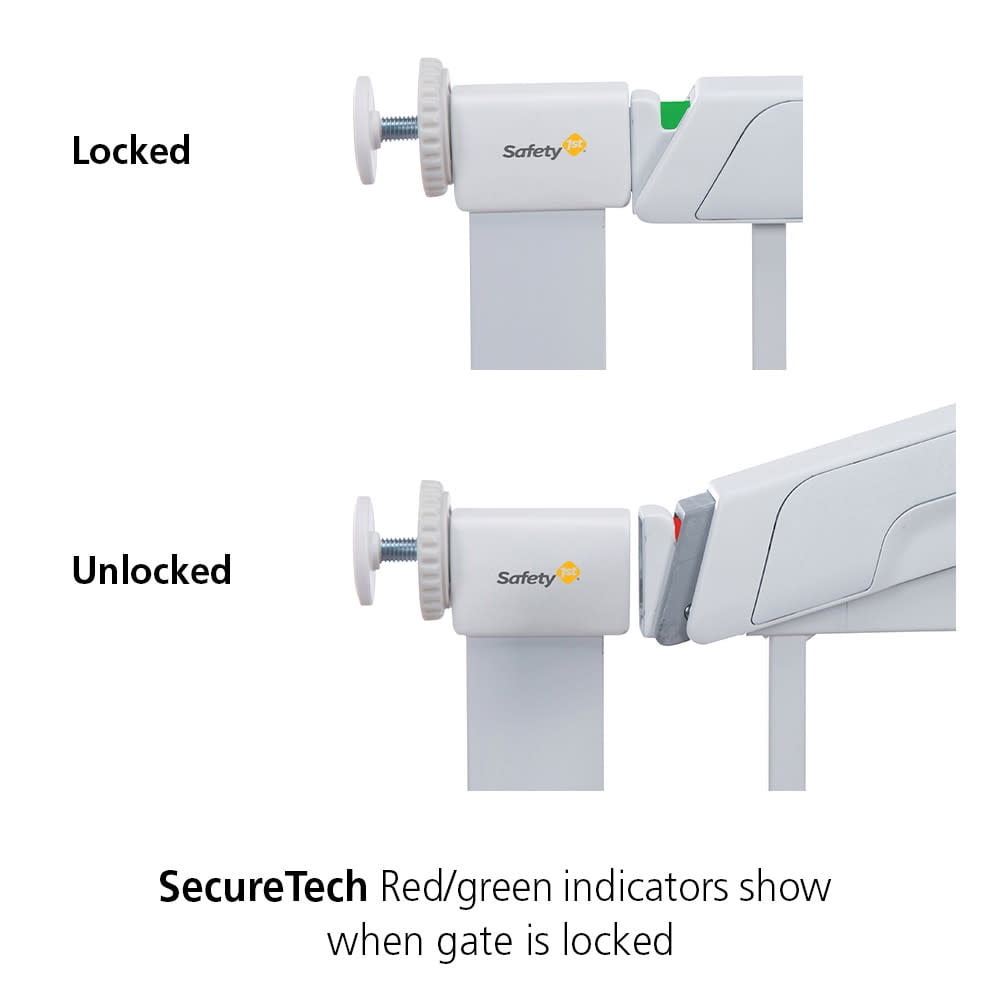 Safety 1st Flat Step SecureTech Baby Gate, White For use as a barrier at bottom of stairs and hallways & doorways Flat step for less trip hazard 28.5 inches tall Width can be adjusted from 28¾ to 31¼ inches Pressure-mounted and ergonomically-designed metal gate