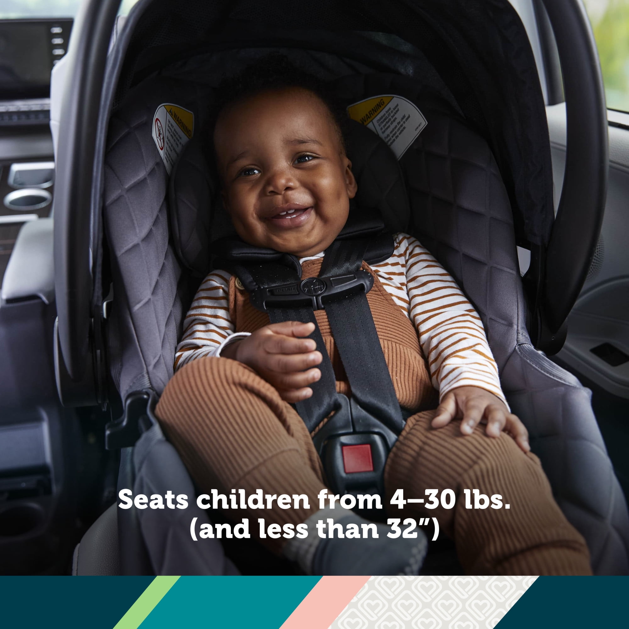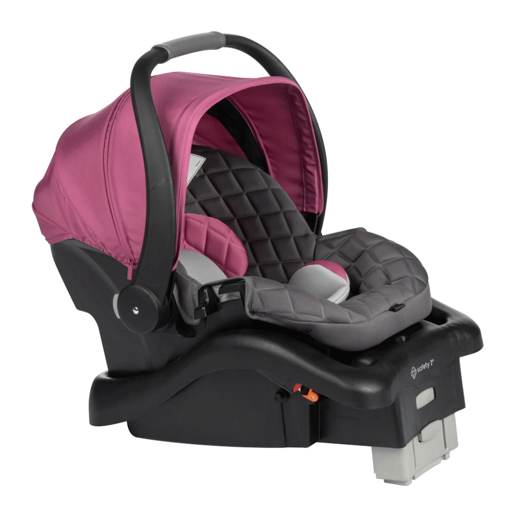 Provide your baby with a safe and comfortable ride with the Safety 1stonBoard™ Insta-Latch™ DLX Car Seat. The best part of the car seat base is how quick and easy it is to install with the Safety 1st onBoard Insta-Latch connectors. The SecureTech™ red-to-green indicators on the seat’s base allow you to see when your base is secured from the LATCH or vehicle belt. To give you the confidence of knowing that the base is correctly installed, the tab turns from red to green. Since every car is different, you can also adjust the base height for the right fit to your car. The 4 harness heights are designed to give your child a better fit from 4–30 lbs.(and less than 32″).The harness adjusts easily from the front of the seat with a simple pull to securely fit your child. The buckle adjusts in two ways so that you can customize the length and the buckle’s position on your child. Your baby will be nice and comfortable relaxing in the soft fabrics and plush padding. On sunny days, the zippered mesh extension on the canopy offers additional shade, and lets you peek in on your little one without retracting the canopy. Smaller babies get the extra support they need with head and body inserts that can be removed as they grow.