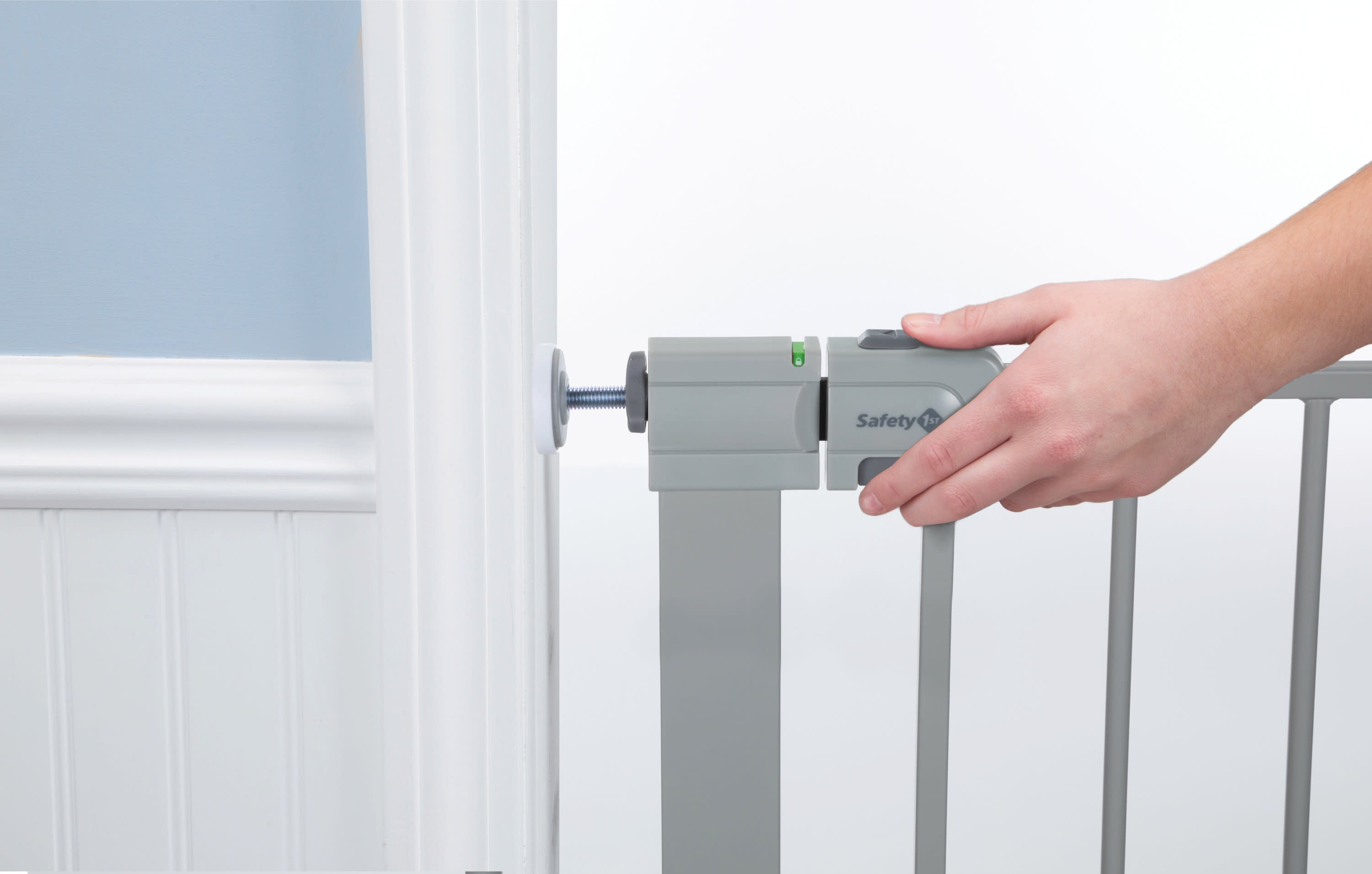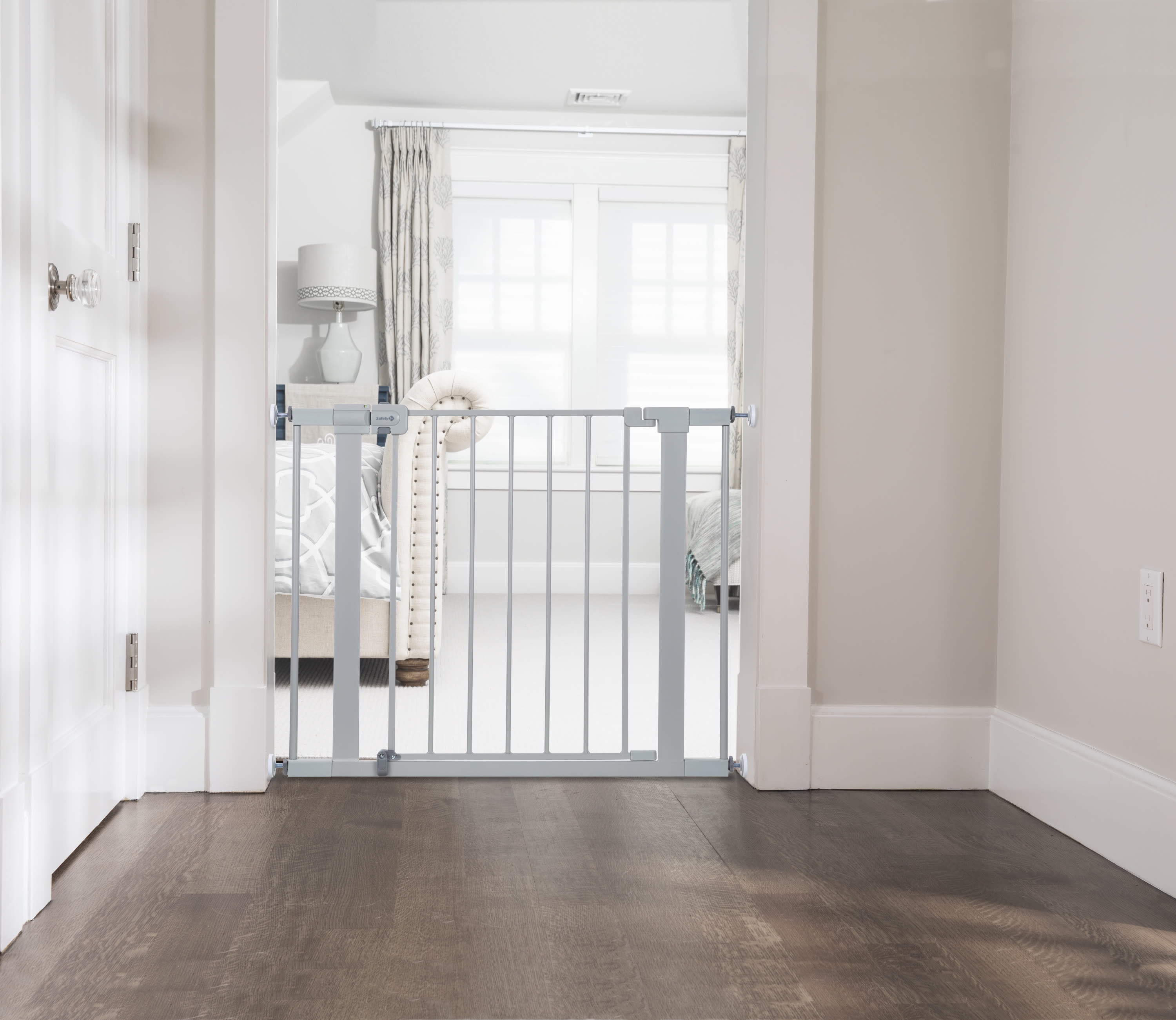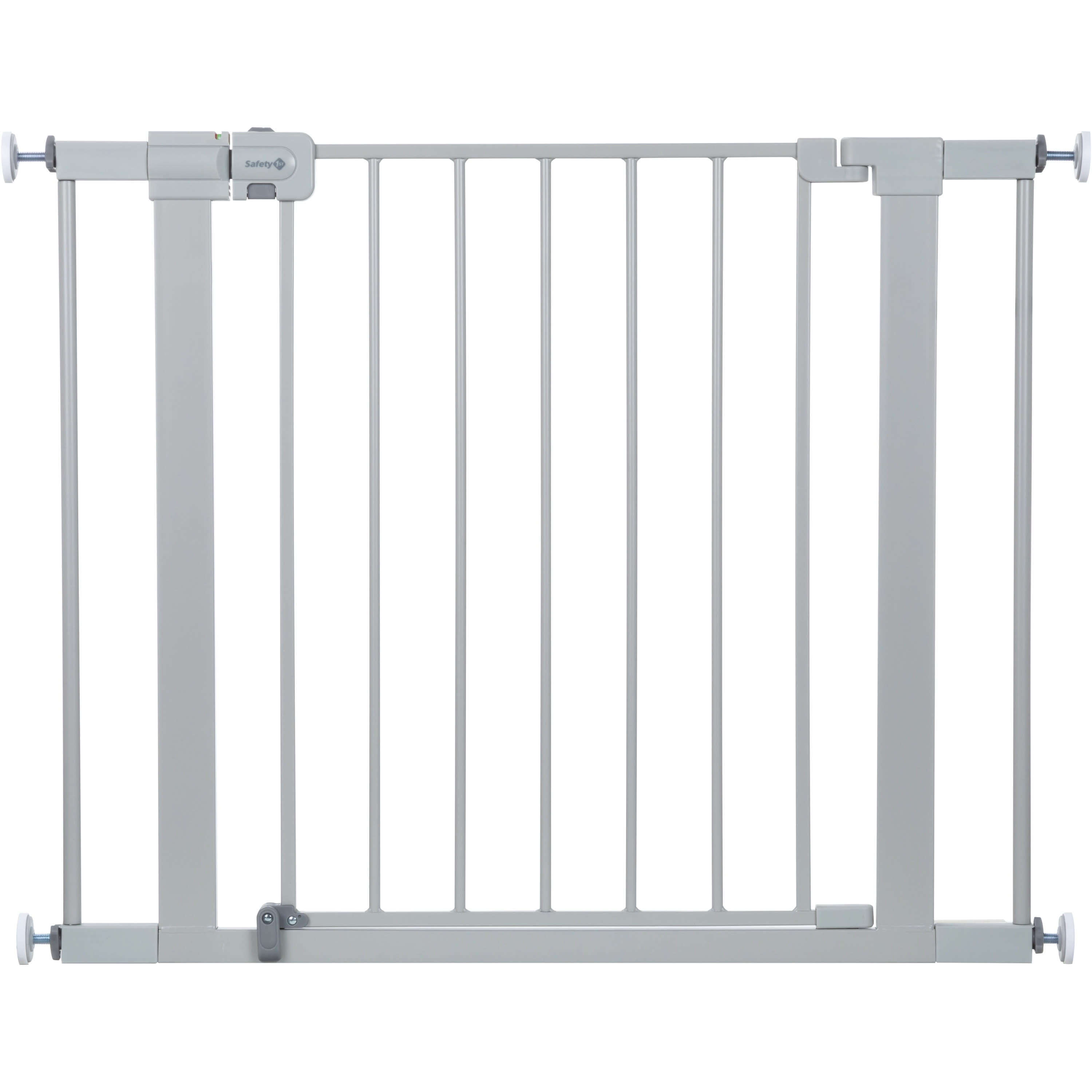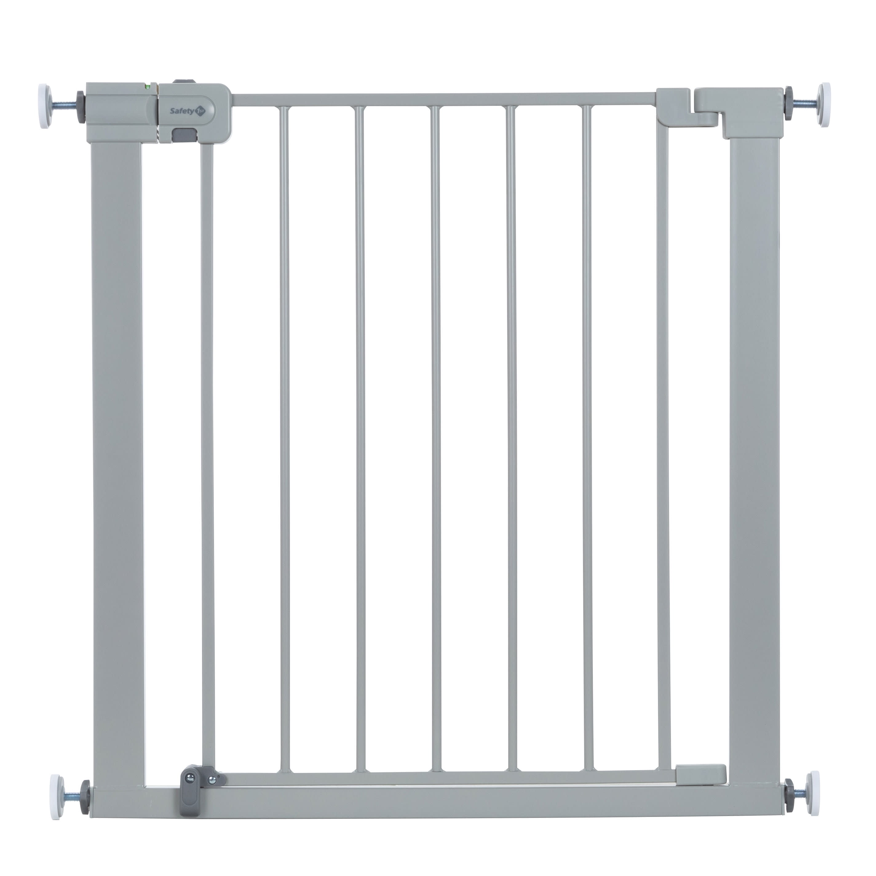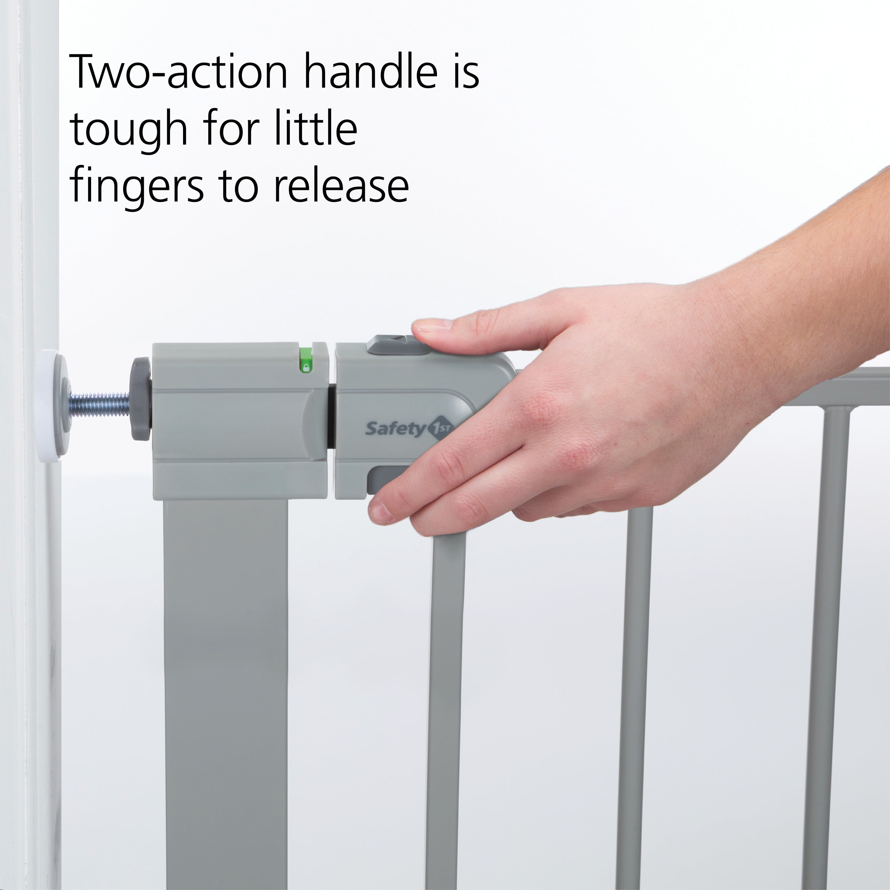 Safety 1st Simple Pass Walk-Through Gate, Grey Quick and easy install: Visual red indicator lets parent know gate is unlatched or unproperly pressurized Pressure-installed gate is quick to set up and easy to take down when not in use The two-action handle is tough for little fingers to release Fits most doorways and works between rooms or at the bottom of the stairs TO PREVENT FALLS, NEVER use pressure-installed gate at top of stairs Includes four wall cups. Must install with wall cups to keep gate in place Adjustability in width: 29″ to 32″ with main gate; up to 35″ with one extension (included); up to 38″ with two extensions (included) 28″ high JPMA certified and meets CPSC requirements Perfect for children 6-24 months and great for pets too 28″ high