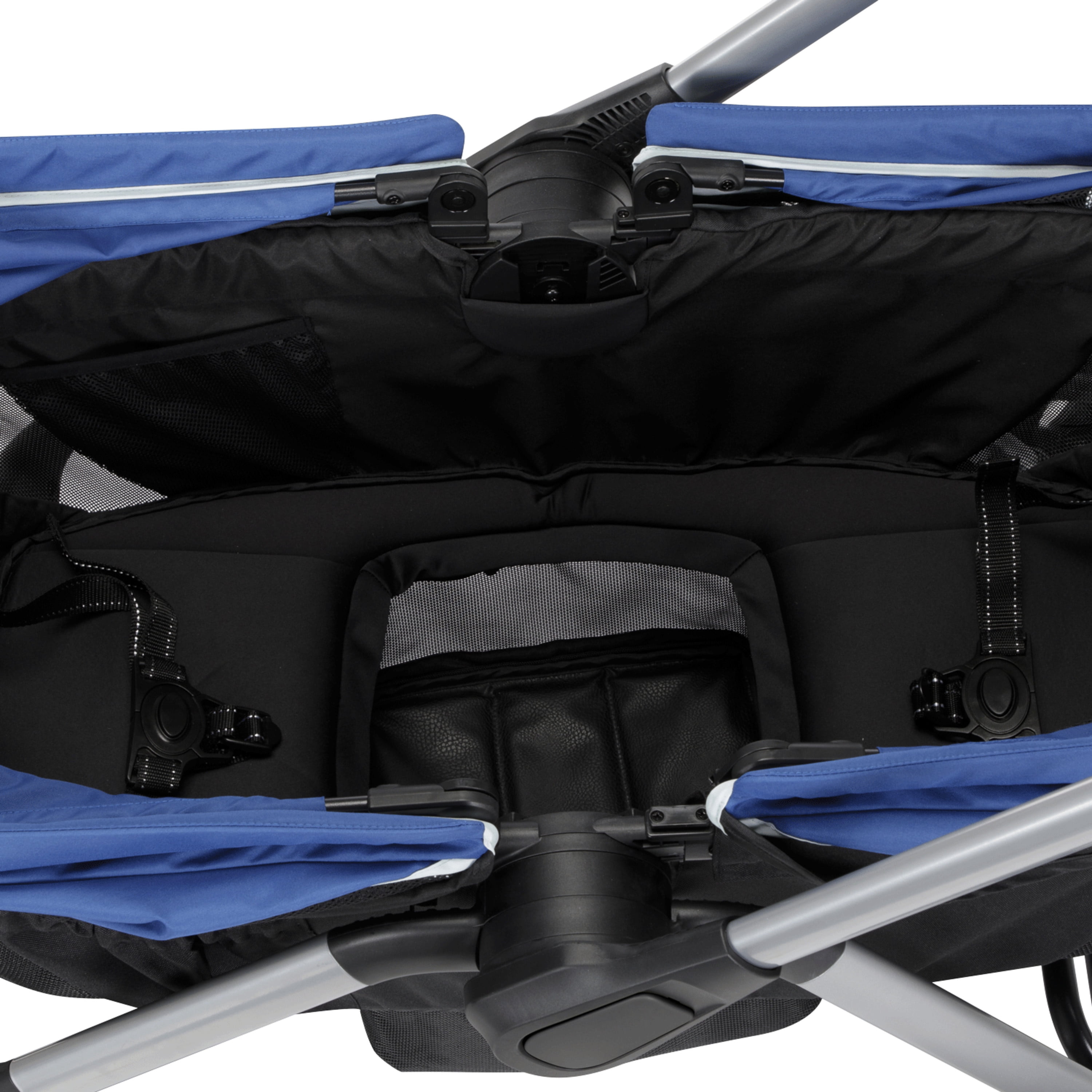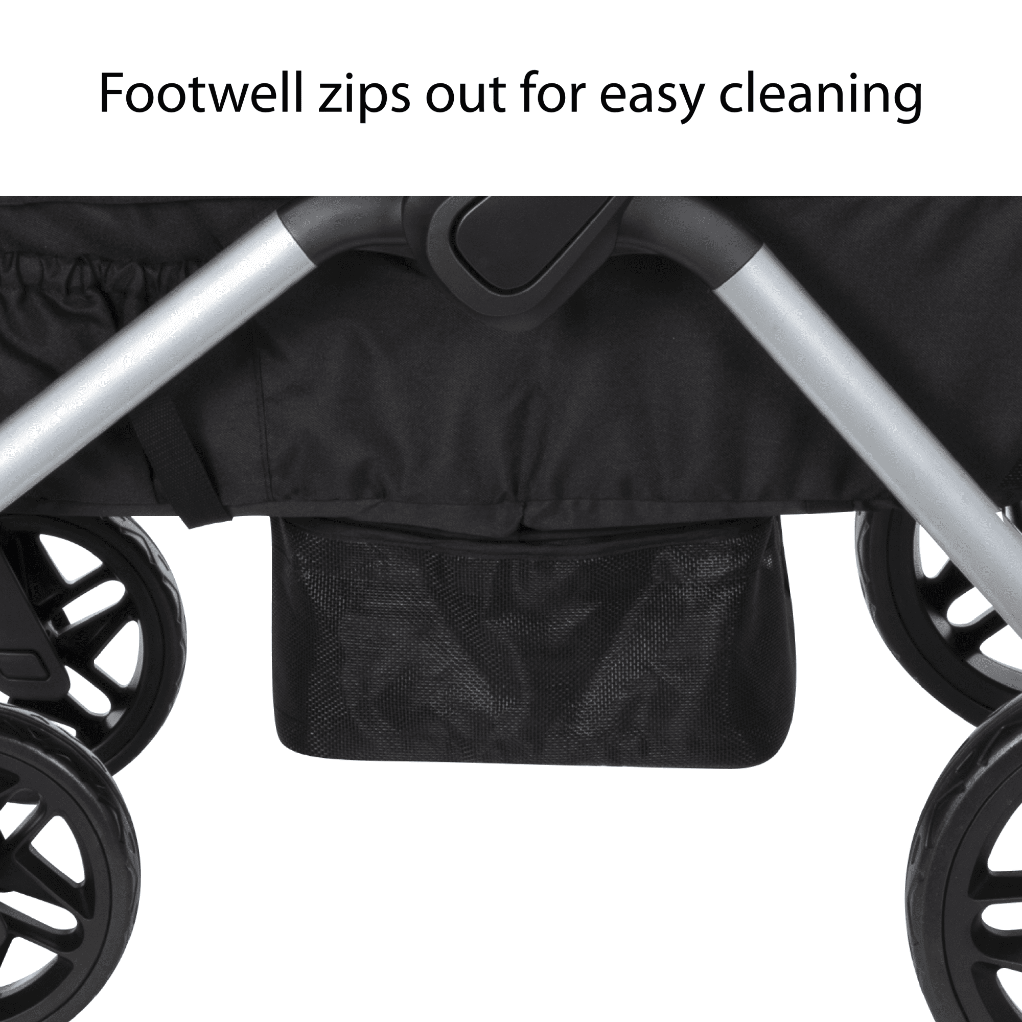 Includes adapters compatible with most Safety 1st® and Cosco® infant seats (infant seat not included) Dual water-repellent, vented canopies with full 50+ UPF sun protection Telescoping, reversible handle Footwell zips out for easy cleaning Detachable storage basket can be used on either end Removable, dishwasher-safe child tray with 2 cup holders Removable parent storage bag becomes a wristlet All-terrain wheels with rear suspension and linked braking system Unisex