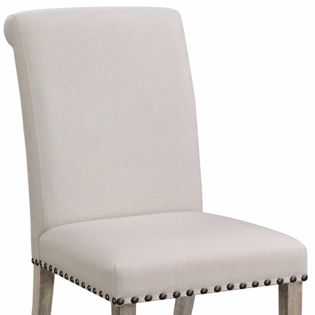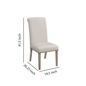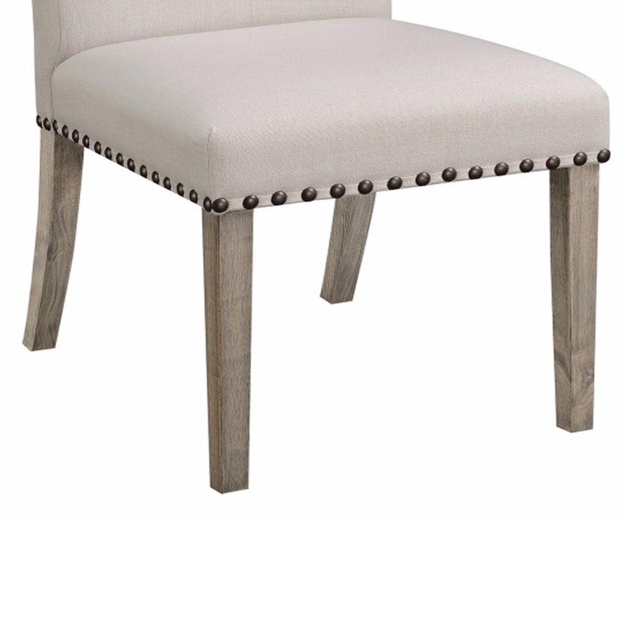 Rolled Back Parson Dining Chair, Beige, Set of 2- Saltoro Sherpi Create A Modern Vintage Look In Your Home With These Beautiful Rolled Back Dining Chairs. Its Neat And Simple Structural Design Is Complemented By The Classy Choice Of Color Used, Which Makes These Chairs Highly Compatible With Most Decor Styles. The Frame Is Made From Wood, Which Makes These Chair Highly Durable And Extremely Stable. These Chair Is Crafted With A Wooden Frame And Upholstered In A Beige Fabric, With Rustic Pine Finish Legs And Decorative Nail Heads. The Rolled Back Is Constructed Of High Density Foam For Comfortable Seating. These Chairs Has Enough Character To Warm Up Your Room And Will Effortlessly Become The Eye Catching Focal Point Of Your Dining Area