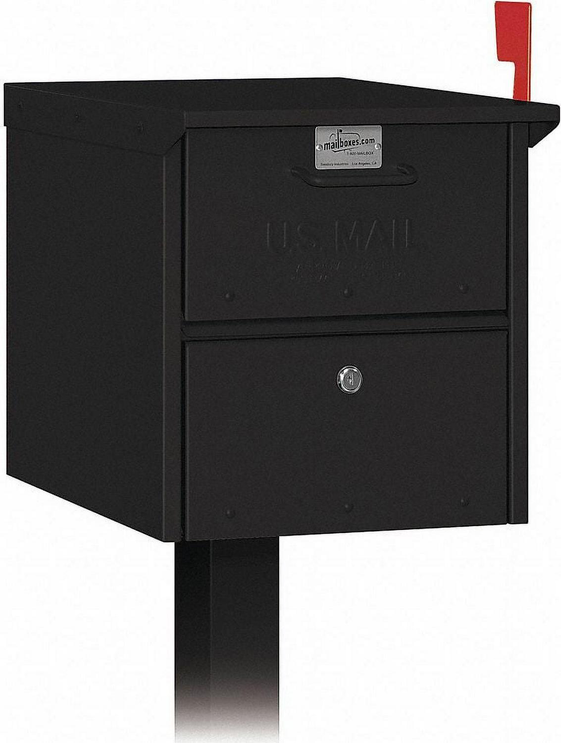 Mail Chest, Aluminum, Number of Doors 1, Color Black, Height 13-5/8 In., Depth 18-1/4 In., Width 12-1/2 In., Box Material Aluminum, Loading Front, Mounting Pedestal, Orientation Square, Slot Capacity 10 In. W x 1-3/4 In. H, Door Material Aluminum, Finish Powder Coated, For e With Mfr. No. 4315BLK, 4365BLK, 4385BLK, 4370BLK, 4372BLK, 4373BLK, 4374BLK, 4382BLK, 4383BLK, 4384BLK, Net Weight 25 lb., Standards ISO 9001: 2008, Includes Locks,(2) KeysFeaturesStandards: ISO 9001: 2008Height: 13 5/8 inNet Weight: 25 lbType: AluminumOrientation: SquareFor e With: Mfr. No. 4315BLK, 4365BLK, 4385BLK, 4370BLK, 4372BLK, 4373BLK, 4374BLK, 4382BLK, 4383BLK, 4384BLKBox Material: AluminumItem: Roadside MailboxFinish: Powder CoatedDepth: 18 1/4 inColor: BlackNumber of Doors: 1Includes: Locks and Reg FlagSlot Capacity: 10 in W x 1-3/4 in HWidth: 12 1/2 inMounting: PedestalLoading: FrontDoor Material: Aluminum