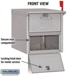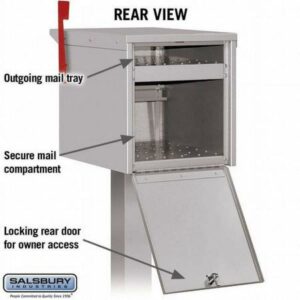 - Mail is deposited through a non-locking access panel on the front and includes an outgoing mail tray
