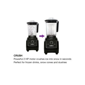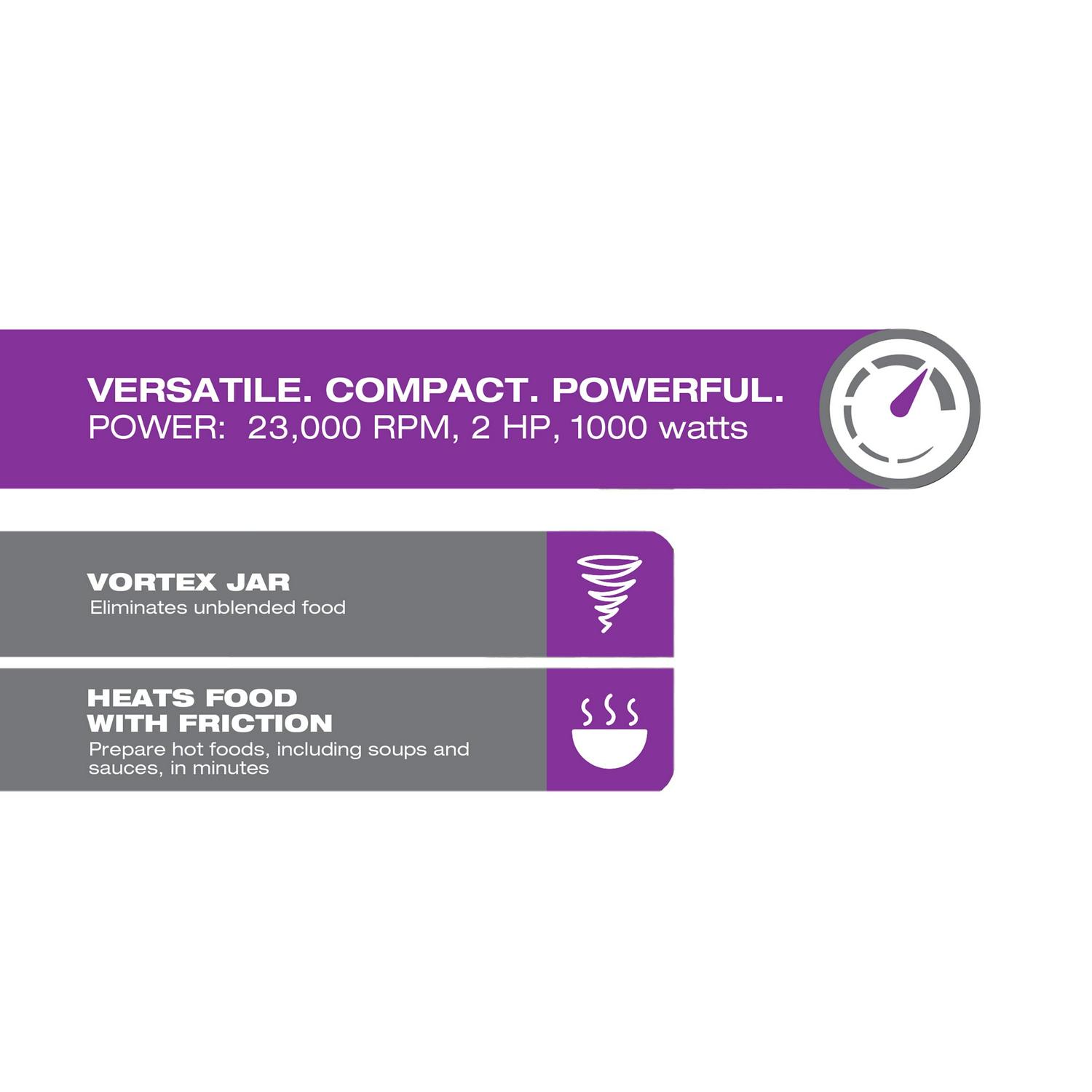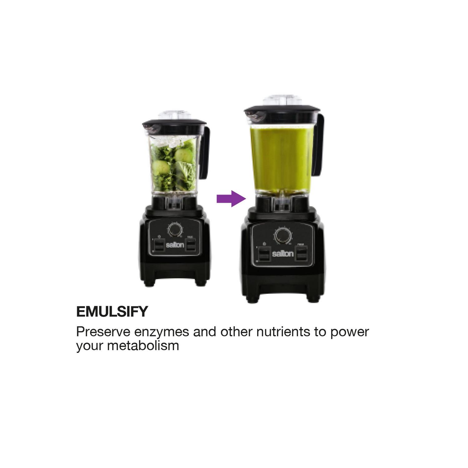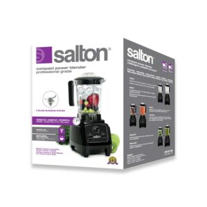 The Salton Compact Power Blender has a Vortex Jar with 8 stainless steel, Japanese blades and a 2HP, 23,000RPM, 1000 watt motor. With its powerful motor and innovative design it can blend, emulsify, chop, puree, crush and even make a hot soup! It also comes with a recipe book loaded with delicious, healthy recipes and two on-the-go bottles so you ll never leave your smoothie behind.