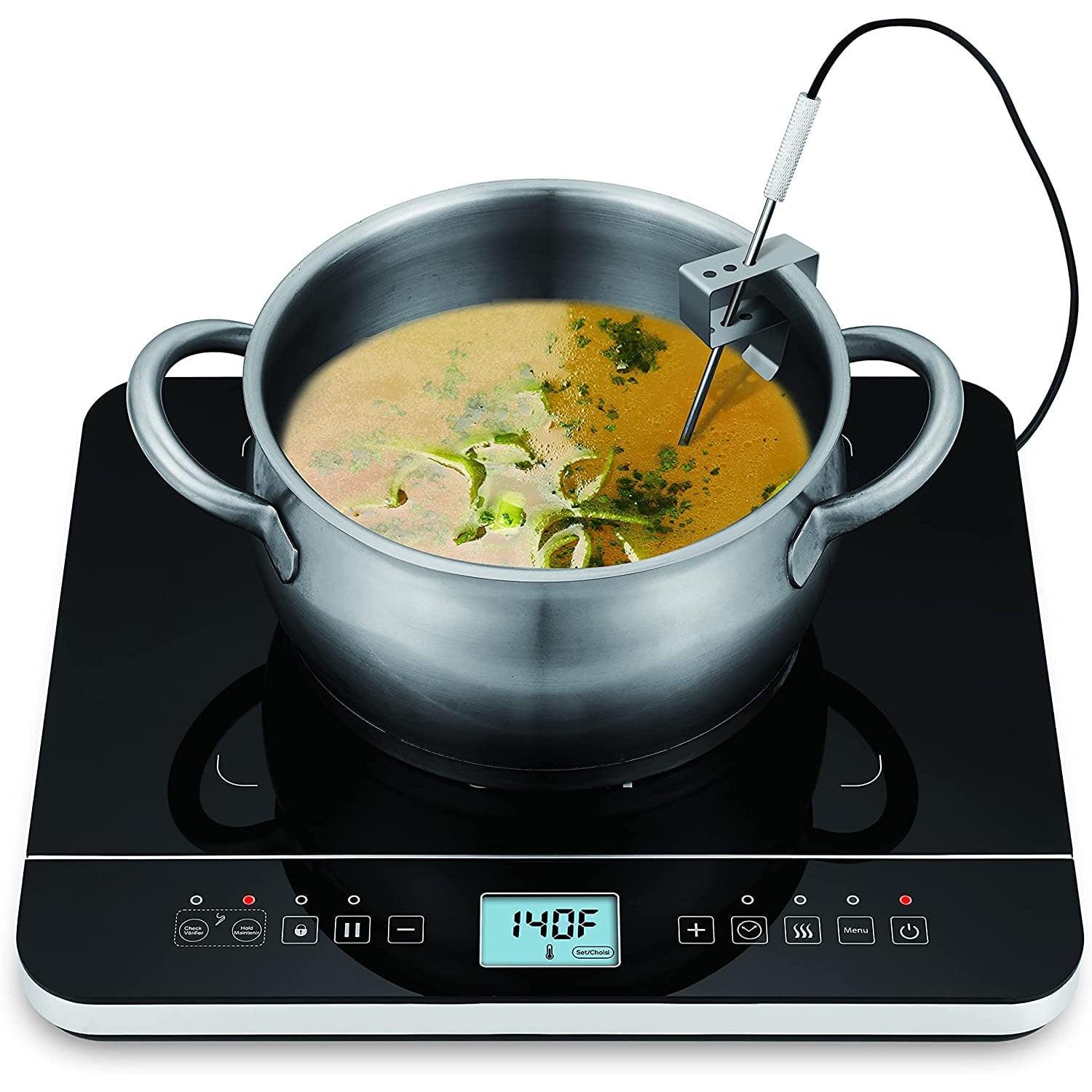 Salton Induction Cooktop with Temperature Probe The Salton Induction Cooktop and Temperature Probe work together to deliver automatic precision cooking for sous vide, deep frying, and slow cooking in one simple and sleek gourmet appliance. Whether you are new to the kitchen or a seasoned chef, this product will help you create flawless and repeatable dishes. The 10 temperature settings from 60°C to 240°C (140°F to 465°F) and 1500 watts provide the power to melt butter, steam, sear, stir-fry and boil. Boasting a solid crystal glass top, count down timer and easy to clean touch sensitive controls, this deluxe Induction Cooktop is perfect for everyday use.