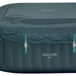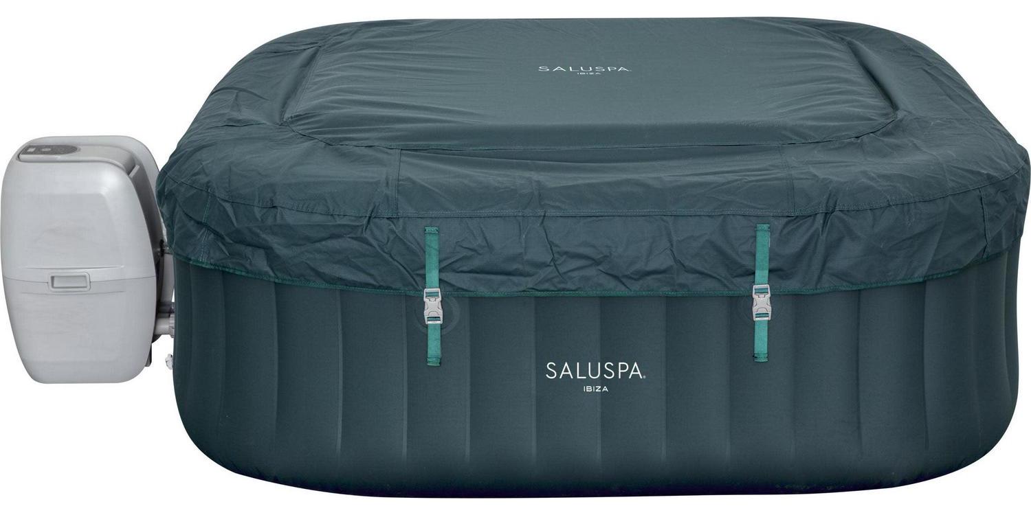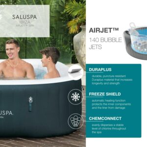 After a long day, there s nothing more relaxing than sinking into warm, bubbling water right in your own backyard. The SaluSpa Ibiza AirJet provides a soothing massage experience for up to 6 people, while still being quick and easy to set up. Simply attach the pump and watch as it inflates. Soothing Massage System: The AirJet system features 140 jets which release bubbles from the bottom of the spa to create a warm, bubbling hot tub environment. These soothing bubbles will help you relax and unwind right from the comfort of your home. Durable Construction: This spa s inflatable walls are made of durable, puncture-resistant, DuraPlus material to prevent damage and to retain its shape no matter how many times it is inflated and deflated. The included Freeze Shield automatic heating function prevents inner components from freezing during colder temperatures ensuring you can enjoy your spa year after year. Contents: Equipped with a pump that quickly inflates the spa, heats it up, runs filtration and controls the massage system, this spa is both easy and convenient. The pump can easily be reached from inside the spa and features cup holders for drinks and snacks. Also included is a ChemConnect dispenser that maintains clean, healthy water by evenly dispersing the proper amount of chlorine. To top it all off, the Ibiza spa comes with a reinforced cover that locks in heat while not in use, as well as keeping dust and debris from collecting on the water.