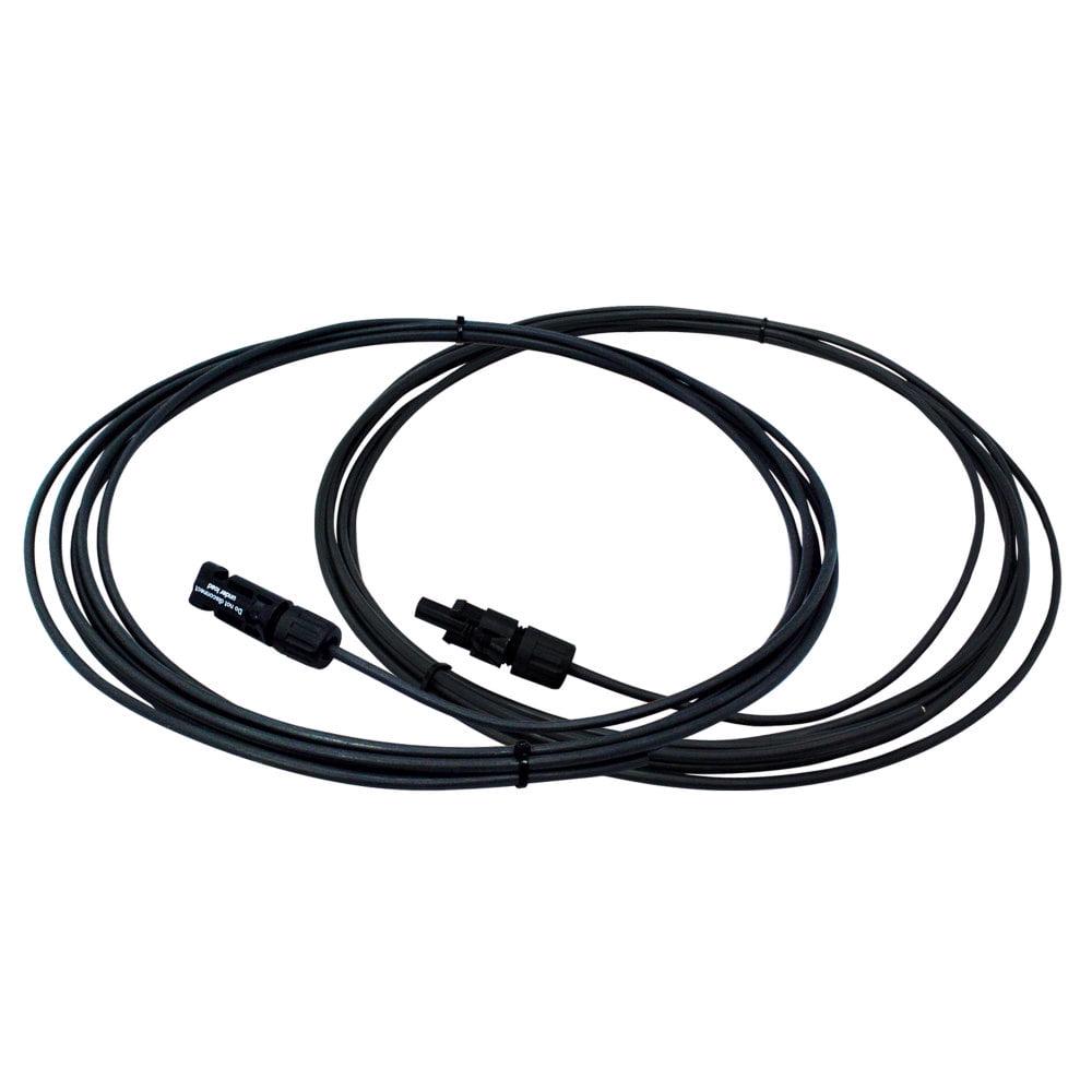 The SCW-20-2 Solar Panel Connecting Wire Kit contains (2) 20 ft wires pre-assembled with a male and female MC4 connector on one end of each; the other end is blunt. These wires are used to connect the output of the solar panel to the various components of a solar installation. The wire is Size AWG #12, insulation rating 600V. It is sunlight resistant, photovoltaic wire, UL listed.