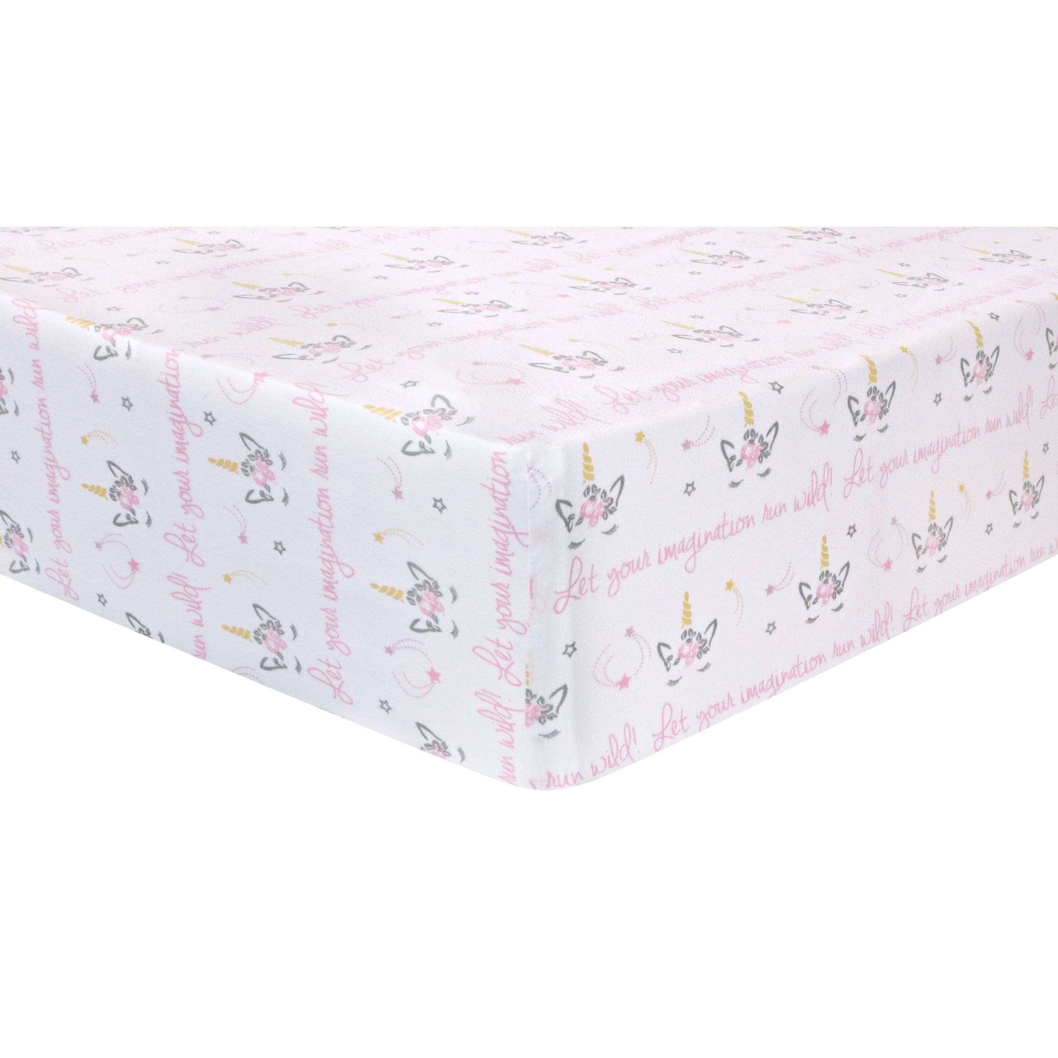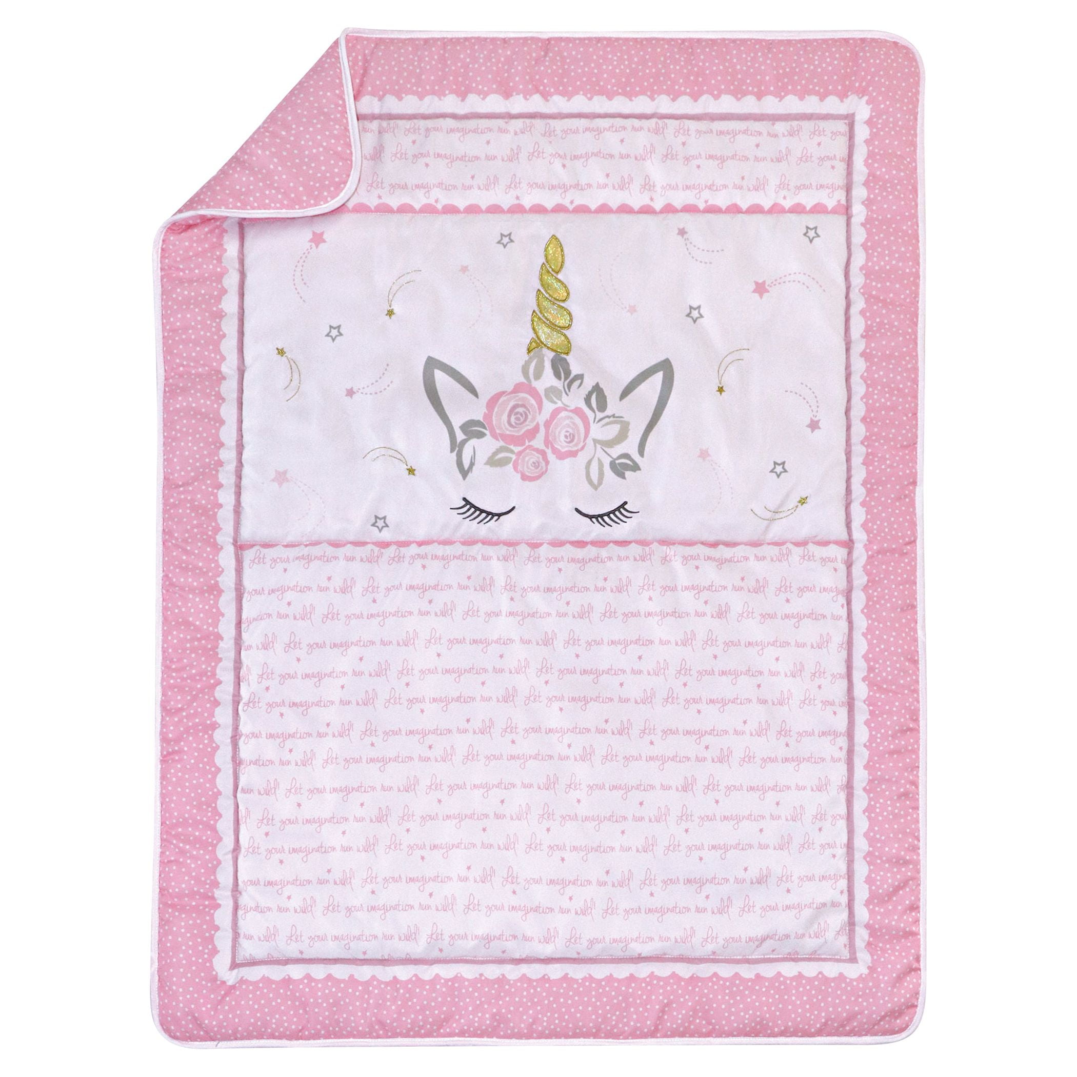 Create a magical nursery for your little unicorn with the Mystical Dreams collection. The silhouette of a sleepy unicorn face is adorned with flowers and accented with shooting stars in a sweet color palette of tonal pinks, grays and gold. “Let your imagination run wild!” is the script print, and mini dot prints add the final touch. Set includes: Quilt, Crib Skirt, Fitted Crib Sheet and Plush Unicorn Toy. Reversible Quilt measures 35 in x 45 in and features a sleepy unicorn face silhouette with a flower crown and iridescent applique and embroidery accents. Patterns include shooting stars, mini dots and “Let your imagination run wild!” script with scalloped edging. Fitted Crib Sheet features a mystical dreams scatter print with a coordinating sleepy unicorn face silhouette with shooting stars and “Let your imagination run wild!” Crib sheet fits a standard 28 in x 52 in crib mattress and features 8-inch deep pockets with elastic surrounding the entire opening ensuring a more secure fit. Flat Panel Crib Skirt with 14-inch drop features a light pink and white mini dot print with a scalloped stripe. Unicorn Toy is made of soft white plush with sleepy eyelashes, a gold horn, pink mane and tail. Measures 9 inches tall. Please adhere to JPMA’s Safe Infant Bedding Practices.