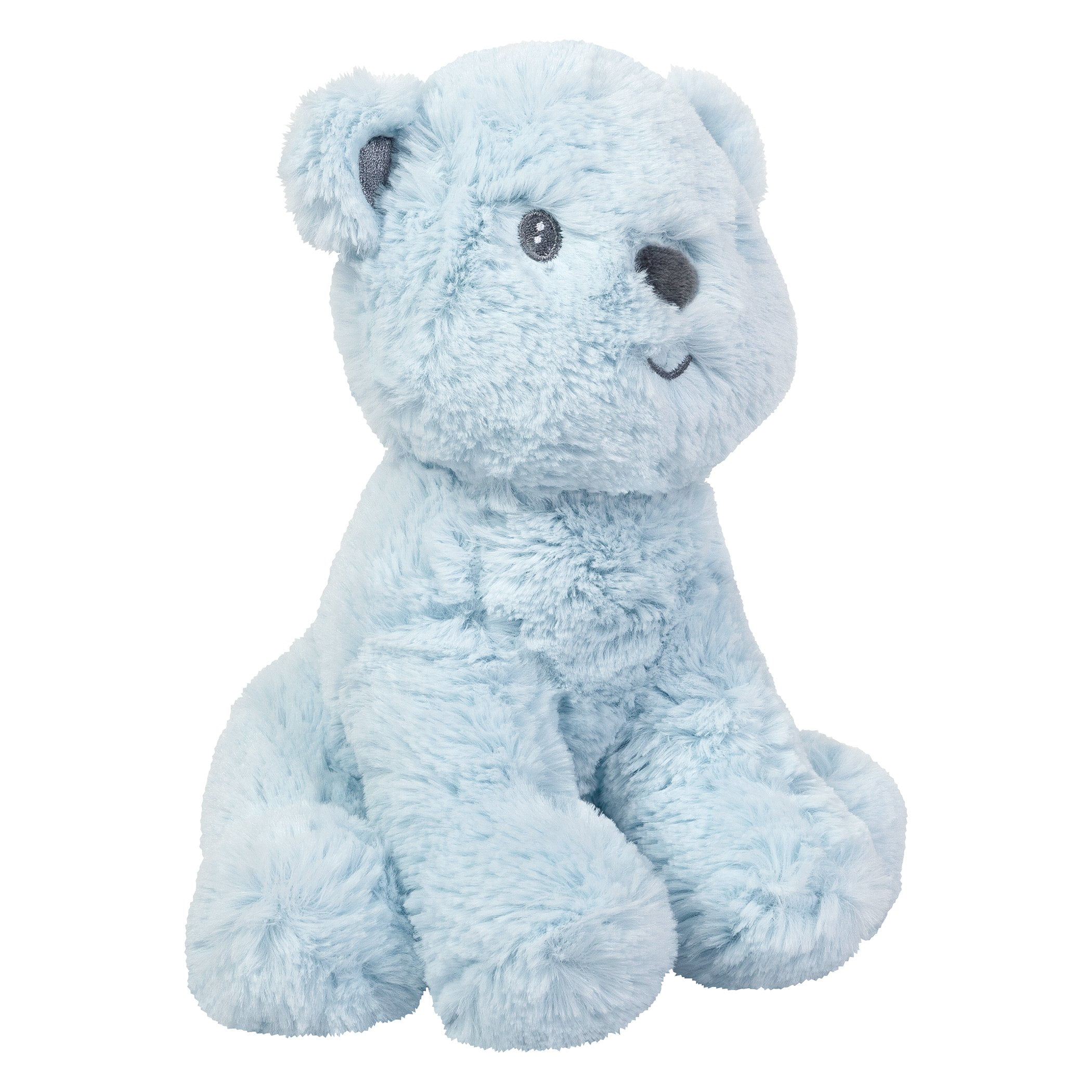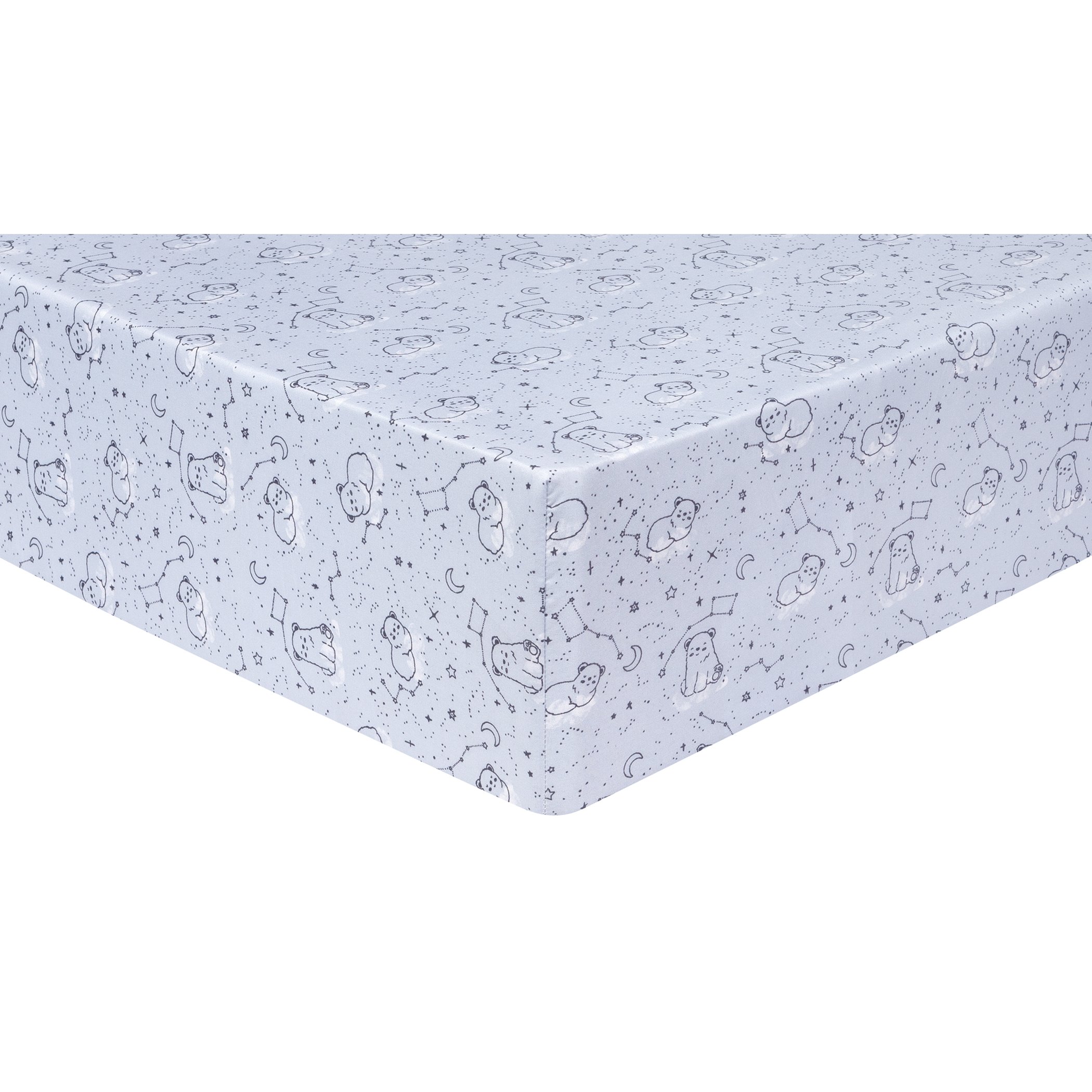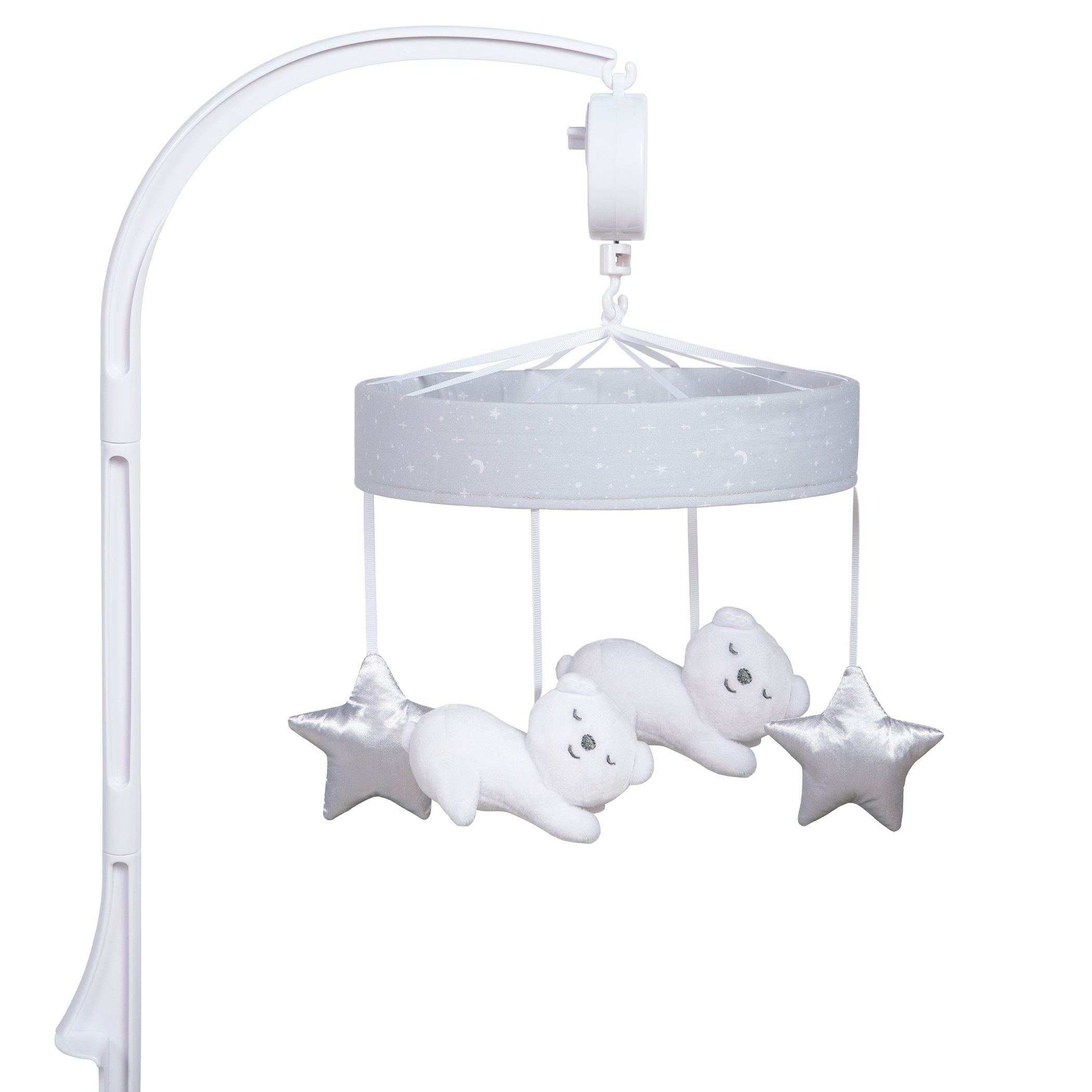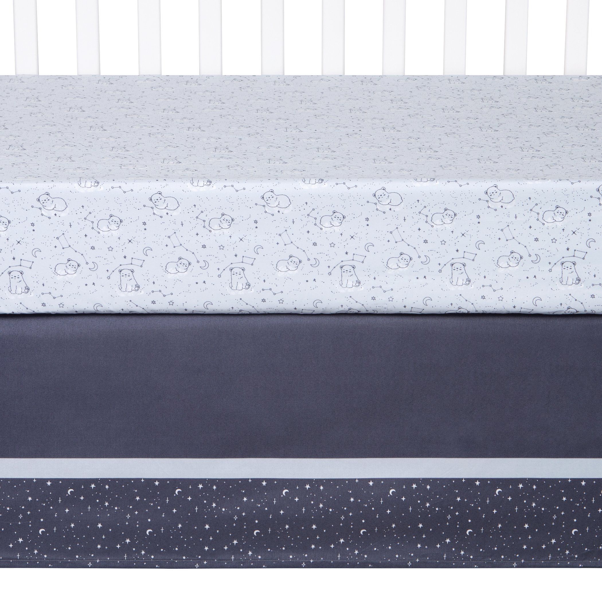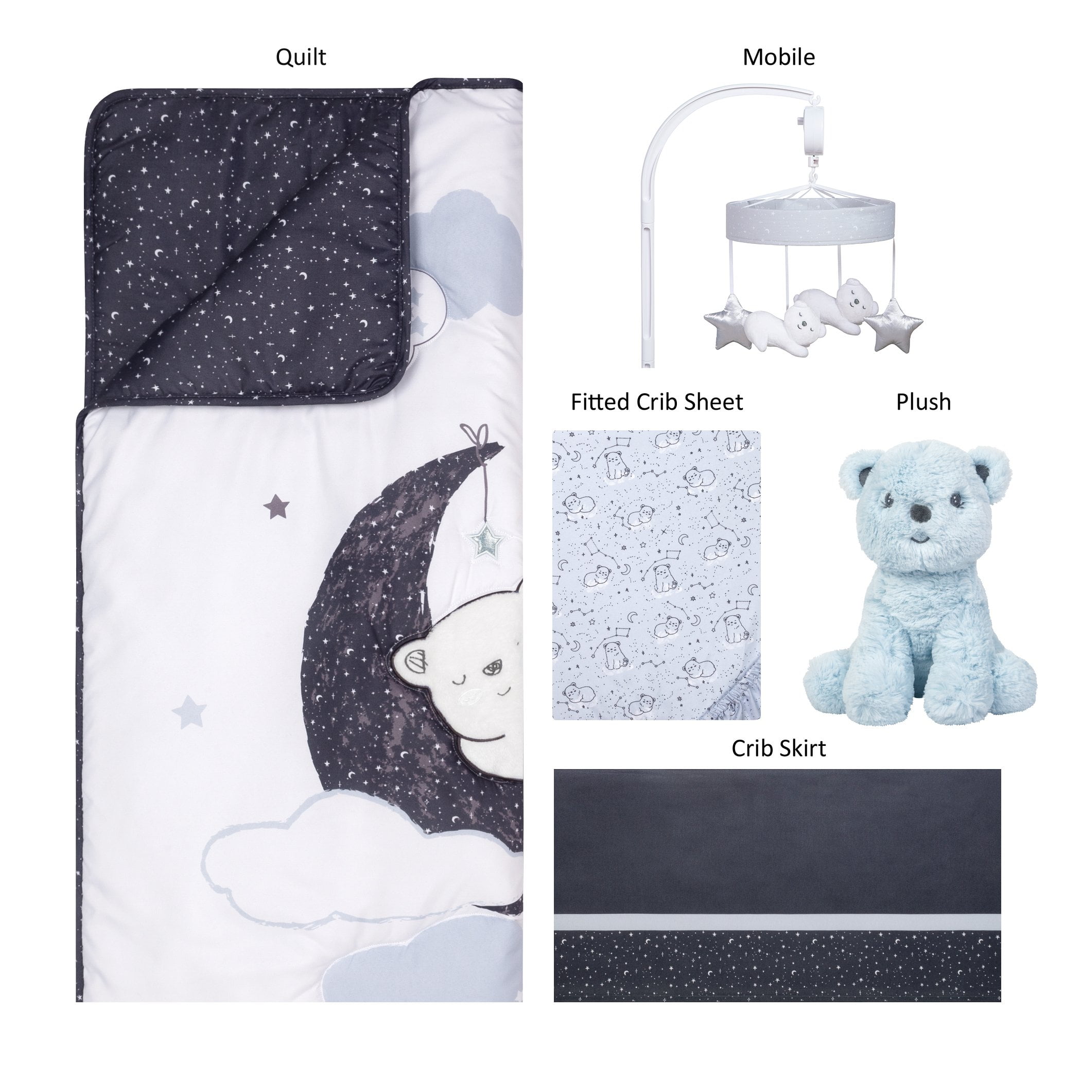 Nursery Quilt measures 35 in x 45 in, Filling 100% Polyester Fitted Crib Sheet fits a standard crib mattress 28 in x 52 in with 8 inch deep pockets and is fully elasticized Crib skirt fits standard crib mattress 28 in x 52 in with 14 inch drop Bear Toy is made of soft plush fabric in light blue and measures 9 inches tall Musical Mobile features two white plush bears and two satin stars and slowly rotates to Brahms’ Lullaby – assembled dimensions 15 in x 24 in x 10 in