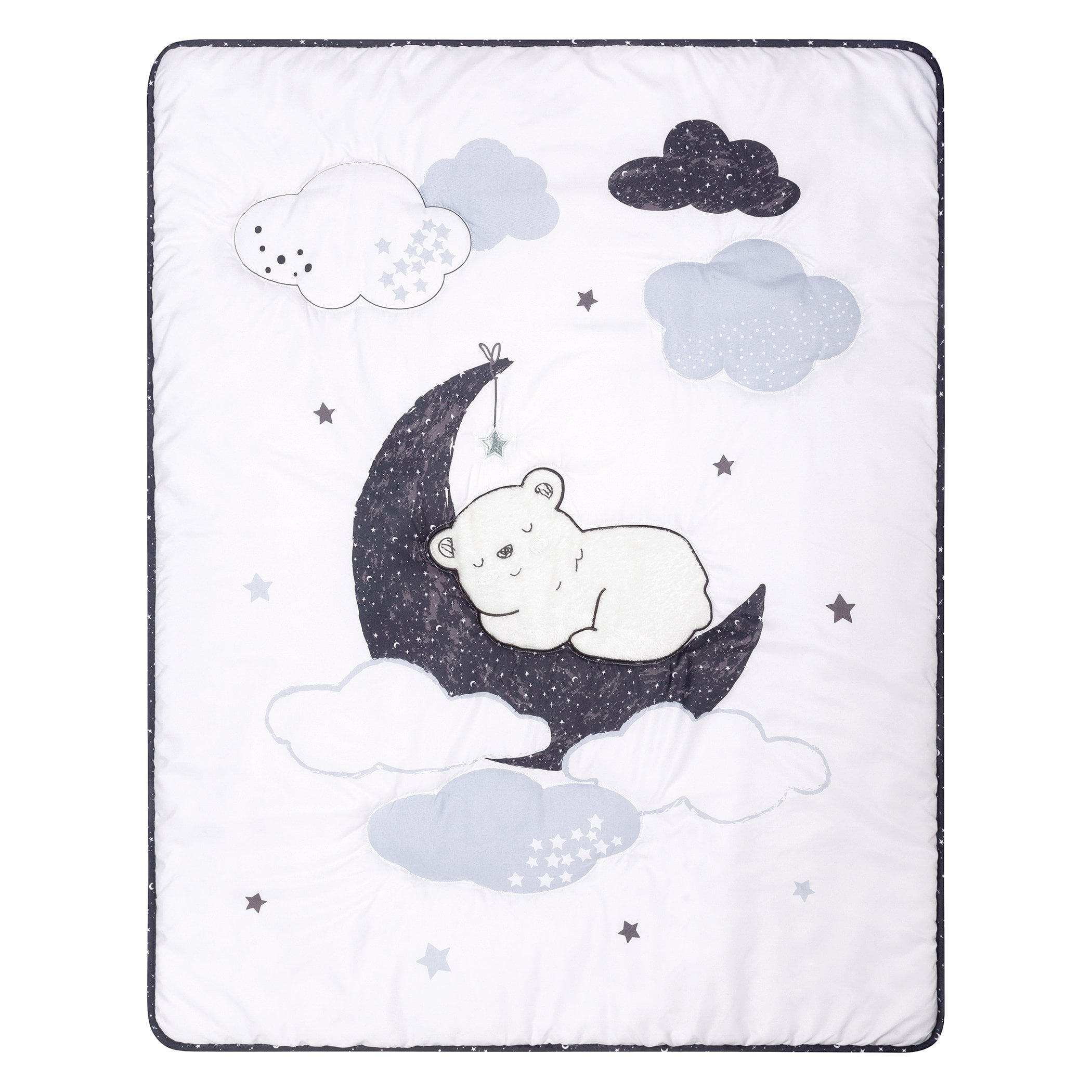 Let your little one drift off to sleep in a bed of clouds with the Bearly Dreaming 5 Piece Crib Bedding Collection by Sammy & Lou. An adorable fuzzy bear rests on the moon among clouds and stars in a lovely color palette of navy, light blue, grays and white. The perfect collection for your little dreamer! 5 Piece Crib Bedding Set includes: Quilt, Skirt, Fitted Crib Sheet, Musical Crib Mobile and Plush Toy. Please adhere to JPMA’s Safe Infant Bedding Practices.