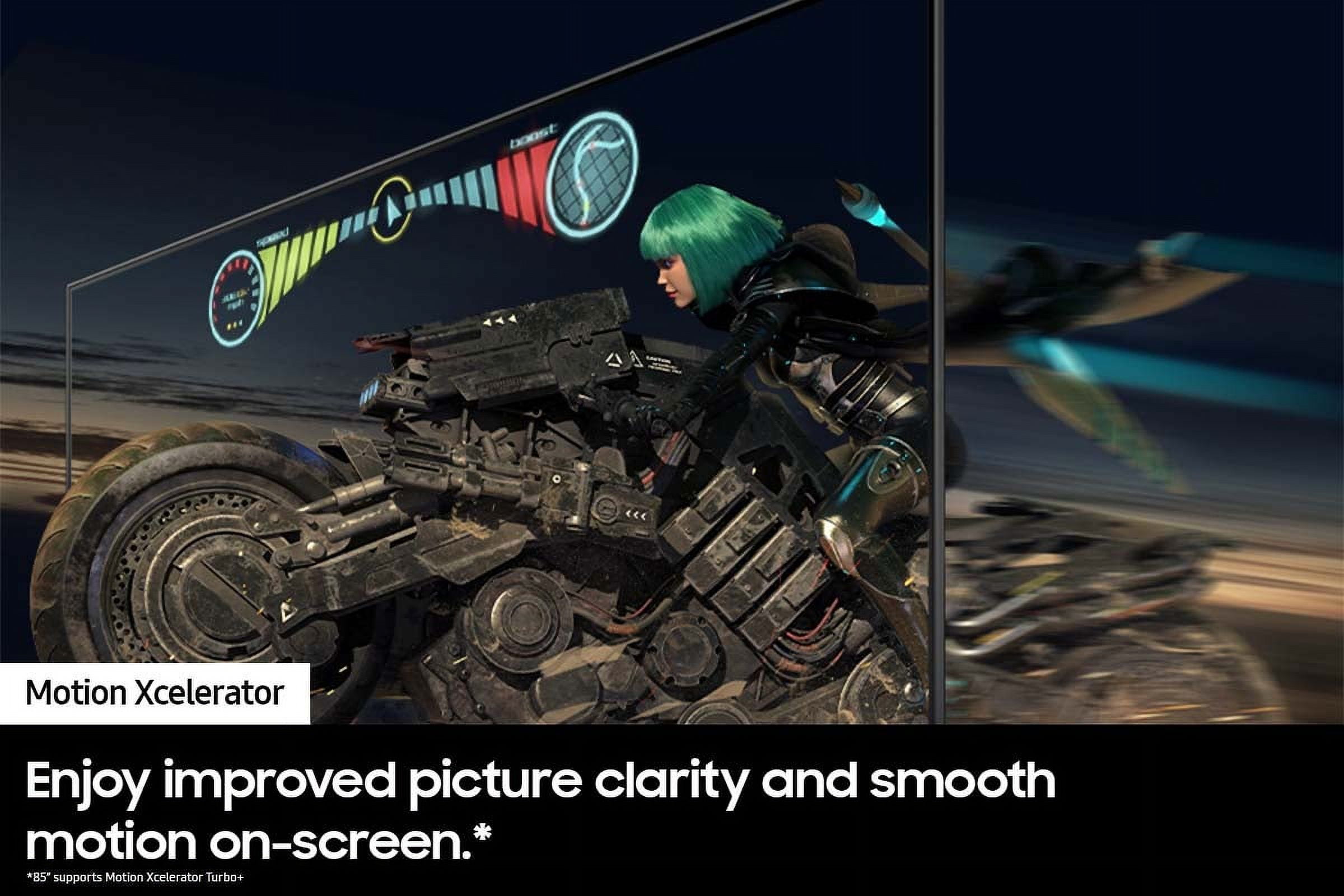 Samsung Gaming Hub – Widen your world of gaming instantly without a console. Gaming Hub is where gaming comes together–bringing the best of console games, streaming games and more–all in one place. With easier access to your favorite games, standalone apps and accessories – start playing faster than ever. *Content services may vary by regions and are subject to change without notifications. Built-in Voice Assistant – Just speak up—your favorite Voice Assistant is ready to help. Voice Assistants are built into your Samsung TV. Simply use your voice to find the content you love, control your connected home and more. SolarCell Remote™ – Turn up the volume on sustainability with the innovative SolarCell Remote™. It features a solar panel for charging, as well as other smart features including a built-in microphone to use with your favorite voice assistant. Dynamic Crystal Color – Every subtle variation becomes clear with Dynamic Crystal Color. From classic movies to buzz-worthy TV shows, you’ll see the benefits of color temperature optimization with backlight and color filter calibration. Crystal Processor with 4K Upscaling – Watch the content you love upgraded to dazzling 4K resolution. You’ll be able to better enjoy your TV’s capabilities as the Crystal Processor automatically transforms color, sound and more. Even if the content you’re watching wasn’t produced in 4K, you can enjoy it like it was. AirSlim Design – It’s the perfect fit for any room with a streamlined profile that sets it apart from the competition. It’s the perfect fit for any room with a streamlined profile that sets it apart from the competition. Q-Symphony – Amp up your audio with the greatest duo of all time—Samsung TVs paired with a Samsung soundbar. With Q-Symphony, your TV speakers paired with QSeries and S-Series soundbar operate as one. Together, they can optimize all the channels to bring you a masterfully orchestrated sound experience. *Soundbar sold separately. Motion Xcelerator – Now you can fuel your need for speed with high-intensity sports, movies and games, and enjoy crisp and clear details at the same time. The picture onscreen moves smoothly as motion performance features make automatic adjustments so you don’t miss a thing. Mega Contrast HDR – Every frame appears more natural and a feeling of depth is added as contrast is dialed up in the foreground. Incredible details are revealed, drawing your eyes to the most important parts of whatever you’re watching. Object Tracking Sound Lite – Get in the mix with Object Tracking Sound Lite. You’ll hear 3D surround sound that follows the movement on screen using our incredible virtual top channel audio.