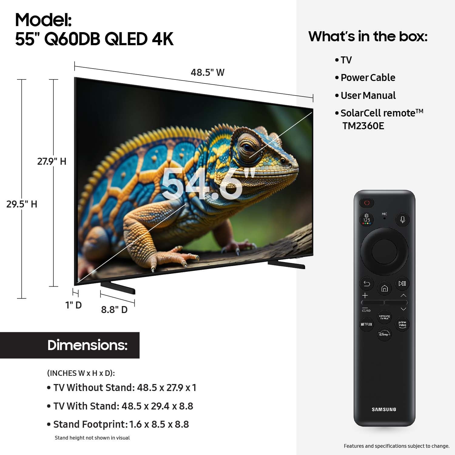 Dual LED-Get a natural, realistic picture and accurate contrast that adapts automatically to match your content with our innovative backlight technology. 100% Color Volume with Quantum Dot-Take in breathtaking color that stays true at any level of brightness. Marvel as your TV transforms light into over a billion beautiful shades.¹ Quantum Processor Lite with 4K Upscaling-Automatically transform your content into 4K and improve your sound. Our processor enhances each pixel, regardless of the source so you get great visuals and audio. Supreme UHD Dimming-See your picture in the right light with Supreme UHD Dimming. With less halo effect and image distortion, enjoy your content on a vivid screen. Motion Xcelerator-Watch your content smoothly while experiencing less lag and blur. It improves motion between frames so you have a seamless picture. Quantum HDR-View a range of color, contrast and detail. You’ll get beautifully optimized imagery no matter what you’re watching. AirSlim-This TV blends right into your wall with a slim design. It brings clutter free minimalism to the room without distracting you from what you watch. Samsung Tizen OS-Stream your favorite shows. Follow recipes. Play games. Work out with a trainer. Do all you enjoy with Smart TV Powered by Tizen. In just a few clicks, get instant access to your must have apps and endless content from the streaming services you love. And with Voice Assistants built into your TV, it’s easy to get to it all with just the sound of your voice.² PANTONE Validated-Enjoy color validated by industry leading experts at Pantone®, so that images on the screen look as incredible as they do in real life. Every hue, tint and skin tone offers a more accurate and beautiful picture. Gaming Hub-Widen your world of gaming instantly without a console. Gaming Hub is where gaming comes together bringing the best of console games, streaming games and more all in one place. With easier access to your favorite games, standalone apps and accessories, start playing faster than ever. Plus, get recommendations for other games, adjust settings to optimize gameplay and more.³ ¹QLED televisions can produce 100% Color Volume in the DCI P3 color space, the format for most cinema screens and HDR movies for television. ²Samsung Account required for network based smart services, including streaming apps and other smart features. Separate [connected] computer, mobile or other device may be necessary to create/log in to Samsung Account (free to download and create). Without Account log in, only external device connections (e.g., via HDMI) and terrestrial/over the air TV (only for TVs with tuners) available. ³High speed internet connection, additional gaming service subscriptions and compatible controller required. *Samsung Account required for network based smart services, including streaming apps and other smart features. Separate [connected] computer, mobile or other device may be necessary to create/log in to Samsung Account (free to download and create). Without Account log in, only external device connections (e.g., via HDMI) and terrestrial/over the air TV (only for TVs with tuners) available.