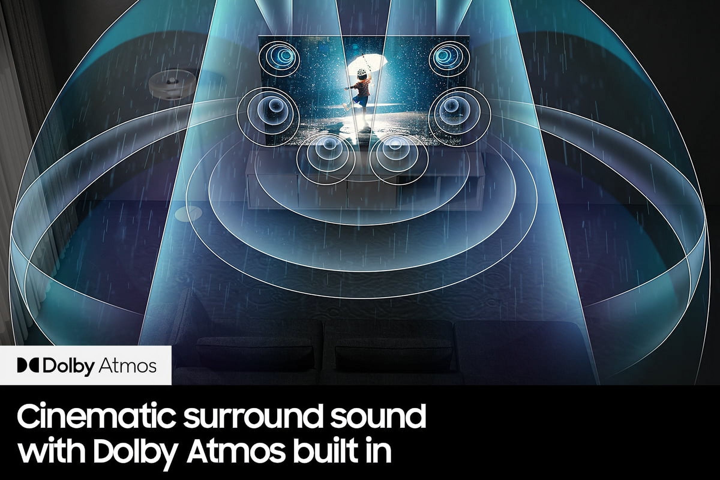 Delight in the dazzling details from bold contrast with this QLED 4K. Your picture is brought to life by the deep blacks and pure whites from the ultra-precise LED backlighting of Direct Full Array. No matter what you watch or how it was created, enjoy it upscaled to 4K in a wide range of Quantum HDR 12x colors. And with the cinematic surround sound of Dolby Atmos and Object Tracking Sound from dynamic speakers that follow every action, you’ll hear it where you see it.