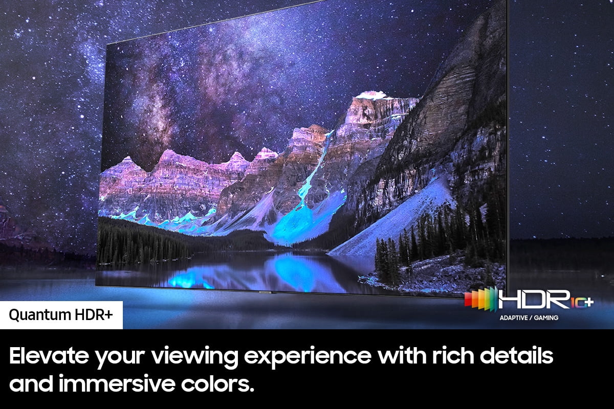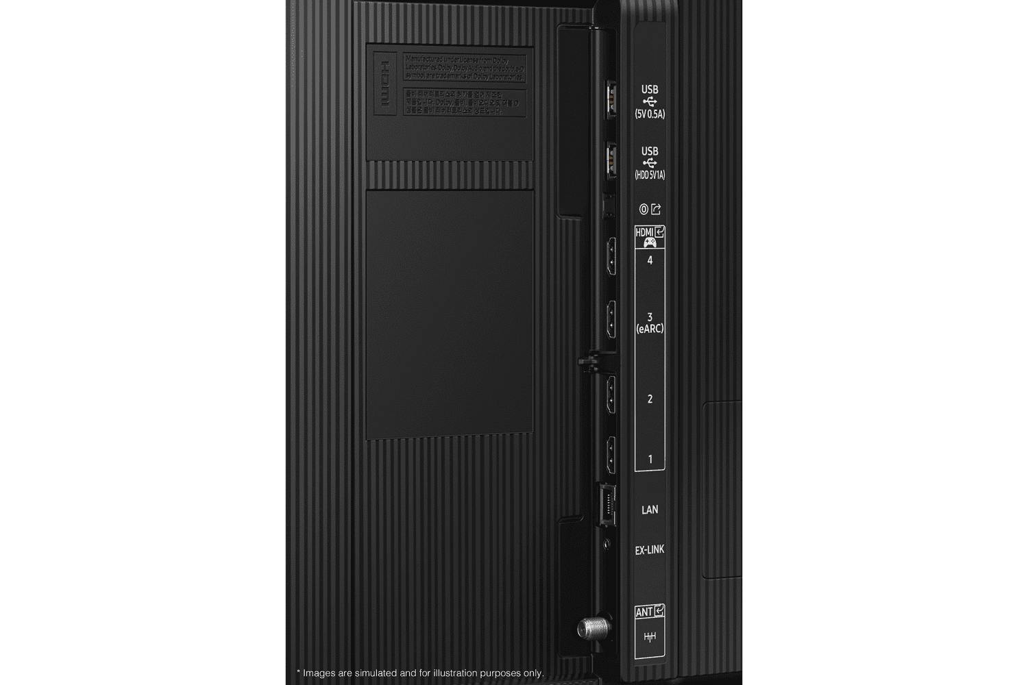 Direct Full Array – Super precise LEDs are the secret to this TV’s straight fire contrast. See incredible contrast even in sunlit rooms with our Direct Full Array technology that precisely controls the amount of lighting across every part of the picture. When you see, you know. Get caught up in the details as you experience the silver screen in a new way as the picture comes alive from your screen. Neural Quantum Processor with 4K Upscaling – Sit back and be mesmerized as your content is transformed to 4K. Whether you’re streaming an HD movie, watching live sports, or looking back at home videos, experience it all transformed into sharp 4K resolution with our high-performance, AI powered processor that upgrades your content scene by scene. Utilizing 20 specialized networks the AI-powered processor drives the intuitive Smart TV Hub, Dolby Atmos™ sound, and expertly upscaled 4K resolution. *Utilizes AI-based formulas Quantum HDR+ – Catching the latest releases on a big screen at home, instead of at the theater will feel even more like you are watching on the big screen with rich details and more immersive colors from the latest animated flick to the next new-world science fiction drama. Dial up the experience with Quantum HDR+ that analyzes and enhances each scene, delivering excellent brightness and a wide range of contrast. Dolby Atmos™ and Object Tracking Sound Lite – Get in the mix with Dolby Atmos and Object Tracking Sound Lite. You’ll hear 3D surround sound that follows the movement on screen using our incredible virtual top channel audio—putting you right in the middle of the car chase, stampede or party scene. 100% Color Volume with Quantum Dot* – Max out your experience with 100% Color Volume. Take in a billion shades of unwavering color and enjoy vivid, lifelike color at any brightness level as Quantum Dot technology works to create every shade you see on screen—because even a clear blue sky can contain thousands of different colors. *100% color volume measured to DCI-P3 standard, certified by VDE. Q-Symphony 3.0 – Amp up your audio with the greatest duo of all time—Samsung TVs paired with a Samsung soundbar. With Q-Symphony, your TV speakers paired with Q-Series and S-Series soundbar operate as one. Together, they can optimize all the channels to bring you a masterfully orchestrated sound experience. It’s a completely next-level experience that even works with Object Tracking Sound for an extra layer of depth. *Q-Series and S-Series soundbars sold separately. Motion Xcelerator Turbo+(4K @120 Hz) – Why go slow when you can play smooth—even during super-fast gaming content. Feel the thrill with smooth performance during even the fastest games and action scenes. Keep up with the supersonic speed and catch every thrilling frame without lag or motion blur. Instead, you’ll enjoy seamless action and sensational 4K visuals at speeds up to 120Hz. Built with gamers in mind, it also offers Game Motion Plus and HDMI 2.1. Samsung Gaming Hub – Widen your world of gaming instantly without a console. Gaming Hub is where gaming comes together–bringing the best of console games, streaming games, and more–all in one place. With easier access to your favorite games, standalone apps and accessories, start playing faster than ever. Plus, get recommendations for other games, adjust settings to optimize gameplay, and more. *High speed internet connection, additional gaming service subscriptions and compatible controller required. SolarCell Remote – Turn up the volume on sustainability with the innovative SolarCell Remote™. Featuring a solar panel for charging and a built-in microphone to use with your favorite voice assistant, this remote has all your bases covered with a range of smart features. It even has automatic detection for use with other compatible devices. ConnecTime – Crowd-watch your favorites with your favorites on your big screen. Easily make and receive video calls to and from your TV and spend time with your loved ones. It’s now easier to take video calls from connected devices by using a big screen platform. And no need to pause your conversation for that snack break – ConnecTime easily allows users to transition calls from their TV to a smaller devices. *Additional compatible Samsung SlimFit cam, compatible Logitech webcam or mobile camera required. Sold separately. Requires Samsung account.