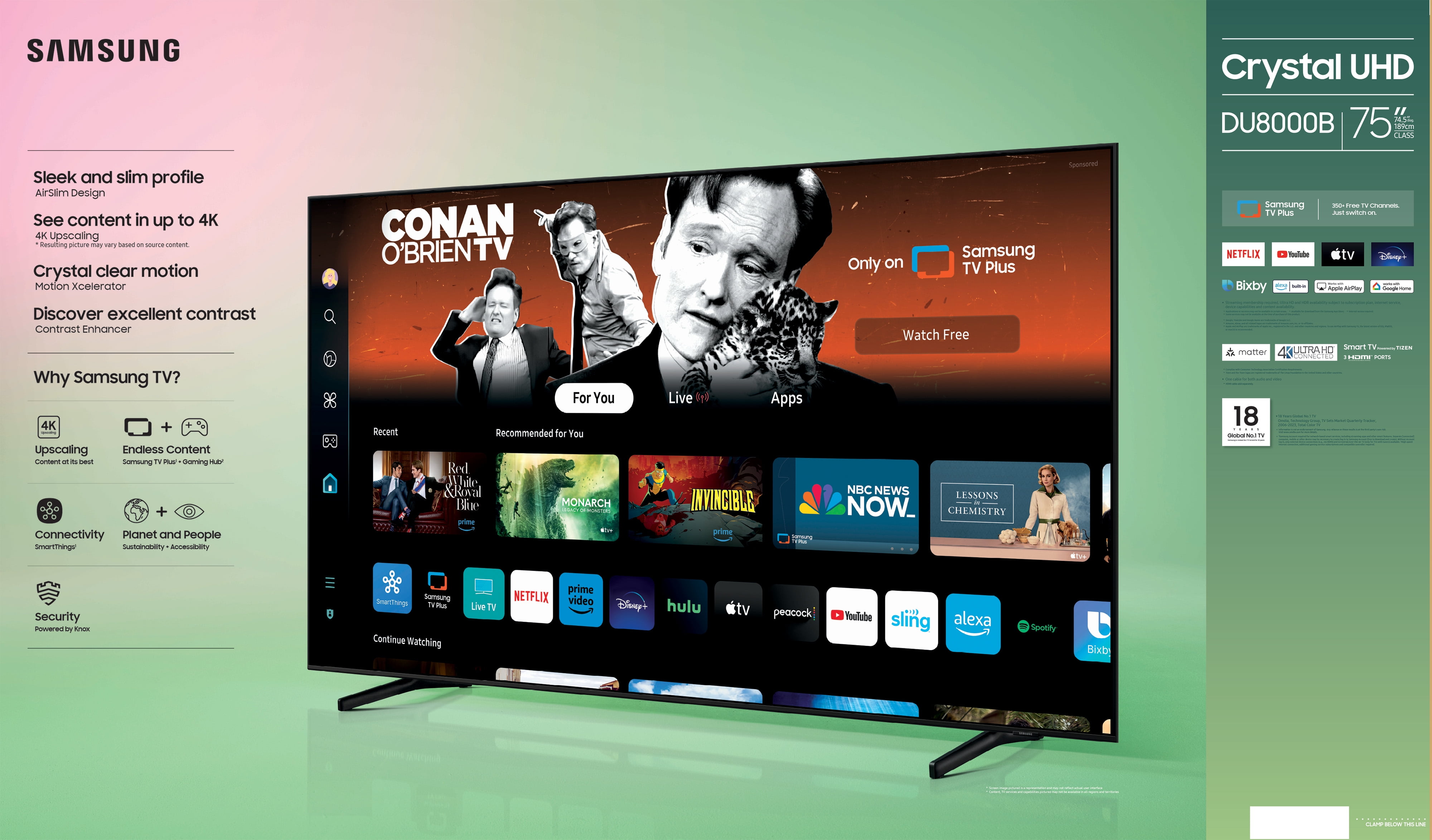 AirSlim-This TV blends right into your wall with a slim design. It brings clutter free minimalism to the room without distracting you from what you watch. 4K Upscaling-Get a clearer picture for more of your shows and videos. 4K Upscaling transforms each pixel for improved content. Motion Xcelerator-Watch your content smoothly while experiencing less lag and blur. It improves motion between frames so you have a seamless picture. Mega Contrast-Automatically adjusts the brightness and contrast. It reduces the difference between light and dark areas so that objects on screen stand out more. Dynamic Crystal Color-One billion shades of color help produce greater detail on the screen. See more nuanced shades and tones that match real life. Object Tracking Sound Lite-You’ll hear 3D surround sound that follows the movement on screen using our incredible virtual top channel audio putting you right in the middle of the car chase, stampede or party scene. HDR-Take in an impressive spectrum of colors and fine details, even in the darkest scenes. Brightness and contrast are automatically dialed into their ideal levels in every frame so you can see your content as it’s meant to be seen from the subtle highlights in a dark, moody alleyway to the deep shadows cast on a bright and sunny afternoon. Crystal Processor 4K-Watch the content you love upgraded to dazzling 4K resolution. You’ll be able to better enjoy your TV’s capabilities as the Crystal Processor automatically transforms your favorite movies and shows with 3D color mapping and Adaptive Sound. Even if the content you’re watching wasn’t produced in 4K, you can enjoy it like it was. Samsung Tizen OS-Stream your favorite shows. Follow recipes. Play games. Work out with a trainer. Do all you enjoy with Smart TV Powered by Tizen. In just a few clicks, get instant access to your must have apps and endless content from the streaming services you love. And with Voice Assistants built into your TV, it’s easy to get to it all with just the sound of your voice.¹ Gaming Hub-Widen your world of gaming instantly without a console. Gaming Hub is where gaming comes together bringing the best of console games, streaming games and more all in one place. With easier access to your favorite games, standalone apps and accessories, start playing faster than ever. Plus, get recommendations for other games, adjust settings to optimize gameplay and more.² ¹Samsung Account required for network based smart services, including streaming apps and other smart features. Separate [connected] computer, mobile or other device may be necessary to create/log in to Samsung Account (free to download and create). Without Account log in, only external device connections (e.g., via HDMI) and terrestrial/over the air TV (only for TVs with tuners) available. ²High speed internet connection, additional gaming service subscriptions and compatible controller required. *Samsung Account required for network based smart services, including streaming apps and other smart features. Separate [connected] computer, mobile or other device may be necessary to create/log in to Samsung Account (free to download and create). Without Account log in, only external device connections (e.g., via HDMI) and terrestrial/over the air TV (only for TVs with tuners) available.