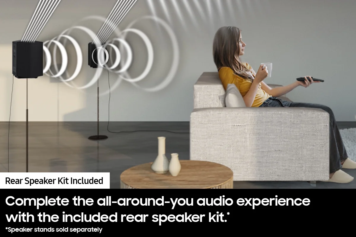 Subwoofer Included – Get that big boom with our included subwoofer. Bring home intense sound with rich, powerful bass. Game Mode – Optimize your gaming experience with perfectly synced directional audio that moves with the onscreen action. Game Mode eliminates distractions so you can hear better and play harder. *Compatible with Gaming Hub and select gaming consoles (e.g. Xbox X, PS5). Game console sold separately. Rear Speaker Kit Included – Nothing beats good backup. Complete the all-around-you audio experience with the included rear speaker kit. Bluetooth TV connection – Effortless connection. No cable necessary. Hear your TV’s audio through your soundbar with Bluetooth TV Connection. *Requires a Bluetooth compatible TV. One Remote – Keep your finger on the pulse. This do-it-all remote controls both your Samsung TV and soundbar. Dolby Audio / DTS 2.0 Channel – Get pulled into the action. Dolby Audio / DTS 2.0 channel takes you on a surround sound adventure with rich all-around-you audio for a captivating theater-like experience. Night Mode – Enjoy stellar sound even when they’re sleeping. Switch on Night Mode to tamp down the volume and compress the bass. Voice Enhance – Ensure voices cut through the noise. Voice Enhance optimizes the equalizer and amplifies the dialogue on the screen so that voices can be heard more clearly.