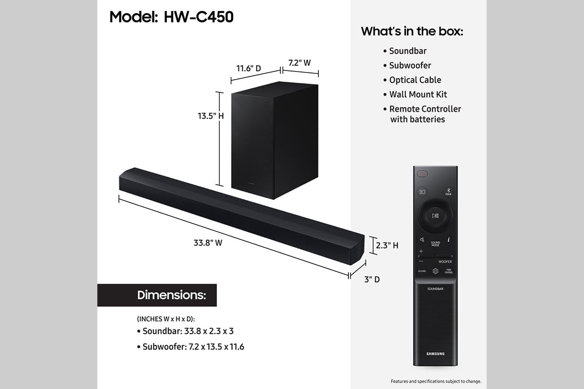 DTS Virtual:X – Expand your listening experience. DTS Virtual: X creates spacious 3D sound putting you at the center of the action. Subwoofer Included -Get that big boom with our included subwoofer. Bring home intense sound with rich, powerful bass. Bass Boost – Bass you can boost with a tap. Feel the depth of distant thunder as your listening experience is taken to another level. Adaptive Sound Lite – Enjoy all your favorite video content with dynamically optimized audio and enhanced voice clarity so you can follow along with action-packed games and blockbuster films. Game Mode – Optimize your gaming experience with perfectly synced directional audio that moves with the onscreen action. Game Mode eliminates distractions so you can hear better and play harder. *Compatible with Gaming Hub and select gaming consoles (e.g. Xbox X, PS5). Game console sold separately. One Remote Control – Keep your finger on the pulse. This do-it-al remote controls both your Samsung TV and soundbar. BT TV Connection – Effortless connection. No cable necessary. Hear your TV’s audio through your soundbar with BT TV Connection. *Requires a BT compatible TV. Night Mode – Enjoy stellar sound even when they’re sleeping. Switch on Night Mode to tamp down the volume and compress the bass. Voice Enhance – Ensure voices cut through the noise. Voice Enhance optimizes the equalizer and amplifies the dialogue on the screen so that voices can be heard more clearly. Wireless Surround Sound Compatible – Take your setup to the next level. When you want to go full wireless surround sound, this soundbar is ready. Connect easily and seamlessly to optional Samsung speakers. *Optional Samsung speakers sold separately.