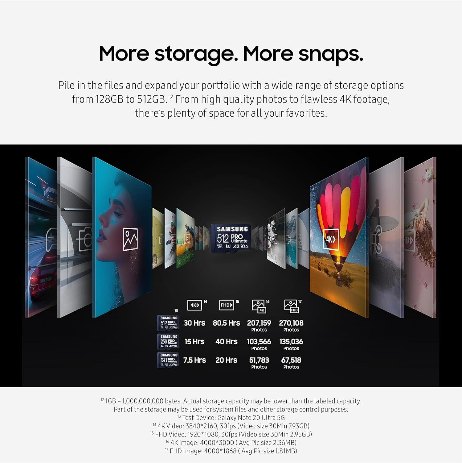 Step into a new stage of storage with the PRO Ultimate MicroSD. It supports everything from creative pursuits to personal memories with high speed. The PRO Ultimate MicroSD makes it easy to complete each task. Spend more time creating and less time saving with read and write speeds up to 200/130 MB/s when using Samsung USB readers. It also features state-of-the-art U3 and V30 ratings with A2 performance that helps with fast loading and 4K UHD video capture. Whether you’re using a smartphone or a gaming console⁴, count on the PRO Ultimate microSD for extensive compatibility. It a true team player when it comes to heavy-duty application usage or file-saving—and can be used with action cams and drones, too. The PRO Ultimate MicroSD is tough enough to take on anything.
