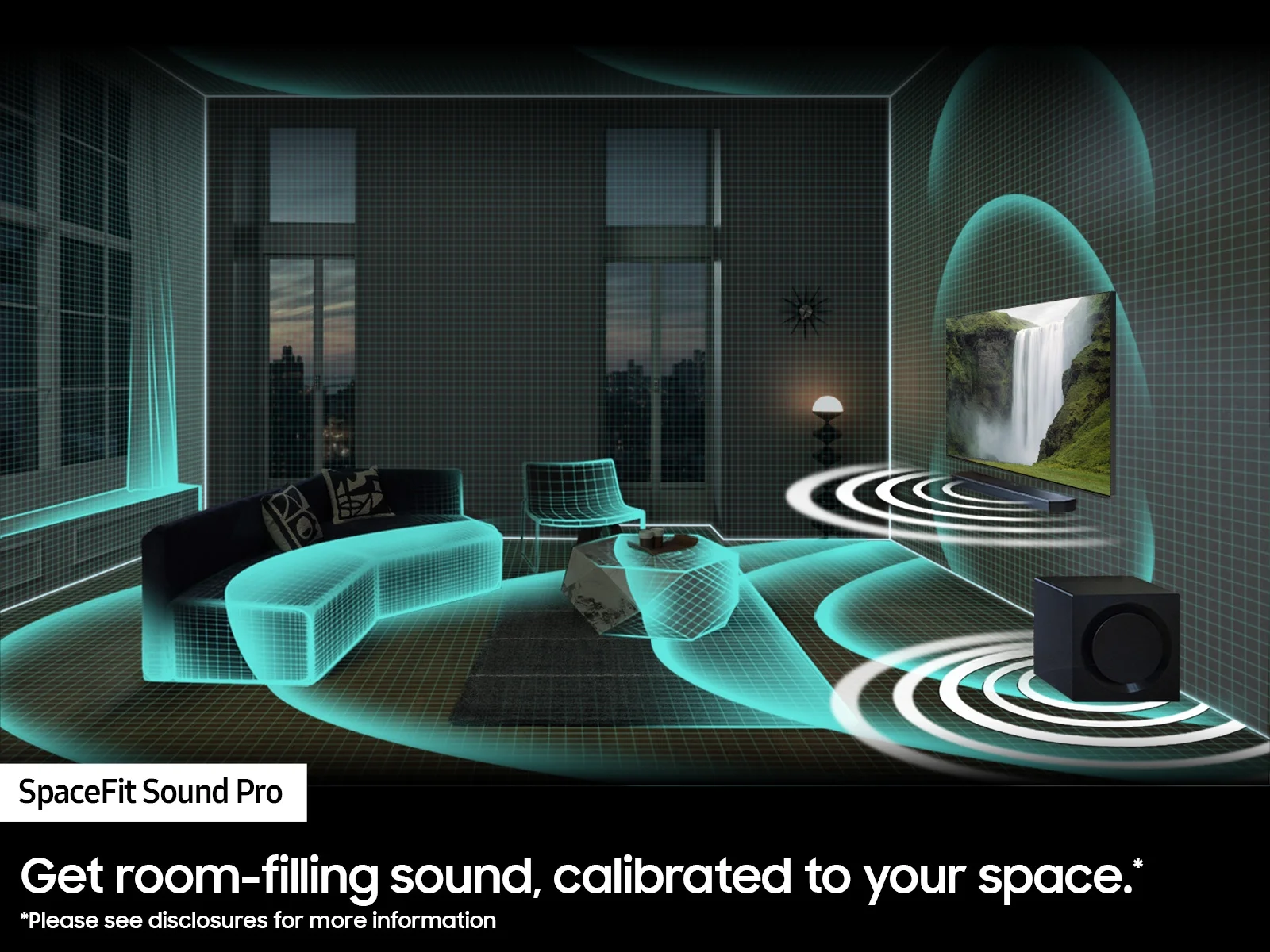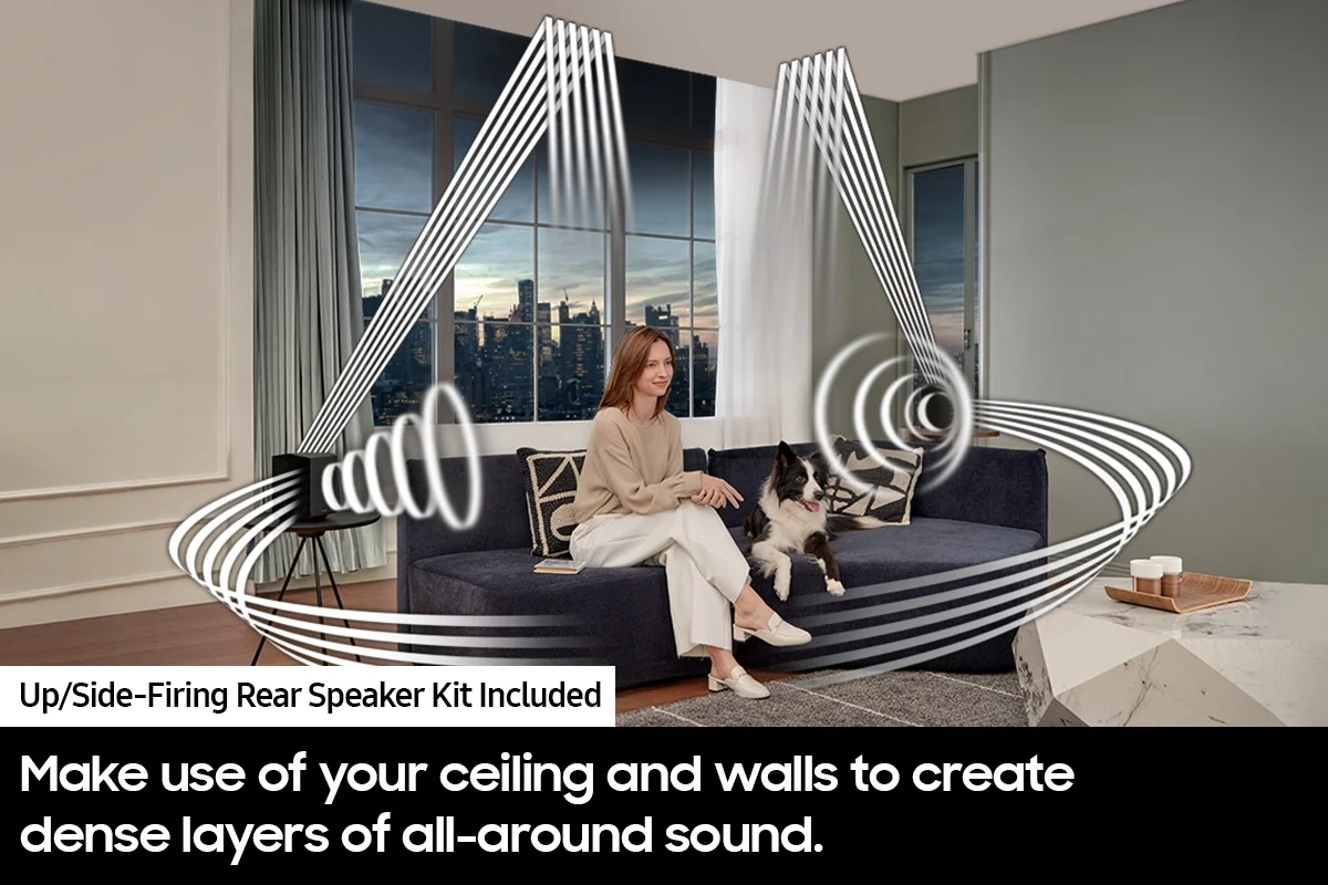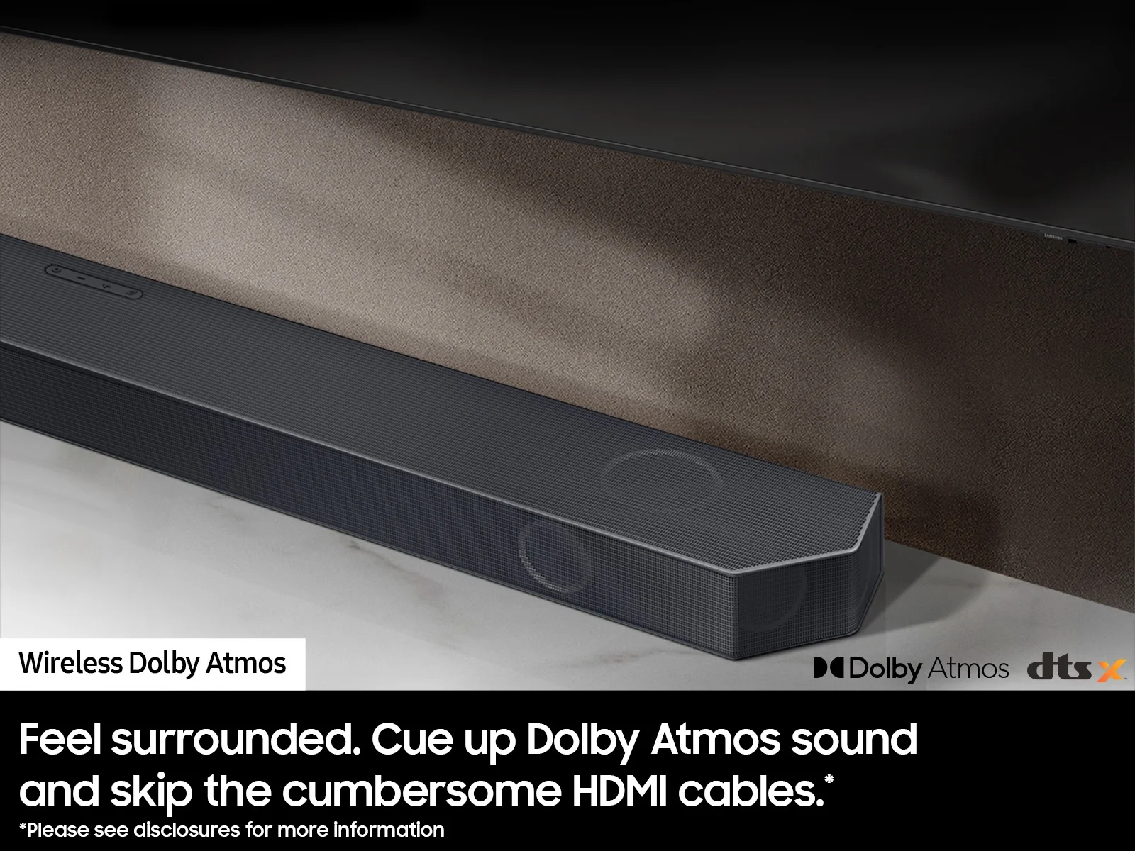 11.1.4 Ch. True Dolby Atmos Sound – Feel sound all around with 11 front-facing speakers, 1 subwoofer and 4 up-firing channels for a true Dolby Atmos experience. Q-Symphony – For sound that is off the charts, combine a Samsung TV with a Samsung soundbar.*Q-Symphony is only compatible with select 2020 – 2024 Samsung TV’s. Wireless Dolby Atmos – Feel surrounded. Cue up Dolby Atmos sound and skip the cumbersome HDMI cables. Feel free to arrange your space exactly how you want without compromising the audio experience. *Compatible with 2023 CU7000 models and above. SpaceFit Sound Pro – Sound amplifies everything. This soundbar reacts accordingly. Get room-filling sound, calibrated to your space, with a soundbar that analyzes your environment and automatically optimizes the audio. Up/Side Firing Rear Speaker Kit included – These up/side firing rear speakers make use of your ceiling and walls to create dense layers of all-around sound. Built-In Voice Assistant – Your voice can do amazing things. Activate hands-free navigation of your soundbar and TV using built-in voice assistants. Adaptive Sound – Hear voices better, even at low volume with intelligently optimized audio. Game Mode Pro – Unlock a more intuitive gaming experience with 3D optimized sound. *Compatible with Gaming Hub and select gaming consoles (e.g. Xbox X, PS5). Game console sold separately. Airplay 2 – Simply pair the soundbar with a compatible iPhone or other Apple device to hear your music, podcasts and more. *This Samsung Soundbar supports AirPlay2 and requires iOS 11.4 or later. Apple and AirPlay are trademarks of Apple, Inc. registered in the U.S. and other countries. Active Voice Amplifier – To ensure dialogue is not drowned out, Active Voice Analyzer breaks down room noise so that onscreen voices are always optimized.