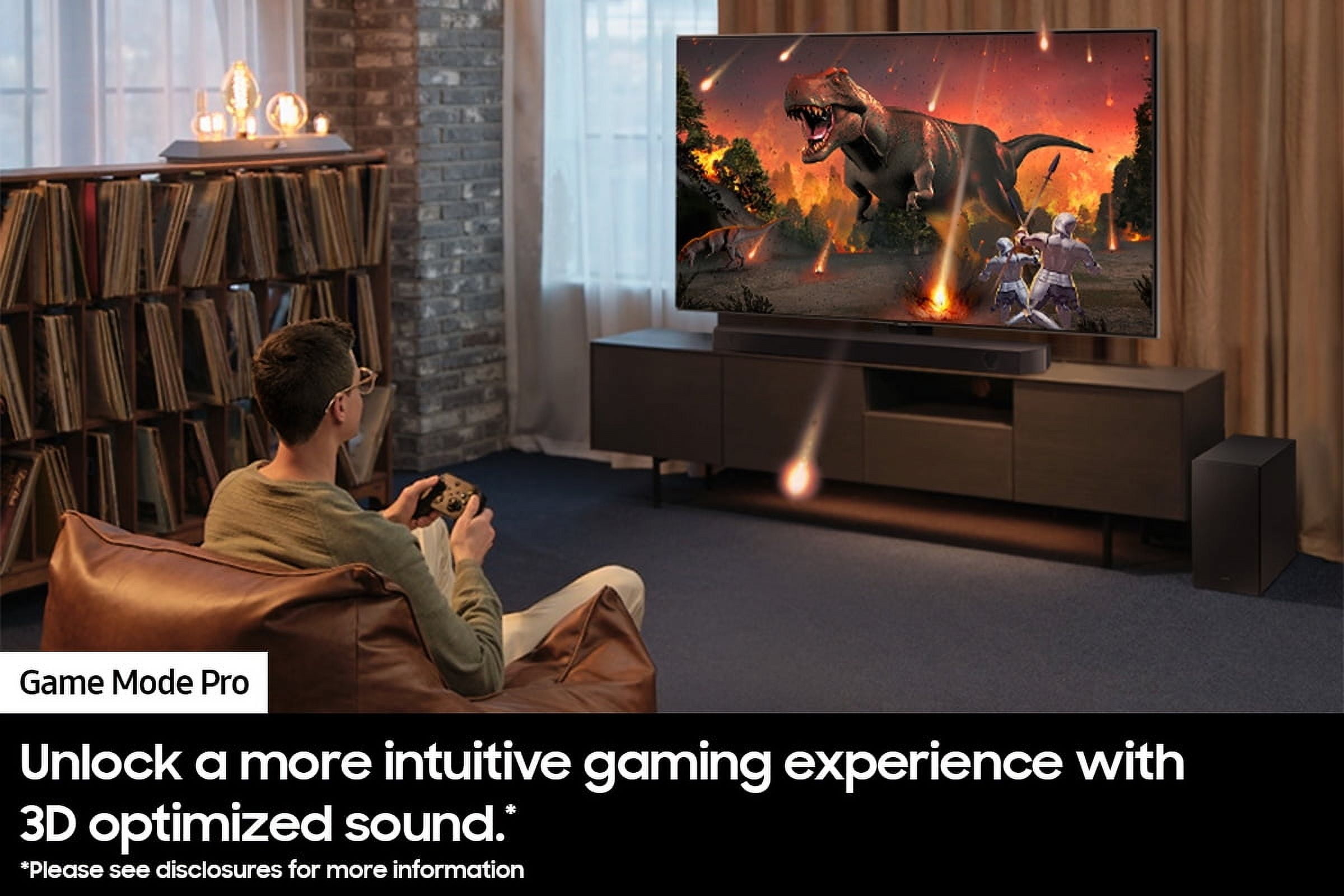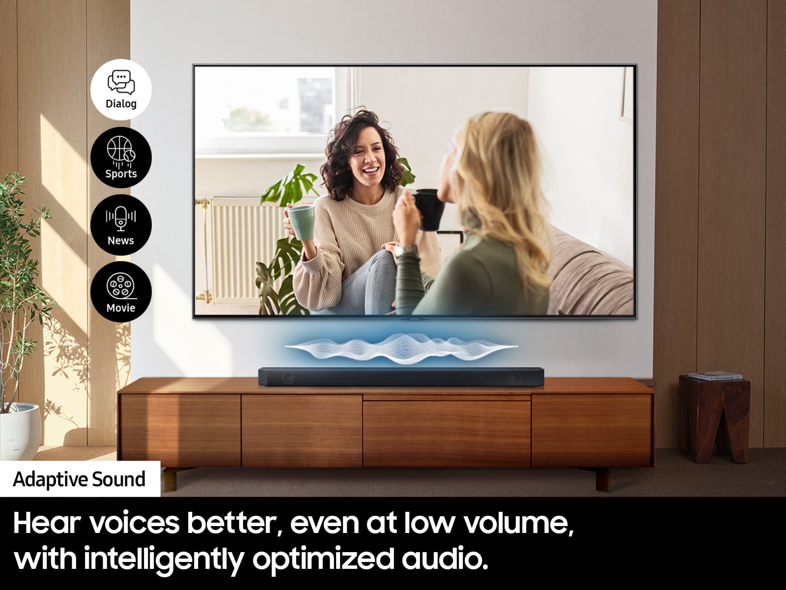 Q-Symphony – For sound that’s off the charts, combine a Samsung TV with a Samsung soundbar.*Q-Symphony is compatible with select 2020 – 2023 Samsung TV’s. Please refer to samsung.com for more information. 3.1.2 Ch. True Dolby Atmos Sound – There’s more that meets the ear. Appreciate the story, concert or soundtrack on a deeper level with the three-dimensional nuance of 3.1.2ch sound with Dolby Atmos. Adaptive Sound – Hear voices better, even at low volume, with intelligently optimized audio. HDMI eARC – This single HDMI cable connection passes advanced audio like Dolby Atmos from your TV to your soundbar. One cable is all you need for a high-quality connection that won’t degrade your sound. *Requires an HDMI eARC compatible TV. Game Mode Pro – The game is calling. Powerful up-firing speakers, acoustic beam and strong woofers unlock a more intuitive gaming experience, complete with 3D optimized sound. BT Multi-Connection – No more unpairing as you trade off control. Connect two smart devices simultaneously and share the soundbar with ease. *Requires a BT compatible TV. Samsung Acoustic Beam® – Hear panoramic sound that moves with the action on-screen. This Samsung tech delivers finely tuned sound for an immersive listening experience. Tap Sound – Around here, streaming music from your phone to your soundbar is simple as that. Just tap the soundbar with your phone and start listening. *Tap sound is only compatible with select Samsung mobile devices, with Android 8.1 and above. Tap Sound requires SmartThings app to activate and set up. This service only works when Soundbar and mobile are on. One Remote Control – Keep your finger on the pulse. This do-it-al remote controls both your Samsung TV and soundbar.