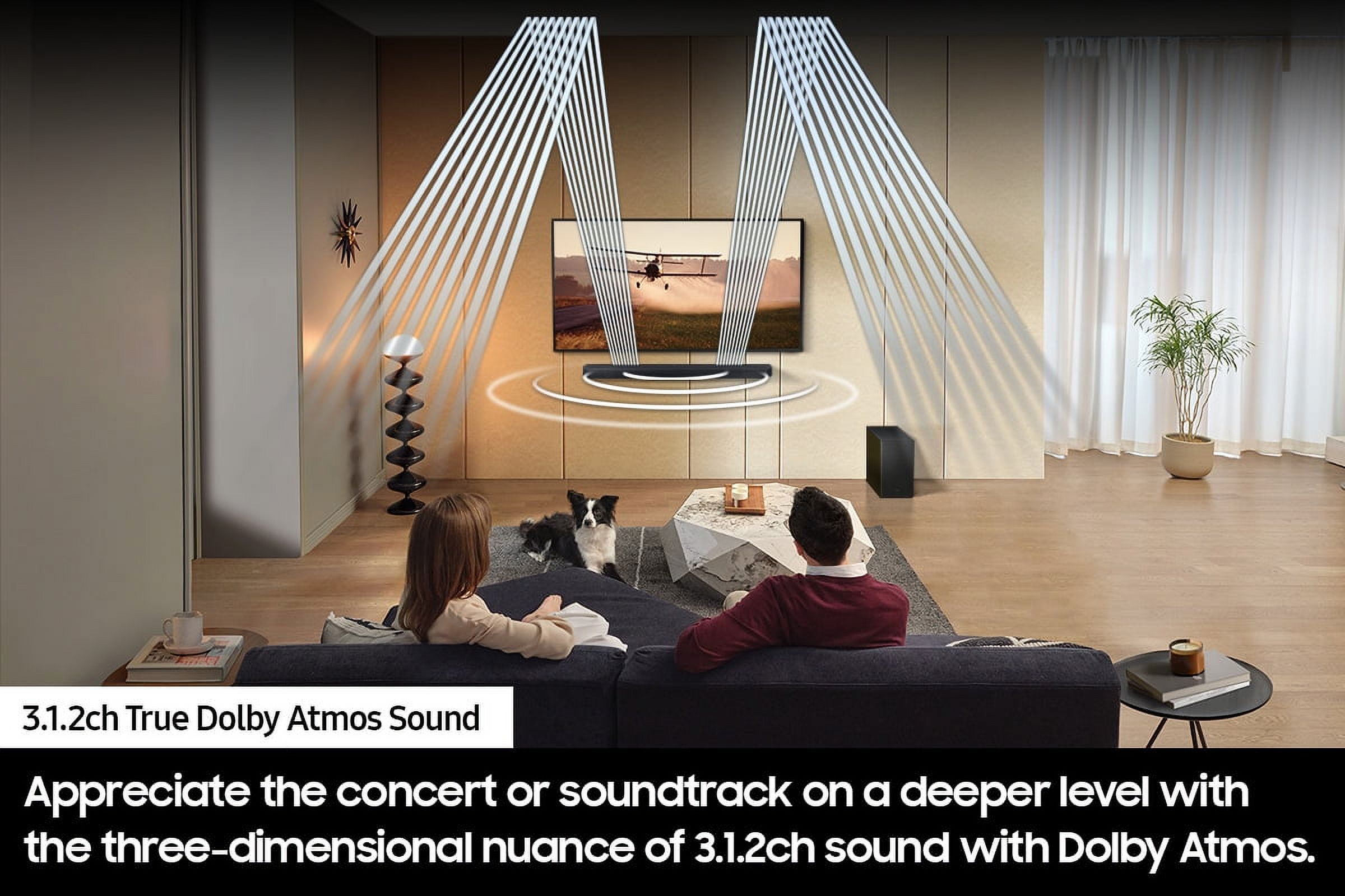 Q-Symphony – For sound that’s off the charts, combine a Samsung TV with a Samsung soundbar.*Q-Symphony is compatible with select 2020 – 2023 Samsung TV’s. Please refer to samsung.com for more information. Wireless Dolby Atmos – Feel surrounded. Cue up Dolby Atmos sound and skip the cumbersome HDMI cables. Feel free to arrange your space exactly how you want without compromising the audio experience. *Compatible with 2023 CU7000 models and above. 3.1.2 Ch. True Dolby Atmos Sound – Appreciate the story, concert or soundtrack on a deeper level with the three-dimensional nuance of 3.1.2ch sound with Dolby Atmos. SpaceFit Sound Pro – Sound amplifies everything. This soundbar reacts accordingly. Get room-filling sound, calibrated to your space, with a soundbar that analyzes your environment and automatically optimizes the audio. Works with Voice Assistants – Stay in tune with your Stay in tune with your ever-growing smart home by connecting seamlessly via your favorite voice assistants. Adaptive Sound – Hear voices better, even at low volume, with intelligently optimized audio. Game Mode Pro – The game is calling. Powerful up-firing speakers, acoustic beam and strong woofers unlock a more intuitive gaming experience, complete with 3D optimized sound. Airplay 2 – Simply pair the soundbar with a compatible iPhone or other Apple device to hear your music, podcasts and more. *This Samsung Soundbar supports AirPlay2 and requires iOS 11.4 or later. Apple and AirPlay are trademarks of Apple, Inc. registered in the U.S. and other countries. Tap Sound – Around here, streaming music from your phone to your soundbar is simple as that. Just tap the soundbar with your phone and start listening. *Tap sound is only compatible with select Samsung mobile devices, with Android 8.1 and above. Tap Sound requires SmartThings app to activate and set up. This service only works when Soundbar and mobile are on. Chromecast Built-in – Beam your favorite music, radio app or podcasts from your phone to your soundbar with Chromecast Built-in. Just tap the Cast button from your favorite music apps to start listening. *This service is provided by Google and can be terminated at any time. Some features and functions provided by connected devices may be limited or not be supported to use. Content Services may vary by region & are subject to change without notification.