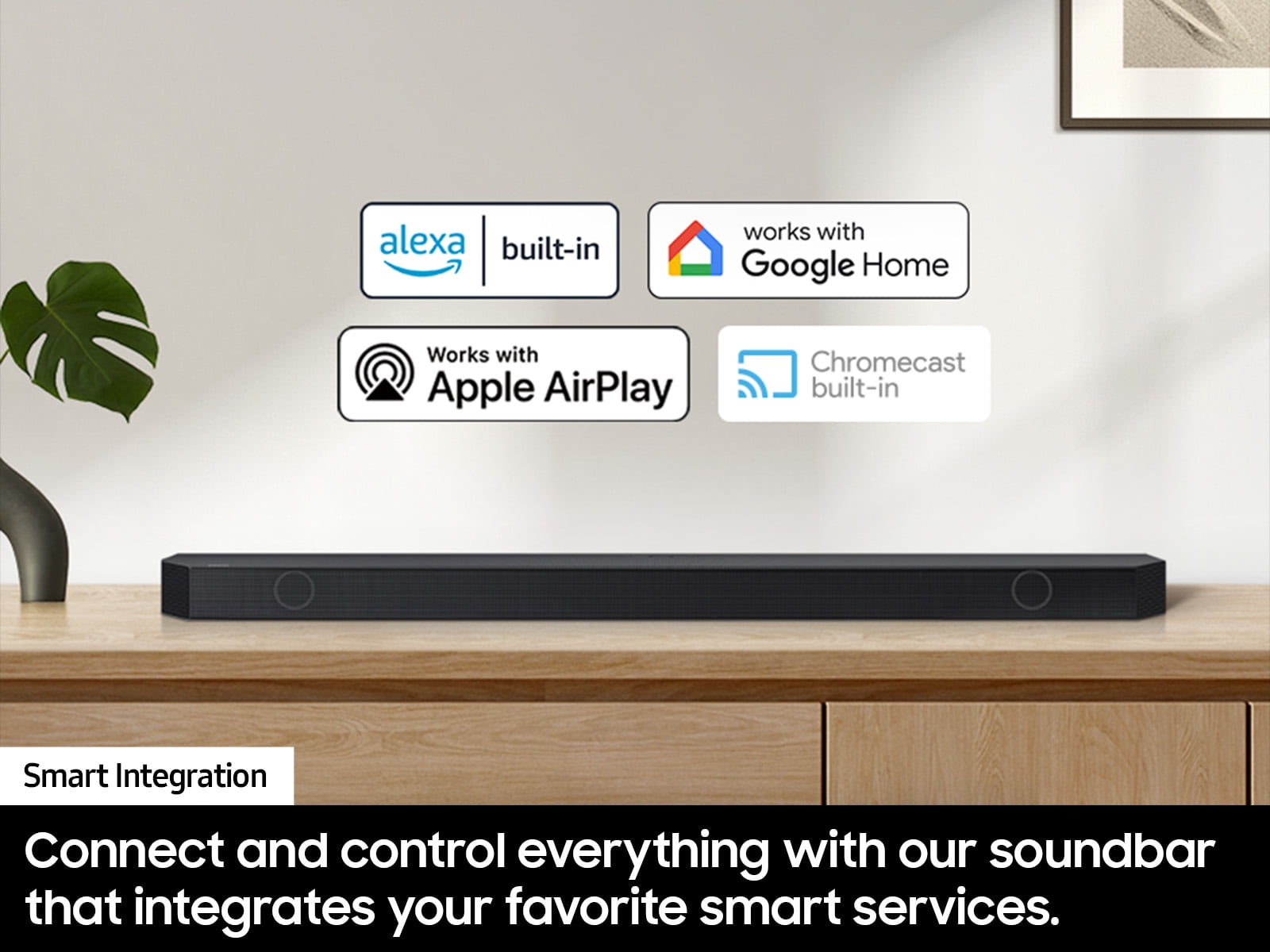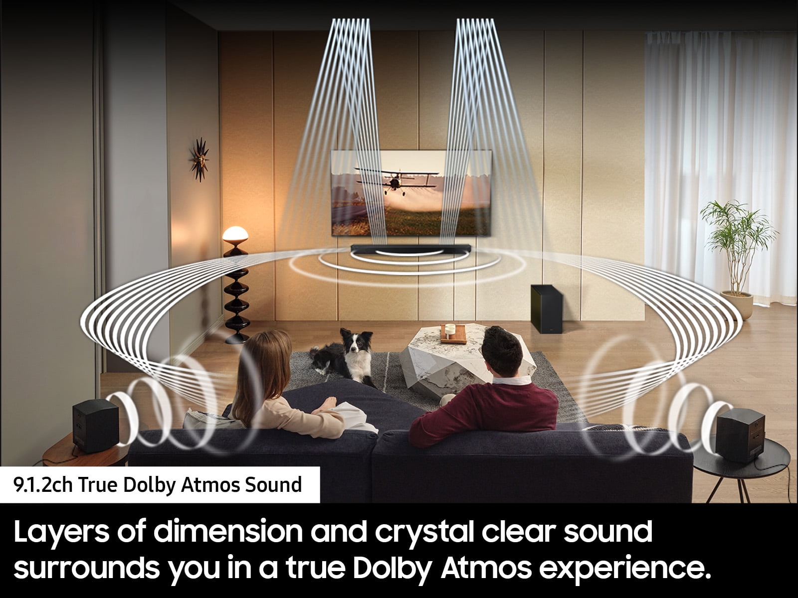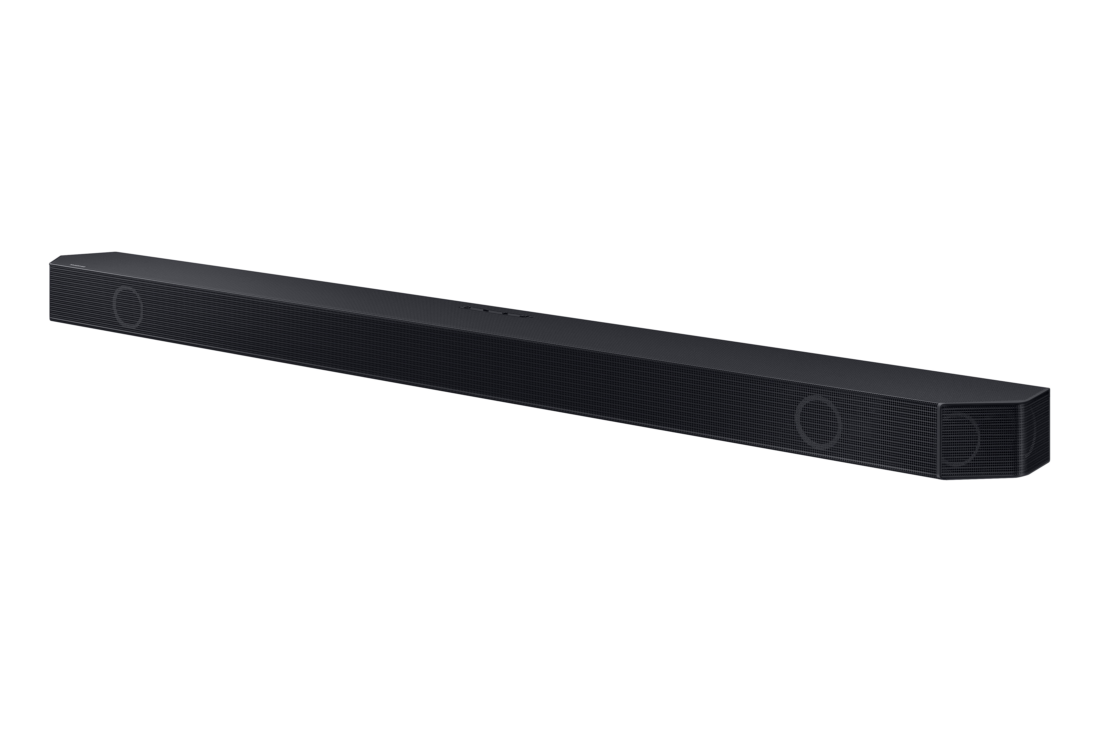 Q-Symphony – Pair a Samsung TV with a Samsung Soundbar to unlock a new level of powerful audio. Experience content like never before only with Samsung products. With Q-Symphony, your speakers work together to optimize all the audio channels to operate as one. *Q-Symphony requires a compatible 2020-2024 Samsung TV. Please refer to samsung.com for more information. 9.1.2 Ch. True Dolby Atmos Sound – Feel surrounded by crystal clear audio from all sides as you watch. Experience mulit-dimensional sound from every channel. Wireless Dolby Atmos – Skip the HDMI cables and enjoy truly elevated audio with Wireless Dolby Atmos(TM). Experience captivating audio without the cable clutter. *Compatible with select 2022-2024 Samsung TVs Rear Speaker Kit Included – Complete the all-around audio experience with our included rear speaker kit that helps boost the sound from your TV. Smart Integration – Connect your devices and control everything with our soundbar that integrates your favorite voice assistants and smart services like Built-in Alexa, Chromecast, Airplay 2 and more. *Content Services may vary by region & are subject to change without notification. Some features and functions provided by connected devices may be limited or not be supported to use. Content Services may vary by region & are subject to change without notification. This Samsung Soundbar supports AirPlay2 and requires iOS 11.4 or later. Apple, and AirPlay are trademarks of Apple Inc., registered in the U.S. and other countries. SpaceFit Sound Pro – Get room-filling sound calibrated to your space, with a soundbar that analyzes your environment and automatically optimizes the audio accordingly for an accurate and clear sound. Adaptive Sound – Tired of missing dialogue? Hear voices better, even at low volume, with intelligently optimized audio. Scenes are analyzed in real time to pull out the most important audio based on the type of content. Game Mode Pro – The game is calling. Powerful up-firing speakers, acoustic beam and strong woofers unlock a more intuitive gaming experience, complete with 3D optimized sound. And we know you don’t have time to waste on settings—so the soundbar automatically activates the Game Mode Pro in sync with your TV. *Compatible with Gaming Hub and select gaming consoles (e.g. Xbox X, PS5). Gaming Hub requires a compatible TV and subscription. Please refer Samsung.com for more information. Active Voice Analyzer – Ensure dialogue and commentary are not drowned out—so you never miss an important moment. Active Voice Analyzer breaks down room noise so that onscreen voices are always optimized, making movies, shows and sports more enjoyable. Tap Sound – Around here, streaming music from your phone to your soundbar is simple as that. Just tap the soundbar with your phone and start listening. It’s mirroring that works like magic. *Tap sound is only compatible with select Samsung mobile devices, with Android 8.1 and above. Tap Sound requires SmartThings app to activate and set up. This service only works when Soundbar and mobile are on.