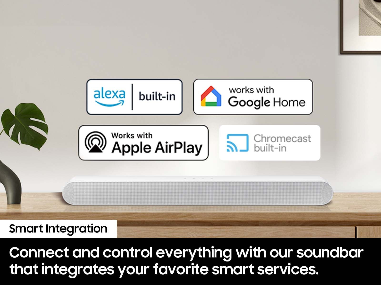 All-in-one Design-Unlock audio all around you with this compact soundbar’s powerful 5 channel sound with Dolby Atmos. The built in woofers deliver deep seat shaking bass while the sleek all in one design makes for easy setup without sacrificing surround sound performance. Q-Symphony-Pair a Samsung TV with a Samsung Soundbar to unlock a new level of powerful audio. Experience content like never before only with Samsung products. With Q-Symphony, your speakers work together to optimize all the audio channels to operate as one.¹ Wireless Dolby Atmos-Skip the HDMI cables and enjoy truly elevated audio with Wireless Dolby Atmos™. Experience captivating audio without the cable clutter.² Smart Integration-Connect your devices and control everything with our soundbar that integrates your favorite voice assistants and smart services like Built in Alexa, Chromecast, Airplay and more.³ SpaceFit Sound Pro-Get room filling sound calibrated to your space, with a soundbar that analyzes your environment and automatically optimizes the audio accordingly for an accurate and clear sound. Adaptive Sound-Tired of missing dialogue? Hear voices better, even at low volume, with intelligently optimized audio. Scenes are analyzed in real time to pull out the most important audio based on the type of content. Game Mode Pro-The game is calling. Powerful up firing speakers, acoustic beam and strong woofers unlock a more intuitive gaming experience, complete with 3D optimized sound. And we know you don’t have time to waste on settings so the soundbar automatically activates the Game Mode Pro in sync with your TV.⁴ AVA-Ensure dialogue and commentary are not drowned out so you never miss an important moment. Active Voice Analyzer breaks down room noise so that onscreen voices are always optimized, making movies, shows and sports more enjoyable. ¹ Q-Symphony requires a compatible 2020 2024 Samsung TV. Please refer to samsung.com for more information. ² Compatible with select 2022-2024 Samsung TVs. ³ Content Services may vary by region and are subject to change without notification. ⁴ Compatible with Gaming Hub and select gaming consoles (e.g. Xbox X, PS5). Gaming Hub requires a compatible TV and subscription. Please refer Samsung.com for more information.