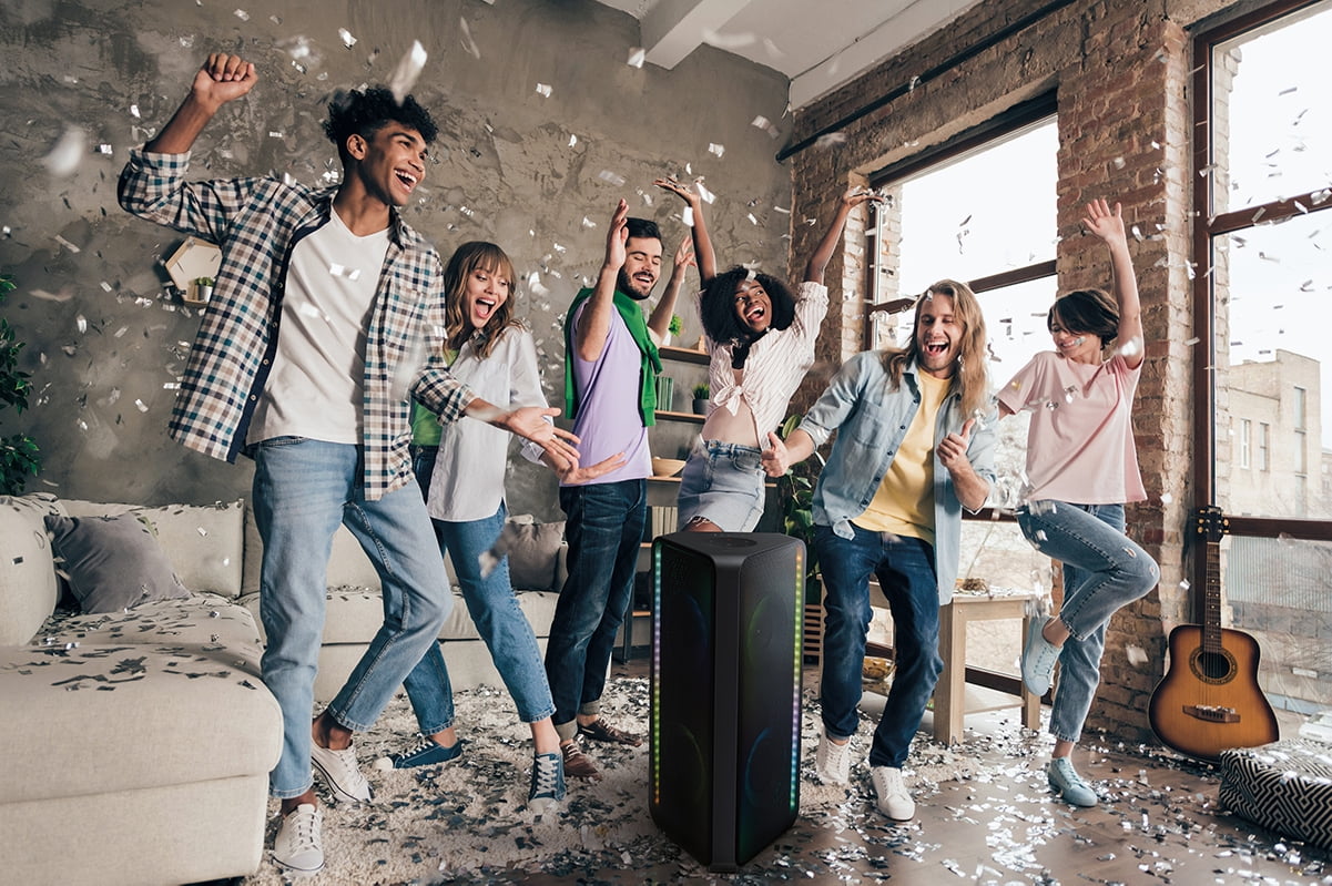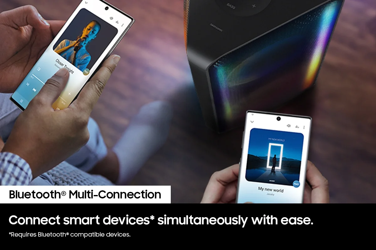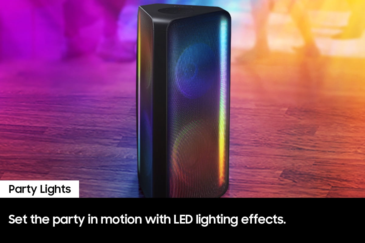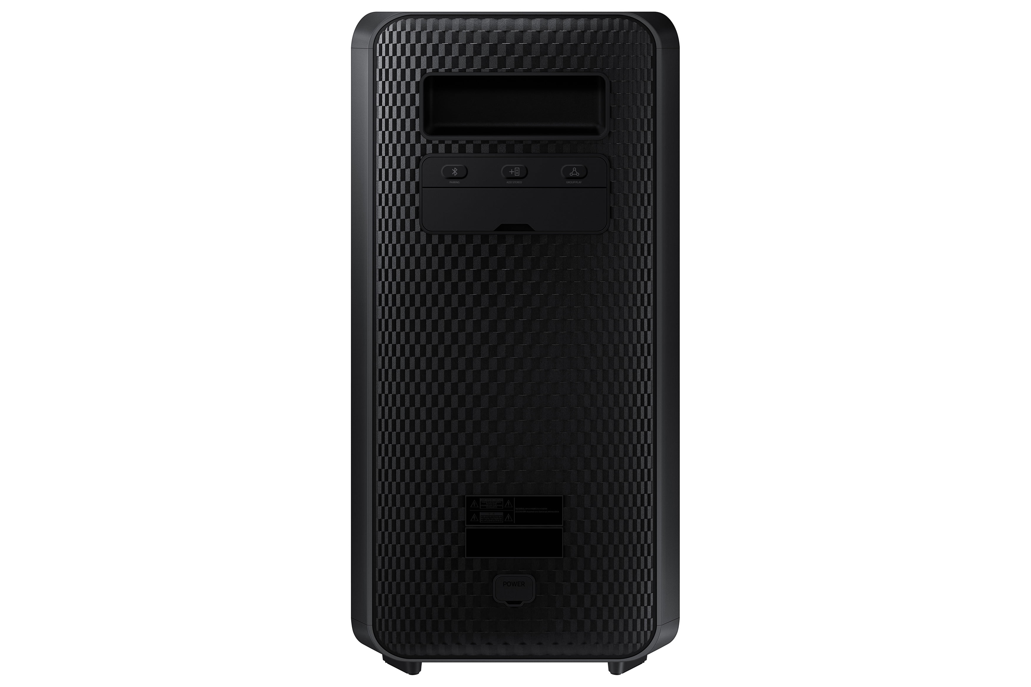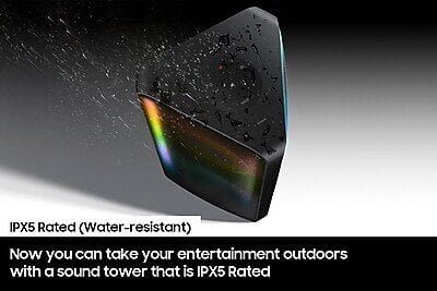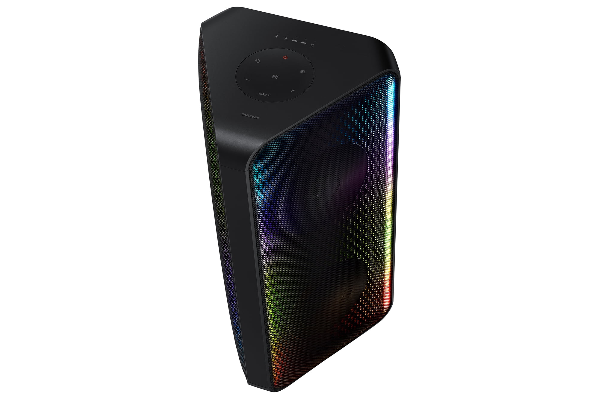 Expand your Bi-directional sound. Uniquely designed bi-directional speakers kick up the sound with 140 watts of high power. Crank up your party with High Power sound. Enjoy up to 12 hours* of unplugged entertainment with our built-in battery. *Battery life will vary depending on applications loaded on the product and power management setting used by the consumer. IPX5 Rated Water Resistance – Rain or shine, enjoy year-round outdoor entertainment with this speaker system that is IPX5 rated for weather-resistant durability against water and dust. Move around your party sound. Set the mood with festive LED lighting effects. Enjoy party, ambient, and dance modes. *Just download the Sound Tower App to control everything from built-in LED lighting to sound effects and even your EQ setting—right from your Android or iOS device. Bluetooth® Multi Connection. Connect two smart devices simultaneously and share the sound tower with ease. No more jumping back and forth, just deciding what’s next.* *Requires Bluetooth® compatible devices Group Play gets your party thumping. Connect multiple* Samsung Sound Tower devices for a richer sound experience—with wire and wirelessly. *Connect up to 10(compatibility wireless/wired between the MX-ST and the MX-T models).