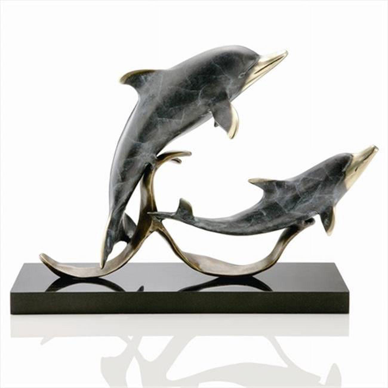 This beautiful brass dolphin sculpture is titled “Sailor’s Delight” and it features a mother dolphin and her calf. Made of brass that has been colored using a proprietary hot patina process. The double dolphin statue is affixed to a solid marble base.