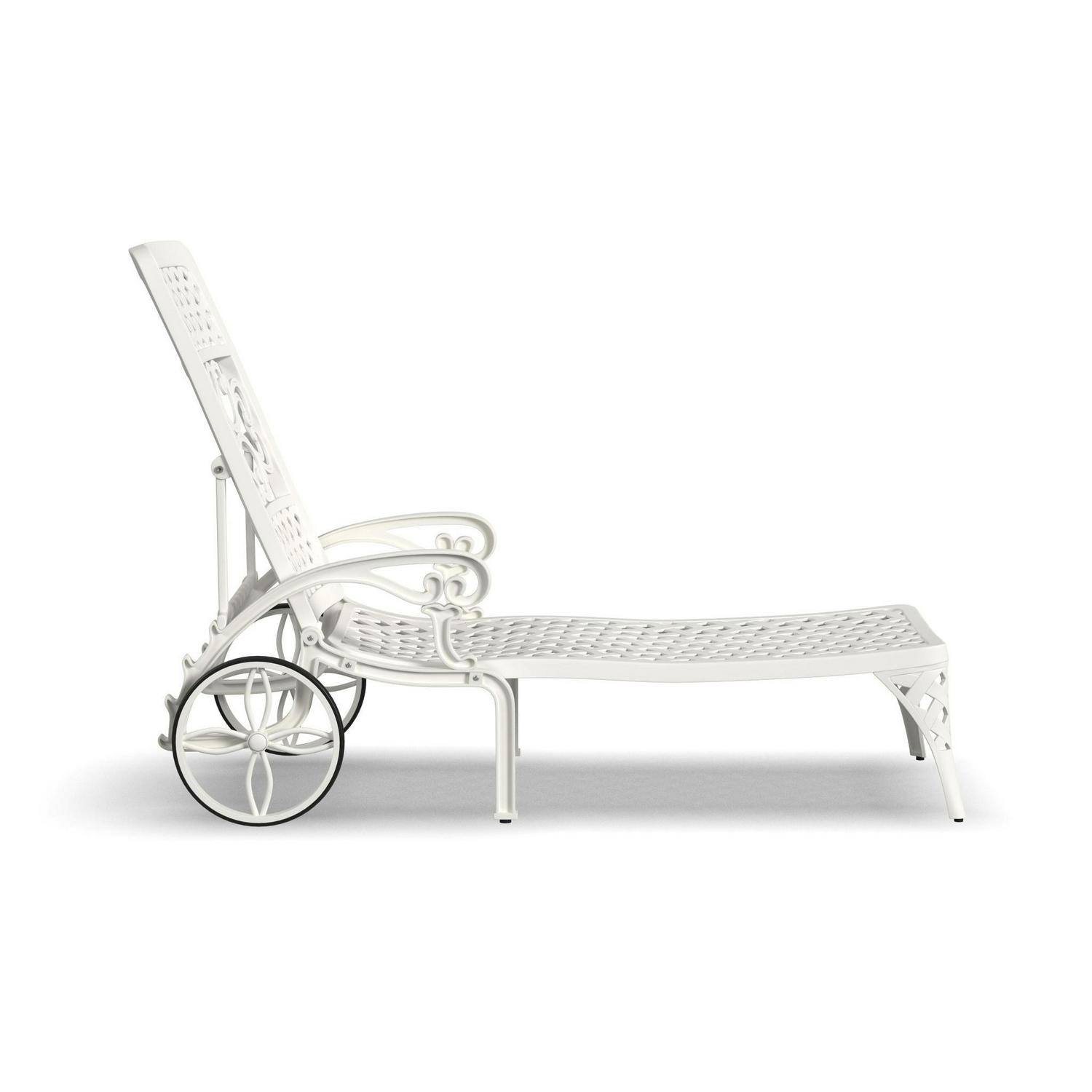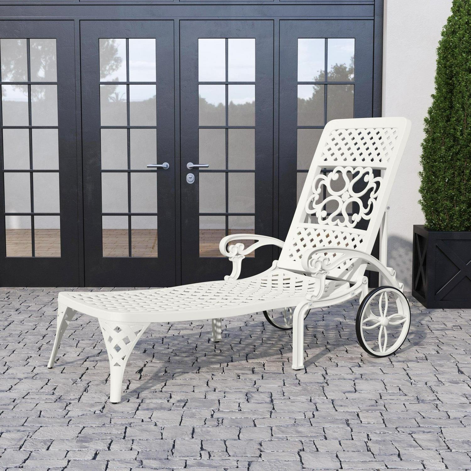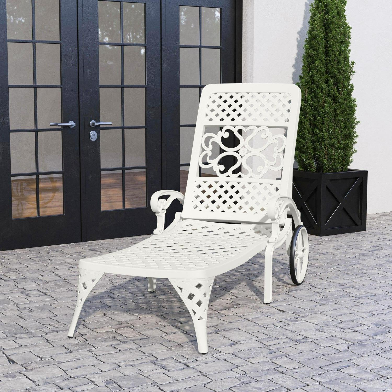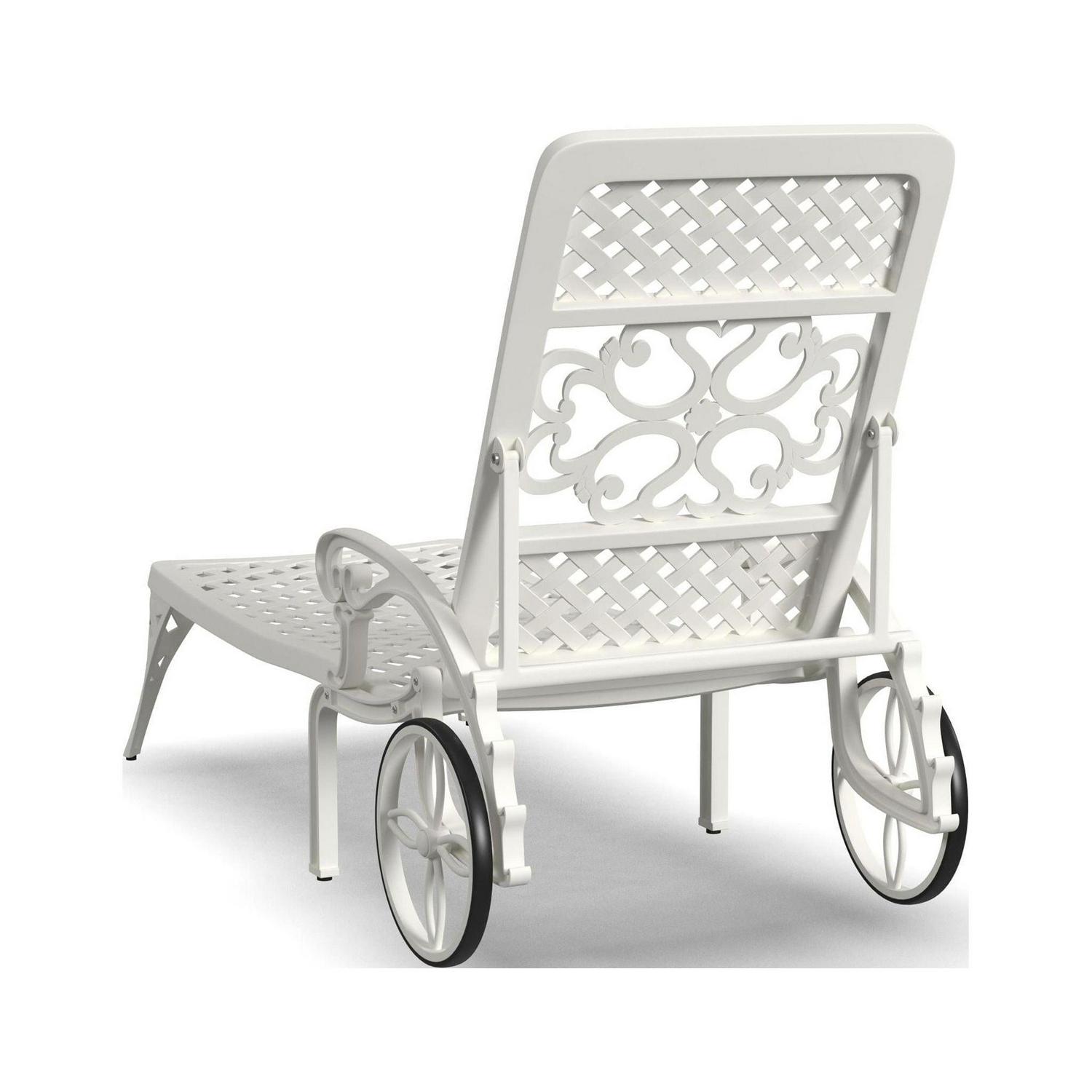 Turn an ordinary outdoor space into an oasis with this Homestyles Sanibel Chaise Lounge. This chaise lounge is constructed with white powder-coated aluminum for low-maintenance and lasting durability season after season. Two base wheels allow for easy moving and four recline settings allow you to sit all the way up or lay back. Simply add your own cushions to make it your style.