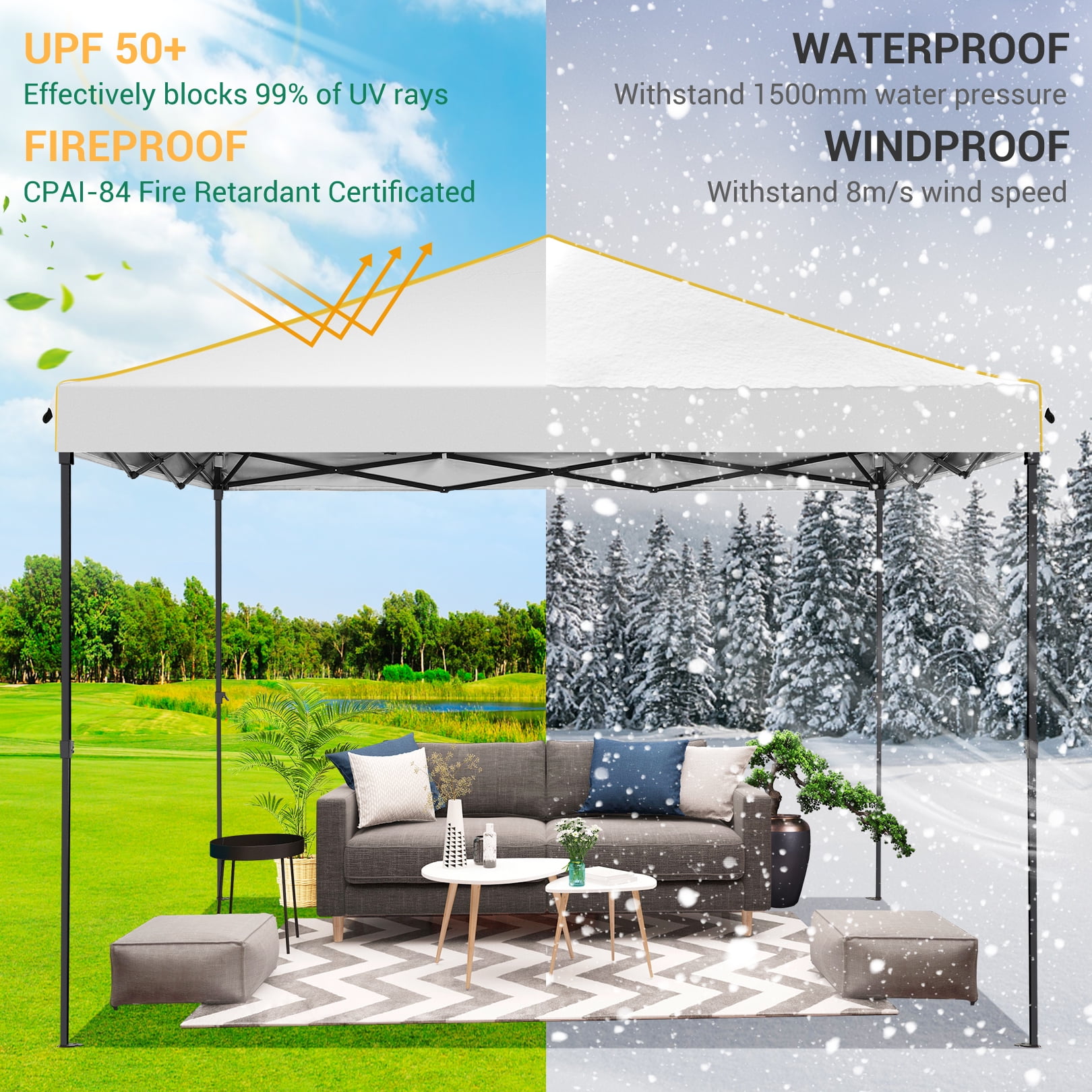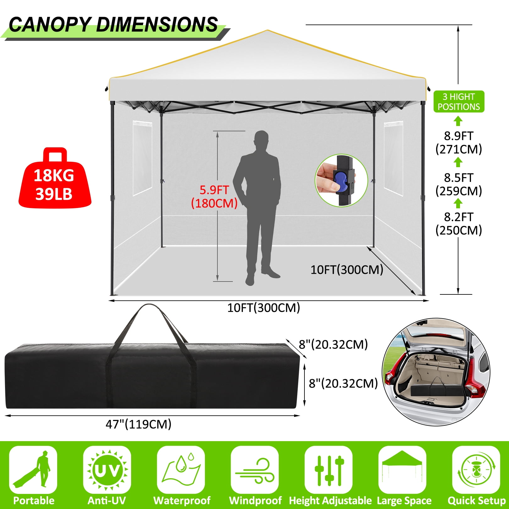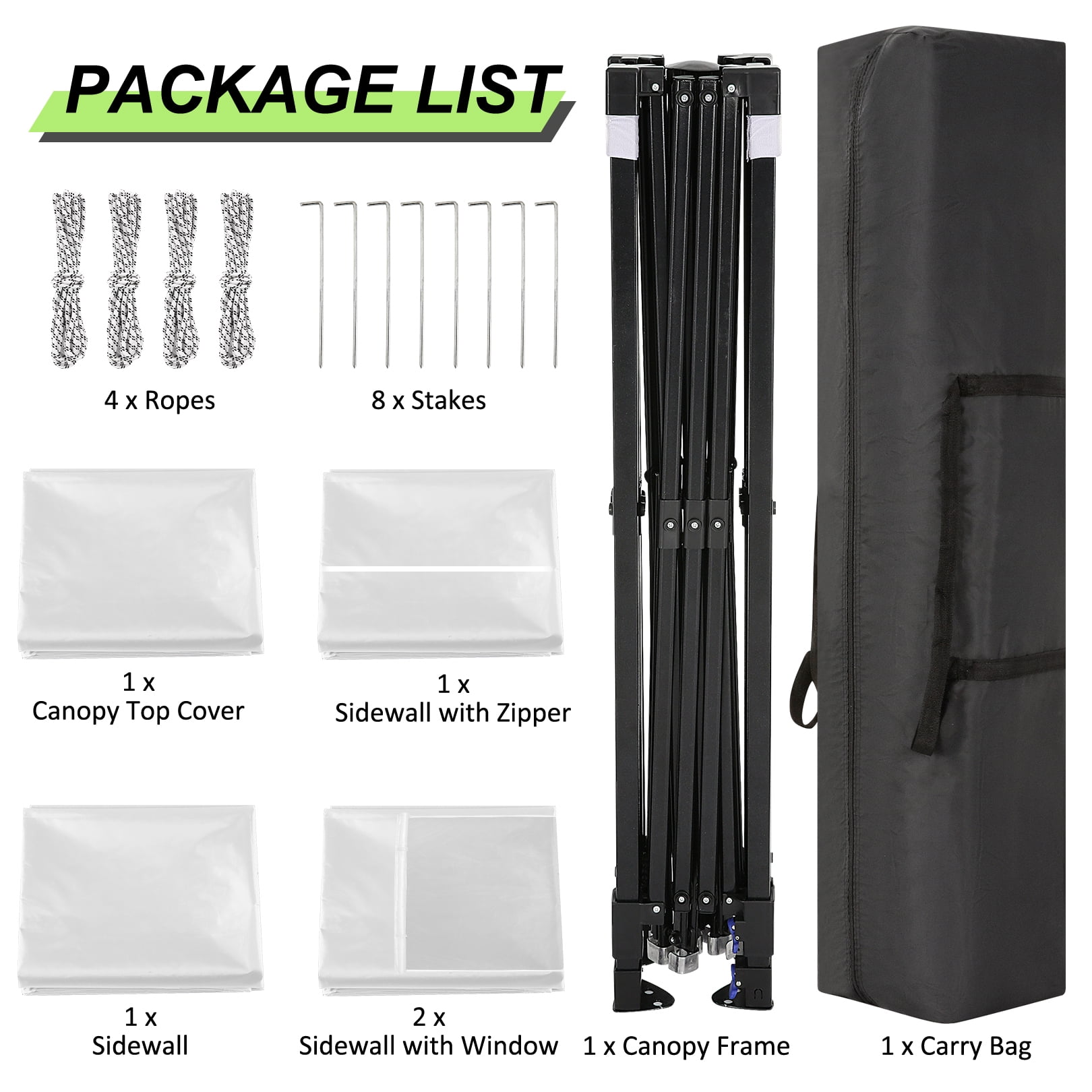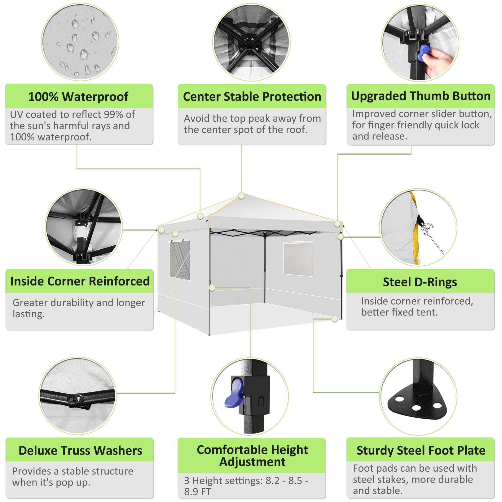 Key Features: 【Spacious Stay】The straight-leg instant pop-up awning provides 10×10 feet of shade and covers a wide area. Our instant pop-up canopy holds up to 10 people, chairs, small table and more. 【Upgrade Canopy Material】This pop up canopy is made of 25x25mm thick steel frame with anti-rust powder coating, full truss construction. All seams of the steel frame are heat-sealed for increased stability and corrosion resistance, and for long-term use. The canopy tent top tarpaulin is made of high density(210D)Oxford polyester fiber with an upgraded silver-plated PU lining that provides UPF 50+ UV protection and blocks 99% of harmful sunlight.Heat-sealed seam,the latest technology in the industry, prevent water penetrate from seams, 100% waterproof.The pop up gazebo includes waterproof sealing tape to protect against water pooling in wet conditions.The edges of the canopy are inlaid with gold decorative lines, sophisticated and elegant. 【4 Removable Sidewalls Walls Design】The canopy with 2 side walls with windows and 2 side walls with zippers. The doors on the side walls can also be rolled up. They are easy to assemble or disassemble for greater versatility and ventilation. Suitable for all seasons. 【Easy to Install and Remove】 Pop-up portable canopy tent, all parts are assembled, easy to assemble without any tools. Installation can be completed in four steps. One or two people can set it up in minutes. The gazebo tent comes with a portable carry bag that fits most cars for easy travel. Our canopy tent perfect for garden, patio, beach, party, club, market, outdoor sports, wedding, event, festival and playground, enjoy a wonderful holiday with family and friends. 【Upgraded 3 Height Settings】3 different height settings allow you to choose the height that meets your needs. High, Medium, or Low Height Settings: 8.2′ / 7.87′ / 7.55′. Straight leg design provides 100 sq. ft. of shaded area. 【Various accessories】The anti-rust and corrosion-resistant aluminum canopy frame is sturdy, with 4 tent stakes 4 sandbags and 4 ropes for fixing the party tent, making it stable and sturdy in the wind and rain. 【Good after-sales service】 If you encounter any product problems, you can contact our customer service and we will provide good service in a timely manner. Specifications: Size:10 ft x 10 ft Color: Black/Light White/Blue/Khaki/Green Gray/Dark Blue Adjustable heights: Height to Top: 8.2′ / 7.87′ / 7.55′ Height to Side 6.56′ / 6.23′ /5.9′ Top Fabric: 210D Silver Coating Oxford, waterproof Sidewall Fabric: 210D Oxford, waterproof Frame Material: Reinforced powder coated steel frame Packing List: 1*10 x 10 Pop Up Canopy 4*Sidewalls 1*Bag 4*Stakes 4*Ropes