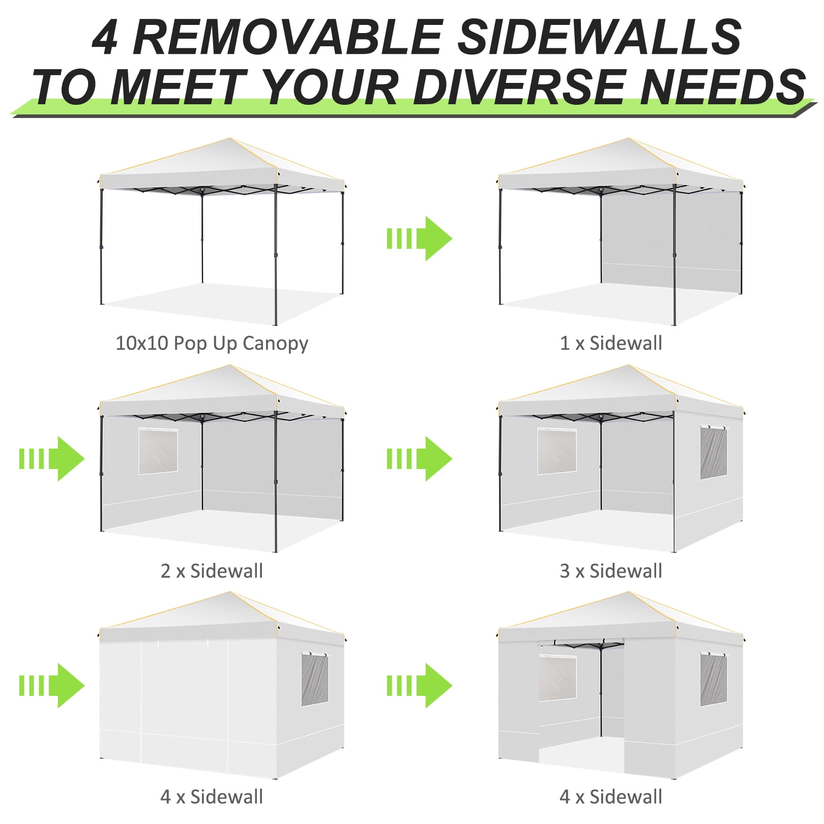 10x10ft Shade ?? Pop-Up Portable Design ?? Full-Stack Frame ?? High-Strength Steel Frame ?? Water-Resistant, Sun-Resistant And Uv-Resistant Oxford Cloth ?? Removable Side Walls ??None of this is a problem, SANOPY Pop up Canopy can meet all ! SANOPY 10 x 10 ft canopy consists of a one-step-install 25x25mm steel tent frame, waterproof canopy top, 4 removable sidewalls with windows and zippers, stakes and strong canopy rope, all of which fits into a carry bag Medium, easy to carry or store in luggage. This 10 x 10 canopy is easy to install, waterproof, windproof, UV resistant, sturdy and portable. What’s more, the canopy height can be set in high, medium or low height: 8.2′ / 7.87′ / 7.55′, the pop up canopy can accommodate more than 10 people with tables and chairs. The outdoor canopy can be used as party canopy, wedding canopy, Market canopy, backyard canopy, beach canopy and more.