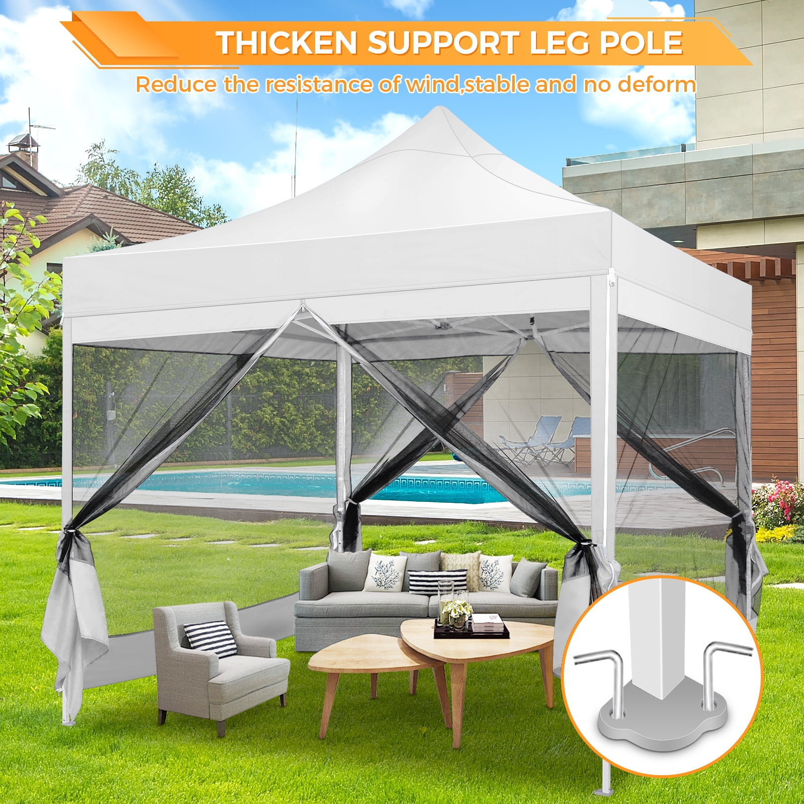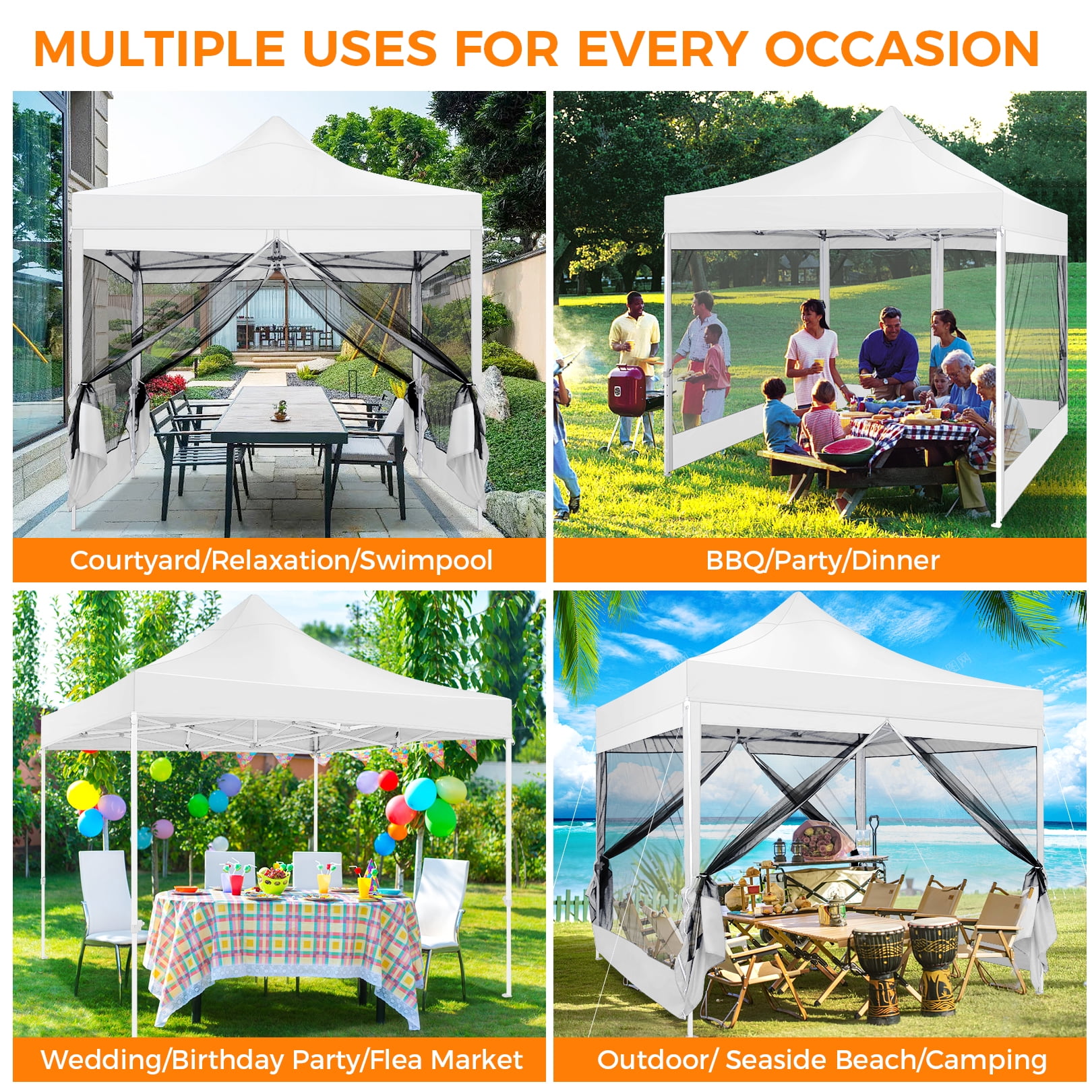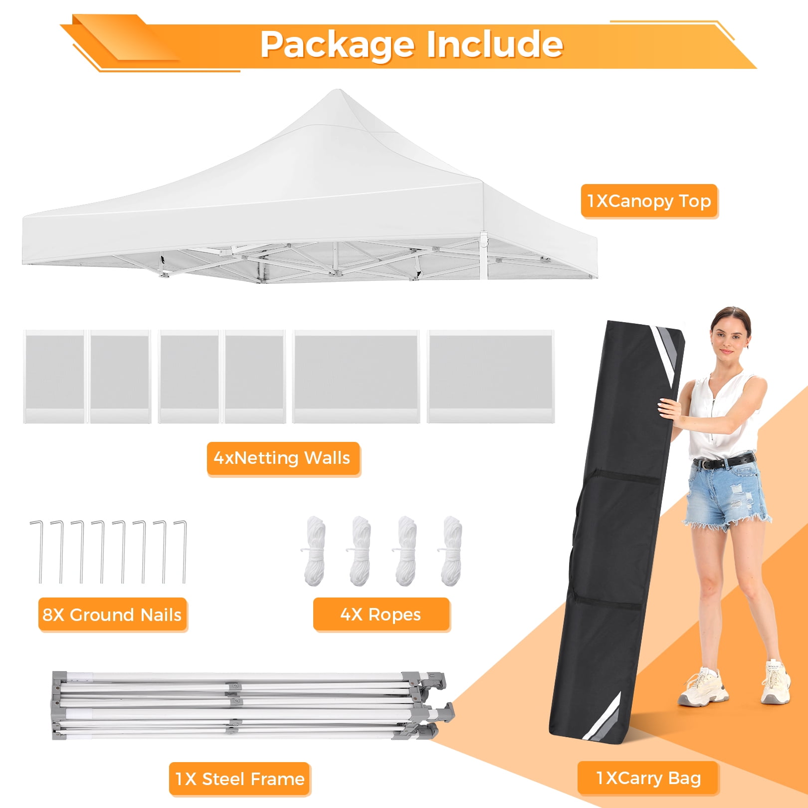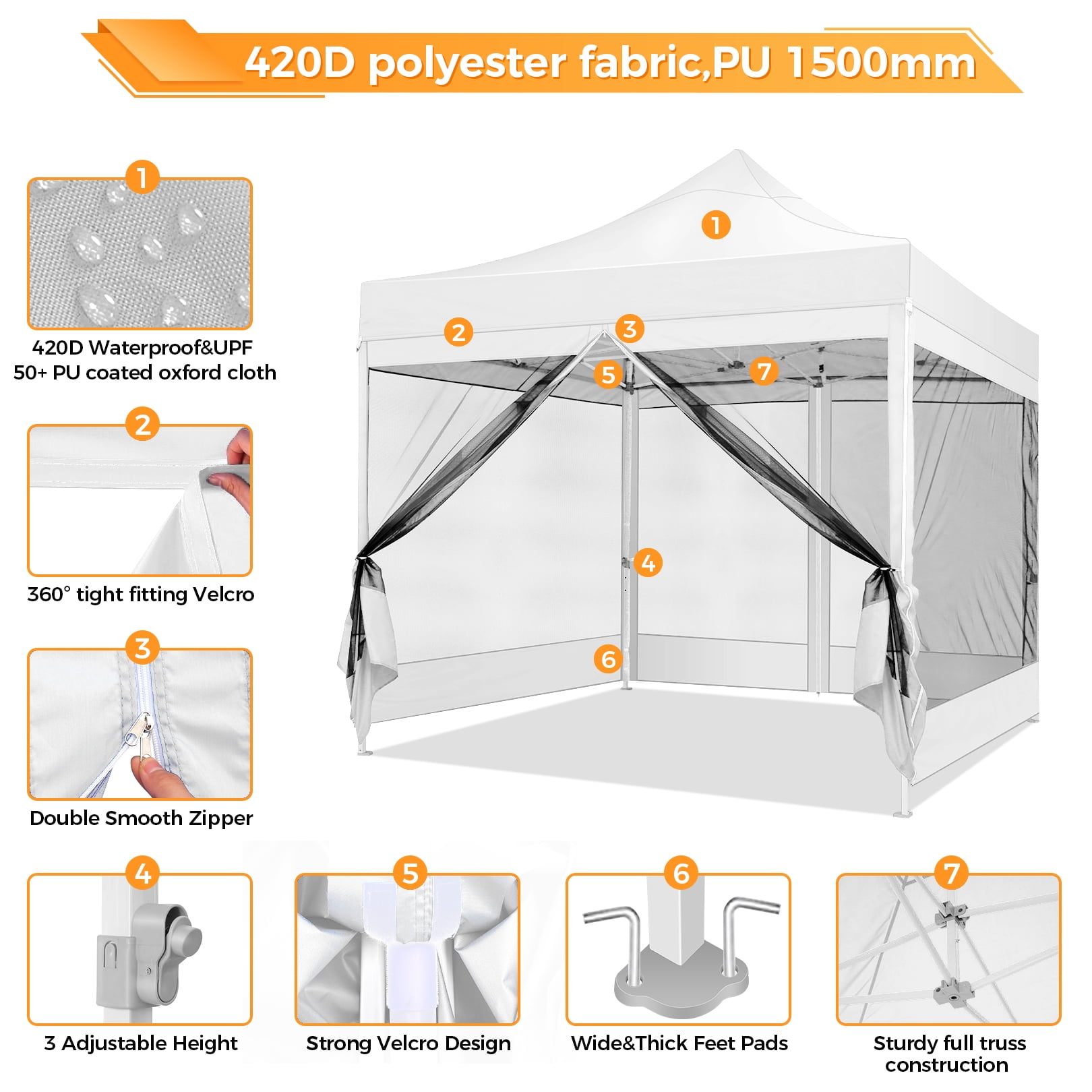 This 10x10FT Pop Up Canopy (Mesh Canopy) Highlights: 【Breathable and Mosquito-Proof】: This 10×10 FT Pop-up canopy features 4 removable mesh side walls, offering clear views and ample ventilation. The strength fasteners ensure protection from mosquitoes, providing a perfect natural space for your family. 【Upgraded Heavy Duty Frame】: The 10x10FT party canopy with sidewalls offers a heavy-duty frame with a full truss structure with a 23mm tube diameter. The 10×10 Screen tent middle support pole can bear up to 400 pounds. Powder-coated for rust-proofing, it ensures a lifespan more outlasting the plug-in tube tents in the market. 【Waterproof and UV-Protected】: Made from 420D Oxford fabric, our 10×10 canopy with netting is flame-retardant and UV-resistant, blocking 99% UV rays and reducing inside temperature by 5 to 10 degrees Fahrenheit. The PU waterproof coating and upgraded seam tapes offer a waterproof pressure of 2.1psi, twice the standard tents. 【Easy Setup, No Tools】: Covering 100 square Feet shade area, this 10×10 screened canopy can be swiftly assembled or disassembled by 2-3 people without tools, accommodating 10-15 people. The setup is as simple as laying the fabric on the pre-assembled frame and stretching the legs. 【Adjustable Height and Portable】: The 10×10 patio canopy’s height can be adjusted to 88, 92, or 96 inches, and the upgraded thumb latch system ensures easy adjustment without finger injury. The 10×10 party tent has a 600D Oxford cloth PVC-coated Carry bag for easy transportation. 【Packing List and Versatile Use】: Includes a 1 x heavy duty canopy tent frame, 1 x 420D Oxford Fabric top cover, 4 x sidewalls with mesh, 8 x ground nails, 4 x ropes, 1 x carry bag, 1 x instruction. It is ideal for parties, weddings, BBQs, trade shows, sporting, and outdoor events. Perfect for commercial spaces, playgrounds, patios, beaches, farms, etc. Outdoor Canopy Specifications: Color: Gray, Black, White, Blue, Khaki, Dark Blue Product Type: Anti-mosquito Pop-up canopy tent Size: 10×10×11FT Height Adjustable: 10.5FT-10.8FT-11FT Product Weight: 52 lb Weight Bearing: 400lbs Capacity: 10-15 people Waterproof: 100% Waterproof Sun Protection Index: UPF50+ Cover Material: 420D Oxford fabric Frame Material: High-Quality SteelRoller Bag Material: Oxford cloth Wide Usage: Perfect for Parties, Wedding, Camping, Storage, Shelter, marketing events, etc. Product Package: 1 x 10’x 10′ Pop up Canopy Frame 1 x 10’x 10′ Canopy Top 4 x Removable Sidewalls with mesh 1 x PVC-coated Carry bag 8 x Ground nails 4 x Wind Ropes(Black)