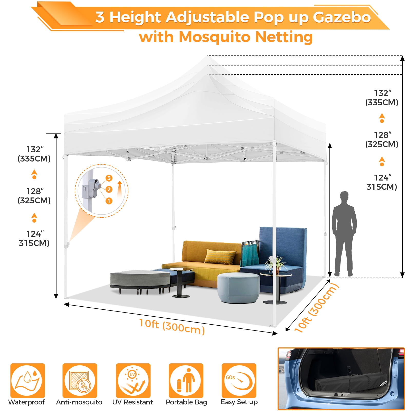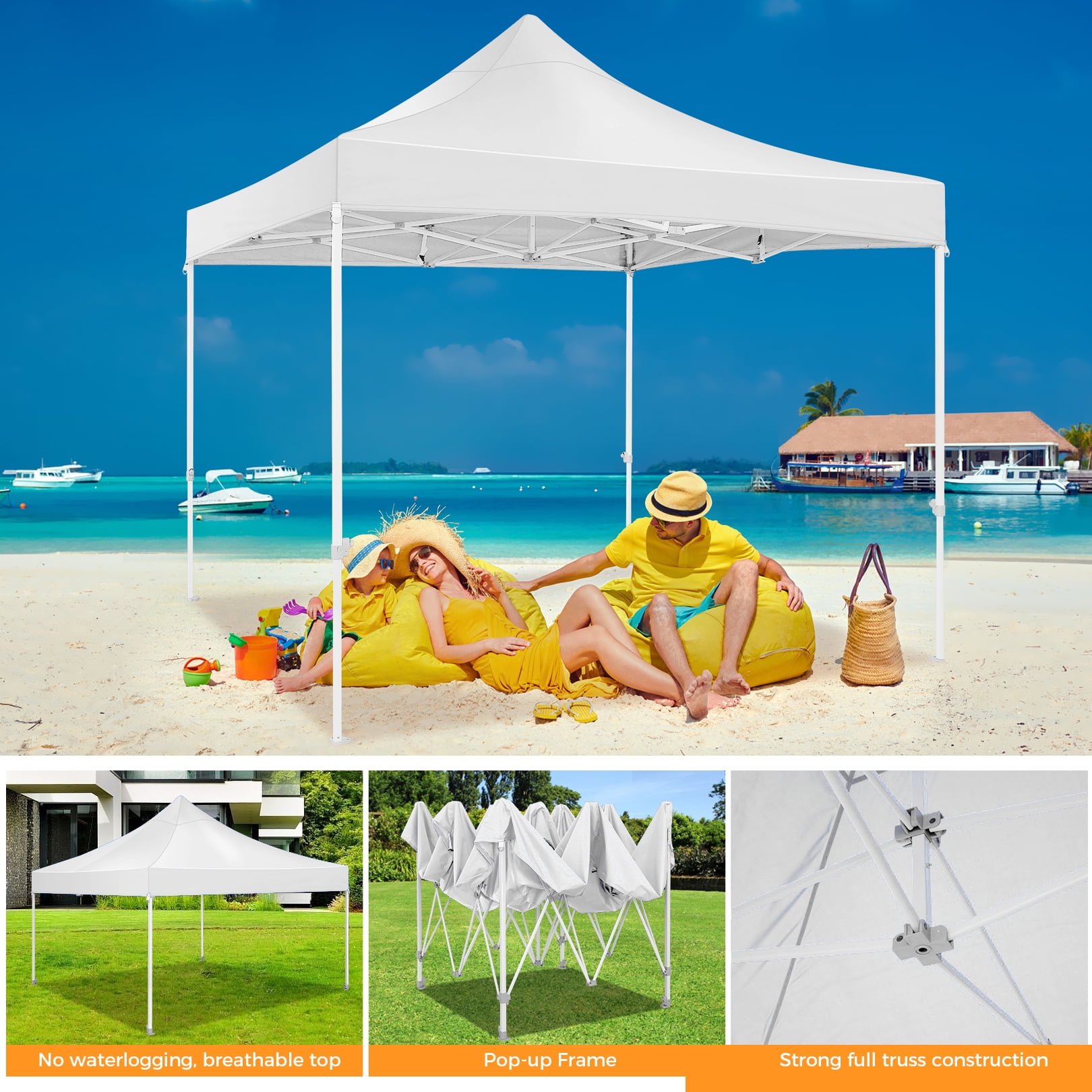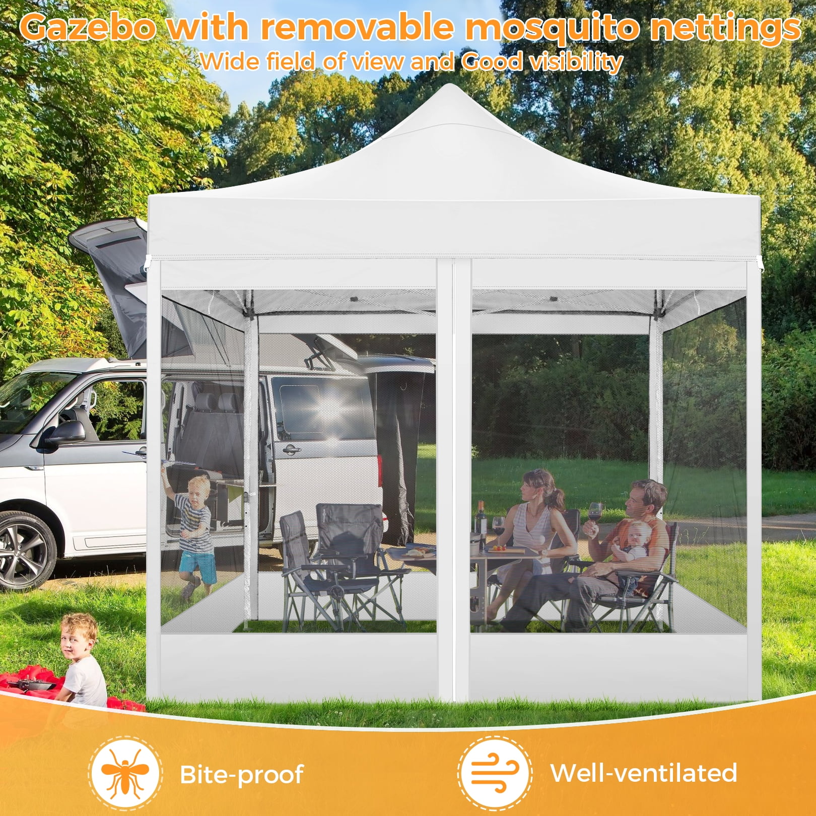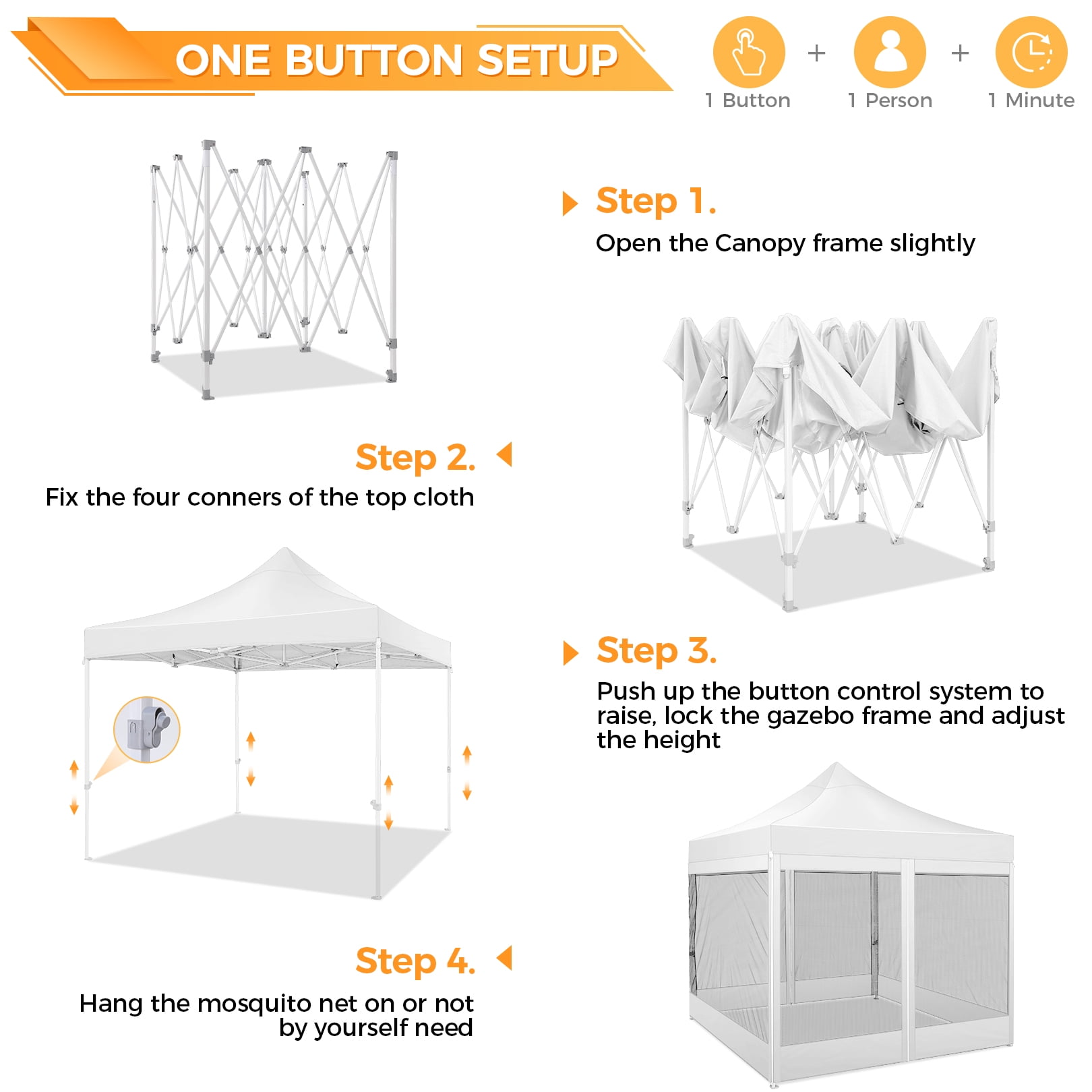 This 10x10FT Pop Up Canopy (Mesh Canopy) Highlights: 【Breathable and Mosquito-Proof】: This 10×10 FT Pop-up canopy features 4 removable mesh side walls, offering clear views and ample ventilation. The strength fasteners ensure protection from mosquitoes, providing a perfect natural space for your family. 【Upgraded Heavy Duty Frame】: The 10x10FT party canopy with sidewalls offers a heavy-duty frame with a full truss structure with a 23mm tube diameter. The 10×10 Screen tent middle support pole can bear up to 400 pounds. Powder-coated for rust-proofing, it ensures a lifespan more outlasting the plug-in tube tents in the market. 【Waterproof and UV-Protected】: Made from 420D Oxford fabric, our 10×10 canopy with netting is flame-retardant and UV-resistant, blocking 99% UV rays and reducing inside temperature by 5 to 10 degrees Fahrenheit. The PU waterproof coating and upgraded seam tapes offer a waterproof pressure of 2.1psi, twice the standard tents. 【Easy Setup, No Tools】: Covering 100 square Feet shade area, this 10×10 screened canopy can be swiftly assembled or disassembled by 2-3 people without tools, accommodating 10-15 people. The setup is as simple as laying the fabric on the pre-assembled frame and stretching the legs. 【Adjustable Height and Portable】: The 10×10 patio canopy’s height can be adjusted to 88, 92, or 96 inches, and the upgraded thumb latch system ensures easy adjustment without finger injury. The 10×10 party tent has a 600D Oxford cloth PVC-coated Carry bag for easy transportation. 【Packing List and Versatile Use】: Includes a 1 x heavy duty canopy tent frame, 1 x 420D Oxford Fabric top cover, 4 x sidewalls with mesh, 8 x ground nails, 4 x ropes, 1 x carry bag, 1 x instruction. It is ideal for parties, weddings, BBQs, trade shows, sporting, and outdoor events. Perfect for commercial spaces, playgrounds, patios, beaches, farms, etc. Outdoor Canopy Specifications: Color: Gray, Black, White, Blue, Khaki, Dark Blue Product Type: Anti-mosquito Pop-up canopy tent Size: 10×10×11FT Height Adjustable: 10.5FT-10.8FT-11FT Product Weight: 52 lb Weight Bearing: 400lbs Capacity: 10-15 people Waterproof: 100% Waterproof Sun Protection Index: UPF50+ Cover Material: 420D Oxford fabric Frame Material: High-Quality SteelRoller Bag Material: Oxford cloth Wide Usage: Perfect for Parties, Wedding, Camping, Storage, Shelter, marketing events, etc. Product Package: 1 x 10’x 10′ Pop up Canopy Frame 1 x 10’x 10′ Canopy Top 4 x Removable Sidewalls with mesh 1 x PVC-coated Carry bag 8 x Ground nails 4 x Wind Ropes(Black)