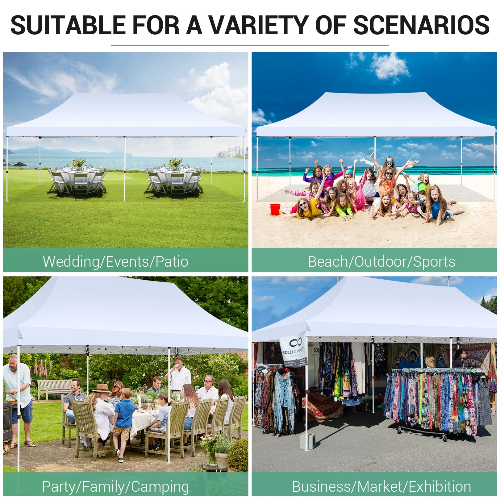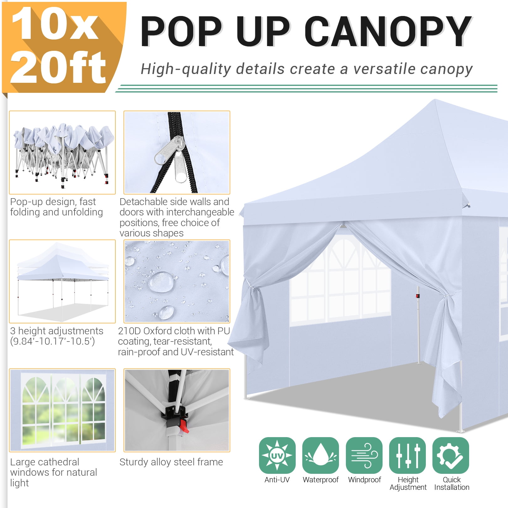 Canopy Highlights: Durable PU coated roof oxford fabric, 50+UV protection, water-resistant. Our pop up canopy tent has a sturdy design and sturdy columns to increase stability. Multi-purpose pop-up canopies are perfect for the food vendor, booth, tradeshow, fairs, market, family gatherings, picnics, and camping. The disassembled frame can be put into a bag together with the ceiling for easy carrying. This is a waterproof shed, especially suitable for outdoor use, and can protect you from the sun and rain. Why choose our SANOPY canopy? 【Canopy Wide Coverage】: The garden gazebo is 20 feet long and 10 feet wide, with 200 square feet of shade, you can use our pop-up canopy, invite 15-20 friends, hold a BBQ, cocktail party, or bring Our family goes on beach vacations and sunbathes. 【Excellent Material and Performance】: This outdoor canopy tent is made of 210D waterproof Oxford cloth with PU coating, the waterproof pressure can reach 1000pa, effectively resist ultraviolet rays, suitable for sunny and rainy days. 【Easy to Assemble】: The portable pop up canopy tent with carrying bag can be easily used outdoors, only 2-4 people can easily complete various setups. Our shade tents easily attach to vegetation, beaches and floors. 【3 height adjustments】: This canopy tent has 3 height adjustment functions, the adjustable height is 9.84′-10.17′-10.5′ (canopy height), and this canopy is designed with a hollow canopy, which is more spacious and more open. The canopy height is about 40cm higher than ordinary tents, and the space inside the tent does not feel cramped and low at all. 【Large-Sized Church Windows】: This canopy has 4 super-sized church-looking windows, which are convenient for lighting and ventilation, and you can also get close to nature in the tent. 【Freely Assembled Windows & Doors】: Our canopy comes with 4 side walls with windows and 2 side walls with zippers. The doors on the side walls can also be rolled up. They are easy to assemble or disassemble, interchangeable positions, free assembly, can be installed in front, rear, left and right positions, ours has greater versatility and ventilation, suitable for all seasons. 【Complete set of accessories】: The anti-rust and corrosion-resistant steel canopy frame is strong, equipped with 12 L-shaped ground nails, 6 ropes, which can firmly fix the canopy on the ground, and a carrying bag, you can easily Easily take this canopy anywhere. 【Multipurpose Commercial Canopy】: This canopy can be used for outdoor sports, weddings, events, festivals, flea markets, gardens, parties, beaches and playgrounds, enjoy a wonderful holiday with your family and friends. Specification: Color: White/Blue/Brown/Black Size: 10x20ft / 300x600cm 3 height adjustments: 9.84′-10.17′-10.5′ (canopy height) Package weight: 60lbs/27kg Fabric: 210D Oxford cloth with PU coating Frame: Powder-coated metal frame Capacity: Can accommodate 15-20 people Accessories: 12 L-shaped nails + 6 ropes + handbag Package list: 1 X pop-up frame 1 X canopy top 4 X PE church windows 2 X doors with zippers 12 X L-shaped ground nails 6 X Rope