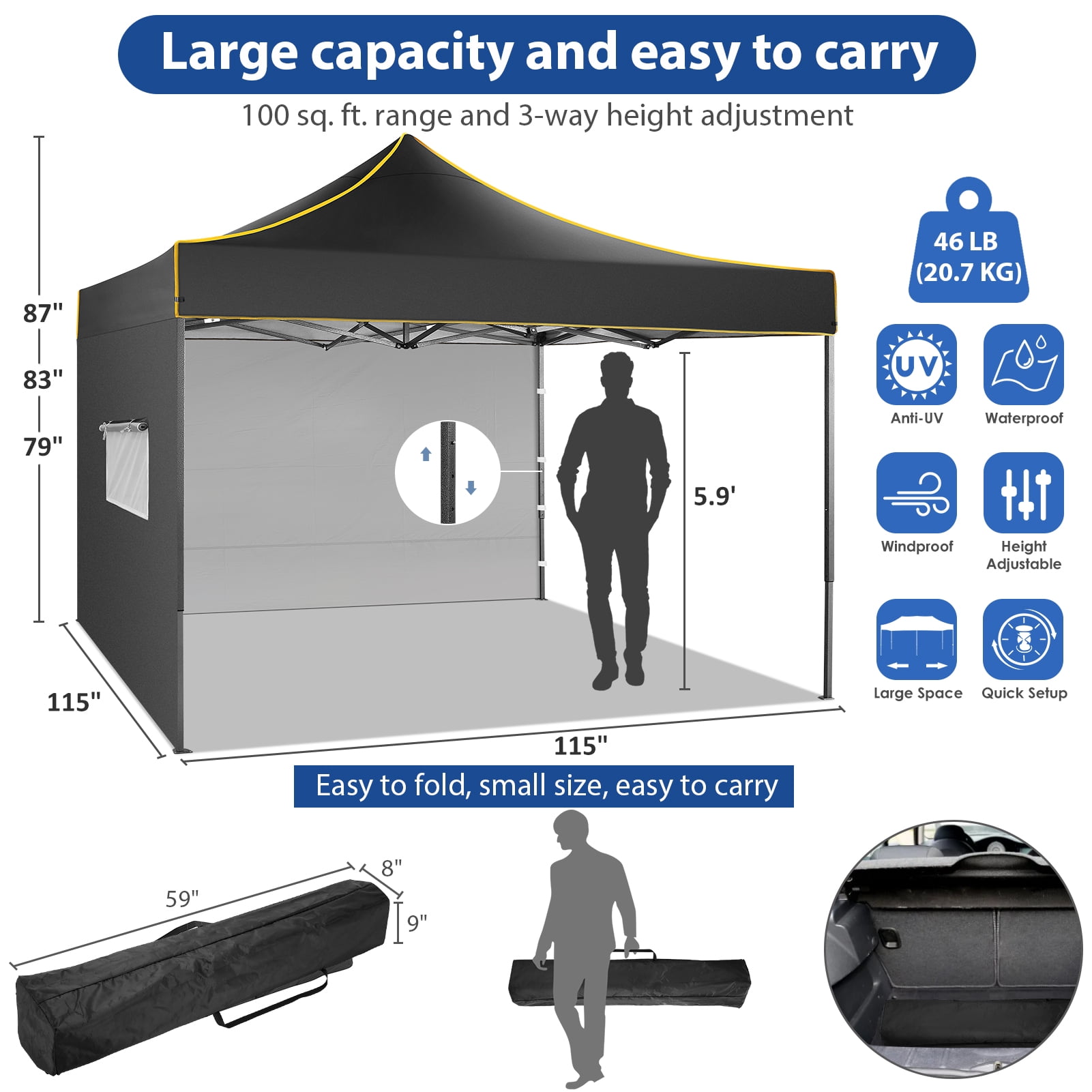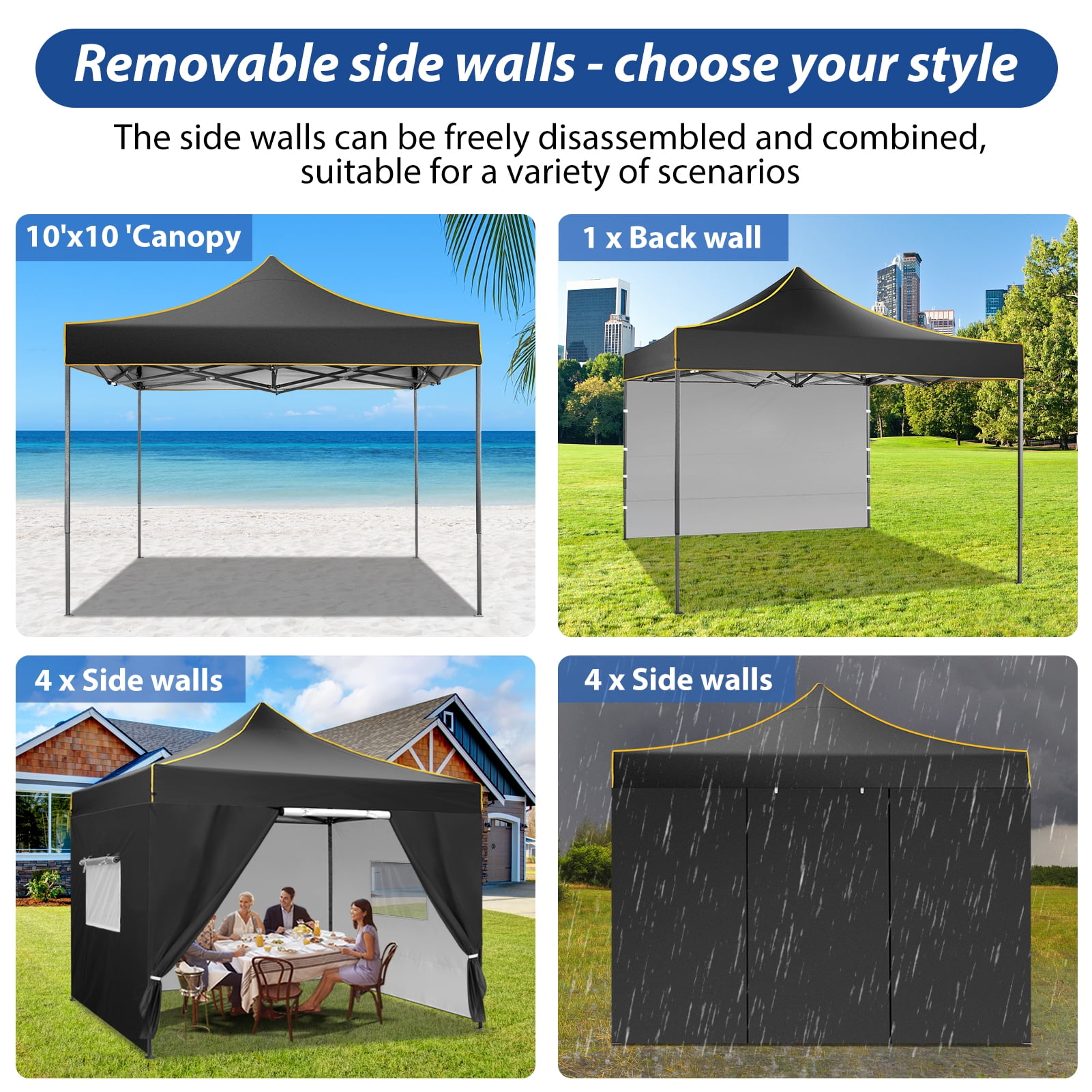 Key Features: 【Large size & portable】- This party canopy has a shade coverage of 10 x 10 feet and can accommodate 4 tables or 6-10 people at the same time. This canopy is available in three heights: 79’/83’/87′. This backyard tent frame folds up in seconds and comes with a convenient carry bag for easy transport, on-the-go, and storage. 【3 Adjustable Height】- Each leg has up and down quick release buttons for easy height adjustment: (Eaves 3 heights available: 79″/83″/87″)(canopy top 3 heights available:122‘’/125″/129″), spire canopy design, about 40cm higher than ordinary tents, the interior space is open and spacious. Don’t worry about pinching your fingers. 8 stakes and 4 ropes will help keep this instant canopy tent more stable and sturdy. 【4 Removable Side Walls】- This pop up canopy tent with side walls comes with 1 back wall, 1 zipper door and 2 side walls with mesh windows, the mesh windows of the easy-up canopy allow fresh air and light to enter, It also offers protection against mosquitoes. Zippered doors can be rolled up and down for ventilation or privacy. 【Easy Setup】- Easy 4-step setup helps to get this pop-up canopy open, open the frame, cover it with fabric, use the thumb button to adjust the height easily, then snap into place, attach the side walls as needed . 【Sunscreen and Waterproof】- The canopy’s camping tarp is made of high-density 410D Oxford polyester with a special silver-plated PU lining, 100% waterproof, UPF 50+, which can block 99% of harmful sun rays. 【Sturdy and Durable】- The sunshade canopy tent is made of anti-rust powder-coated steel frame and waterproof 410D Oxford cloth cover. Upgrade strong reinforcement parts, 4 metal legs, size 30x30mm, thickness 0.6mm. Comes complete with ropes and stakes to increase the wind stability of your 10×10 pop up tent. Great for parties, business, events, picnics, beach, camping, tailgates, backyard events and more! Specification: Tent frame material: powder coated alloy steel, plastic Canopy Material: 410D Oxford Cloth with PU Coating (UPF 50+) Leg tube: 30X30X0.6MM Adjustable height: 87′, 83′ and 79’(Canopy Top122‘’/125″/129″) Packing size: 154x22x25CM Maximum Dimensions: 10 x 10 x 8.5 feet