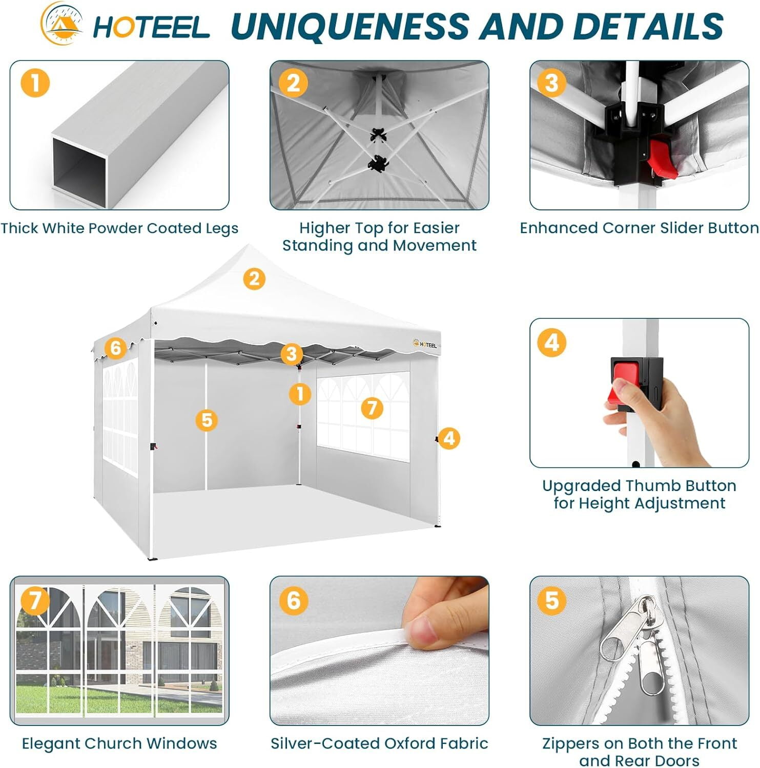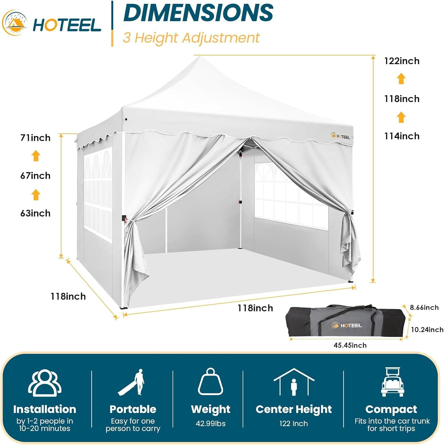 Canopy Highlights: Wavy decorative strips, high-top arc design, a variety of color options, the appearance is beautiful, modern and elegant. Large-size PVC church windows, with high light transmittance, good lighting, and brighter interior of the canopy. A full set of accessories, such as ground nails, sandbags, wind ropes, and roller bags, can meet your various needs. The side walls and windows can be freely assembled and disassembled, their positions can be exchanged at will, and they can be assembled into various forms. The versatile pop-up canopy is perfect for yards, lawns, fairs, beaches, gardens, for hiking, camping, fishing, parking, picnics and family outings. Superior Quality: 10×10 Pop up canopy features an oxford cloth top with a silver coating and a durable alloy steel frame. The silver-coated fabric reflects UV rays for sun protection and keeps the interior cooler. It’s tear-resistant and abrasion-resistant for long-term use. Water-Resistant Design:The extended ceiling and high peak design facilitate rainwater runoff, preventing pooling. Ideal for outdoor events like farmers markets and tailgating. Easy Setup and Storage:Adjustable to three heights—114 inches, 118 inches, and 122 inches—10 x 10 pop up canopy tent can be set up by 1-2 people without tools. Detailed installation videos and instructions are provided. Contact us if you encounter any issues during setup. Portable and Compact:Offering 100 square feet of shade, this 10×10 canopy can accommodate up to 10 people. When packed, it measures 45.45″ x 8.66″ x 10.24″, fitting easily in most car trunks. Package Includes:1 straight leg canopy, 4 weight bags, 4 stakes, 4 ropes, and 1 instruction manual. Compact enough for easy transport to tailgates, the beach, the park, or wherever your adventure takes you. Specification: Color: White/Blue/Black/Grey/Khaki Tent frame material: powder coated steel frame, plastic Canopy material: 210D Oxford cloth Tote bag material: 300Dx600D Oxford cloth Leg tube: 30X30X0.6MM/25X25X0.6MM Top Tube: 5x 0.55mm Adjustable height: 114”-118”-122” Extended Dimensions: 10 x 10 x 10.2 feet Packing List: 1 x commercial pop up canopy frame 1 x 10×10 canopy 4 x Sidewalls 4 x oxford cloth sandbags 10 x ground spikes 4 x ropes 1 x bag with wheels 1 x manual