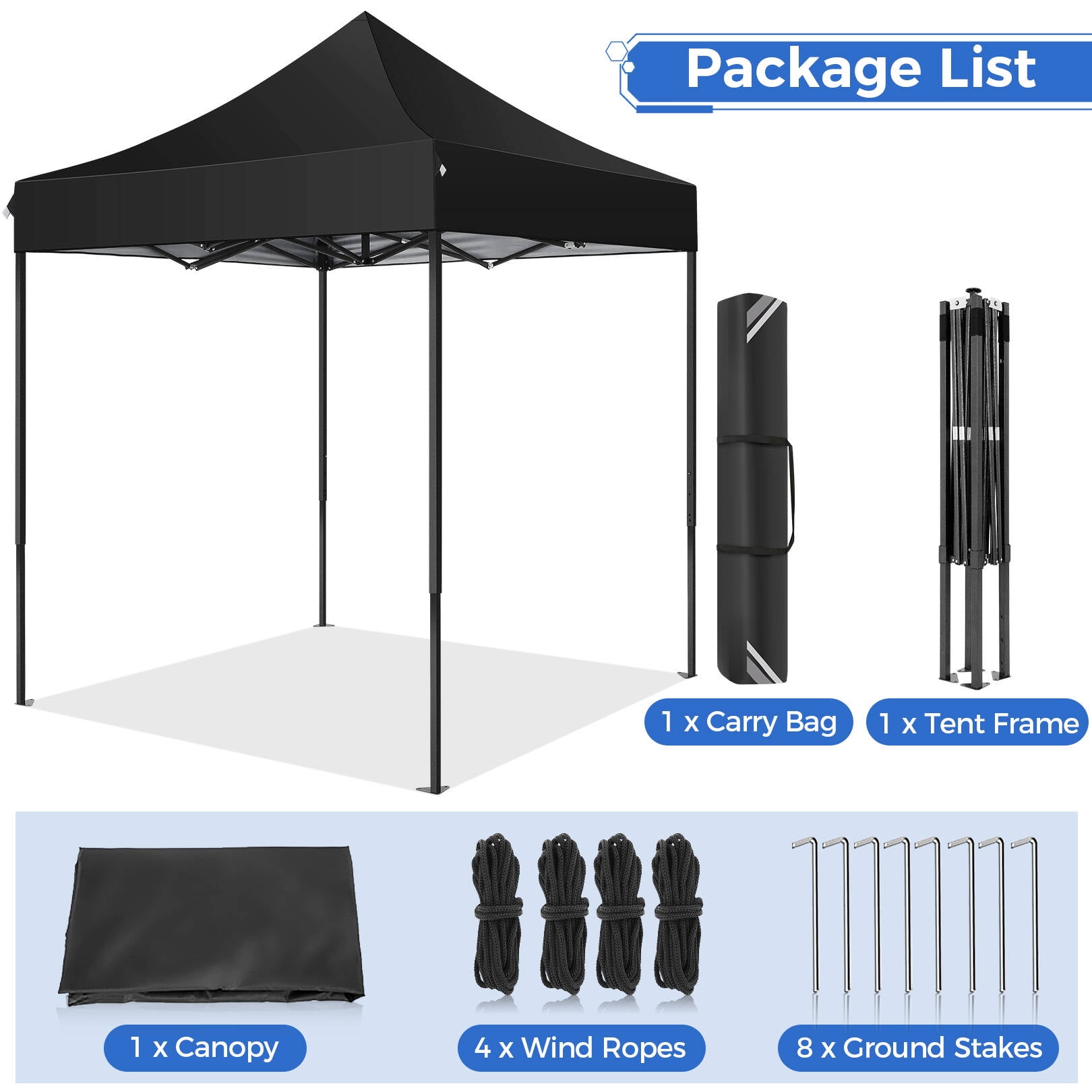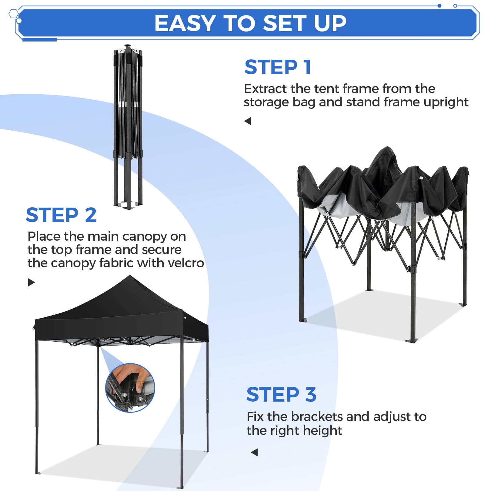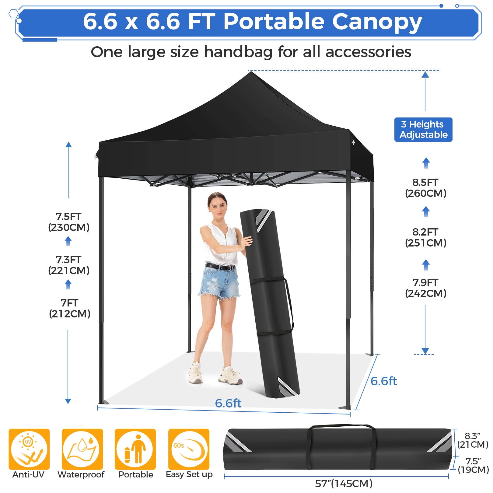 Choose our pop-up canopy tent: ——Easy Pop-up & Wind Resistance: 2 people can pop up and take down this portable canopy in minutes without any tools. The rust & corrosion-resistant steel tent frame is sturdy, coming with 8 tent stakes and 4 ropes to fasten the party canopy making it stable and sturdy in the wind and rain. ——Waterproof & UV Protection: The EZ pop-up instant canopy are made from white silver-coated 420D Oxford cloth, featuring water resistant and anti-UV, providing 100 Sq ft of shade, protecting you from sunburn, and rain when having a party with friends in the backyard or beach. ——6.6 x 6.6 Ft & 3 Height Adjustable: This outdoor canopy height can be adjusted from 7.5′ to 8.5′ easily. This party canopy can hold about 15 people with a table & chairs. ——Easy to Pack & Storage: The pop-up canopy pack size is 46.8″x 8.2″ x 8.2″, and the folding tent can be placed into the trunk conveniently. ——Household Use & Commercial Use: applicable in Hiking, Camping, Fishing, picnics, and Family outings & available for sporting events, small businesses, arts and crafts fairs, and trade shows. Party Canopy Specifications: Color: White/Blue/Black Tent Frame Material: Powder-coated Steel Frame, Plastic Canopies Material: 420D Oxford Cloth Carry Bag Material: 300D Oxford Cloth Foot Tube: 25X25X0.6MM/20X20X0.6MM Top Tube: 5x 0.55 mm Adjustable Height: 7.6 – 8.3 FT Expanded Dimensions: 6.6 x 6。6 x 8.3 FT Packed Dimensions: 46.8″” x 8.2″” x 8.2″” Canopy Package Content: 1 x Canopy Top 1 x Tent Frame 8 x Stakes 4 x Rope 1 x Carry Bag 1 x User Manual Ourdoor Canopy Key Features: Durable PVC coated roof oxford fabric, 50+UV protection, water-resistant. Our pop-up canopy tent has a sturdy design and sturdy columns to increase stability. Multi-purpose pop-up canopies are perfect for food vendors, booths, tradeshows, fairs, markets, family gatherings, picnics, and camping. The disassembled frame can be put into a bag together with the ceiling for easy carrying. This is a waterproof shed, especially suitable for outdoor use, and can protect you from the sun and rain. If you are not satisfied or dissatisfied with the product you received, you can refund unconditionally. Please rest assured to buy. Our after-sales service team provides 24-hour service. If you have any questions or problems, please contact us by email, and we will reply as soon as possible and find a solution.