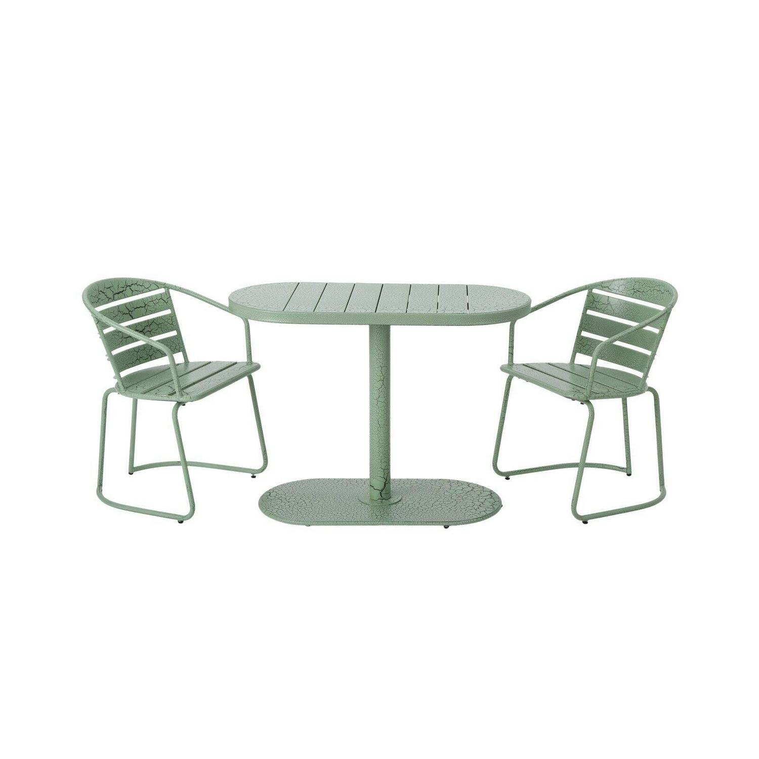 Lend your patio an antique flair with the Santa Monica Iron 3 Piece Outdoor Bistro Set. This bistro set offers a wide oval-shaped table and two matching chairs. The frames are each crafted from tough iron with a powder-coated finish to prevent rust formation. A cracked design lends a vintage charm without affecting the integrity of the frames. The backrests, seats, and top are all accented with a slatted design. Choose among available color options.