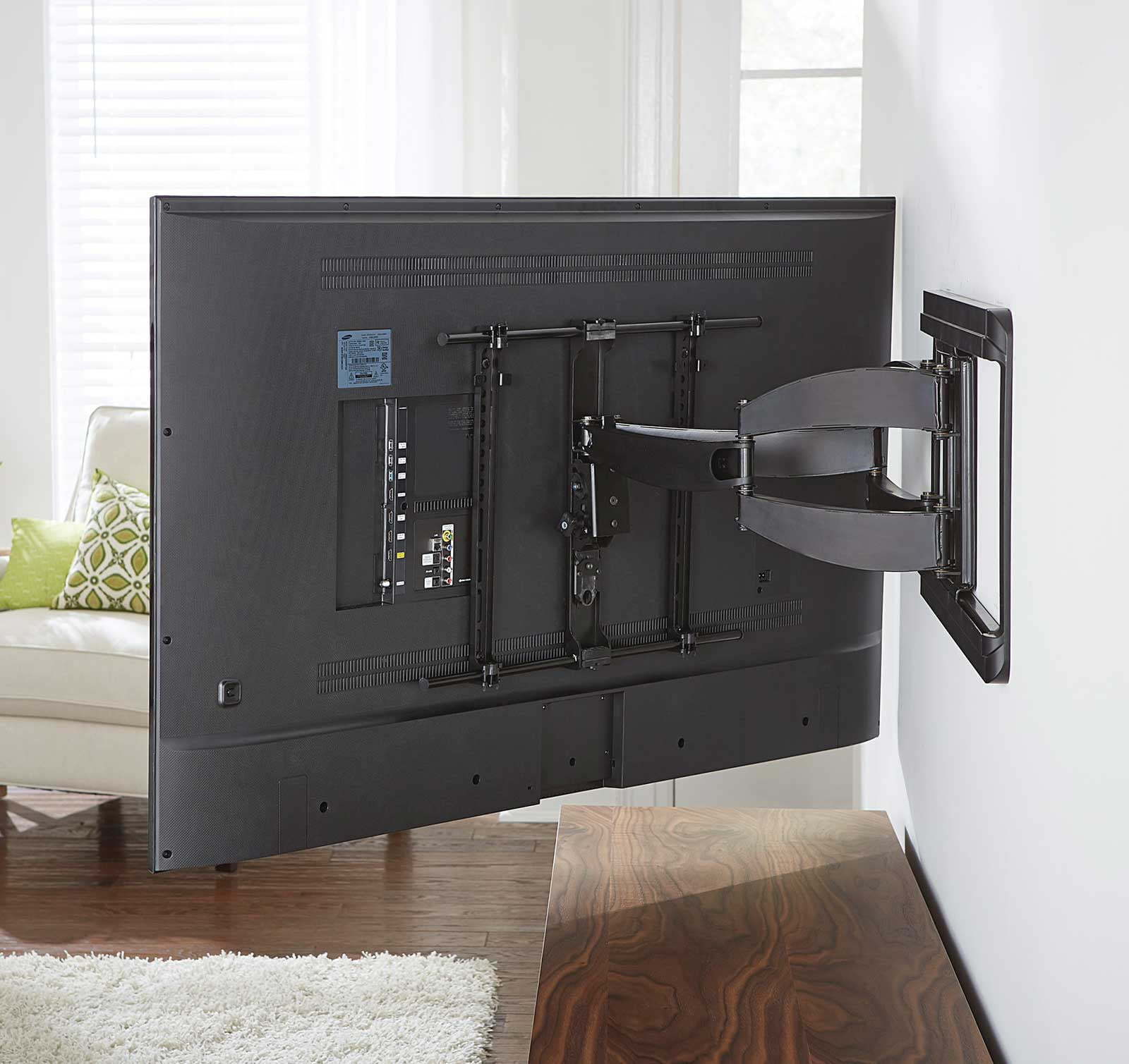 The Sanus VLF628 full-motion+ TV wall mount lets you enjoy a great picture no matter where you watch. This TV mount fits TVs 46″-90″. You can tilt, swivel, extend and level your TV without the need for tools. Unsightly cables stay concealed, and tool-free assembly ensures a quick and easy installation. TV can slide from side-to-side for perfect positioning on the wall, and safety tab provides a safe and easy connection you can hear.