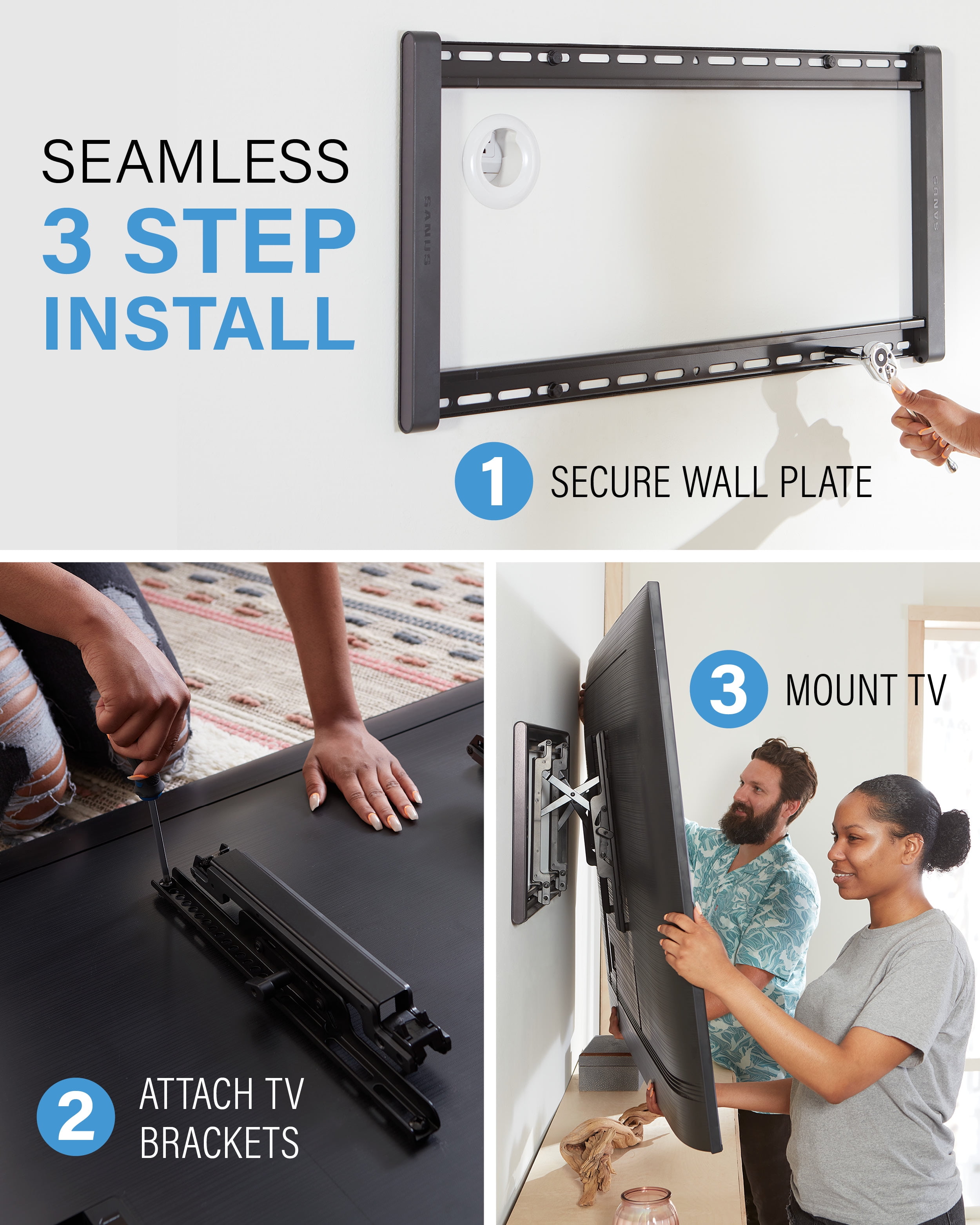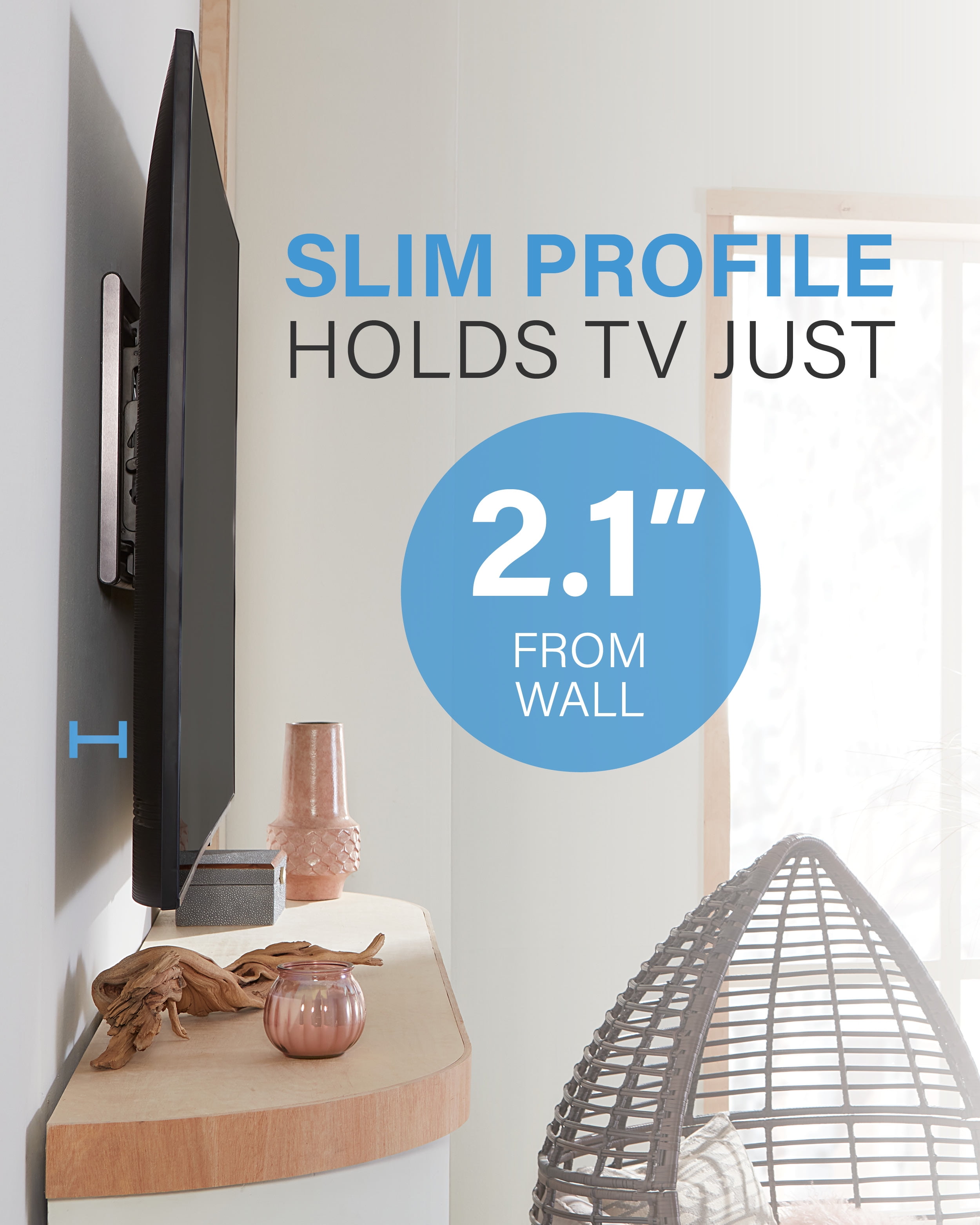 Slim profile seamlessly places TV just 2″ from the wall and blends with TV & decor