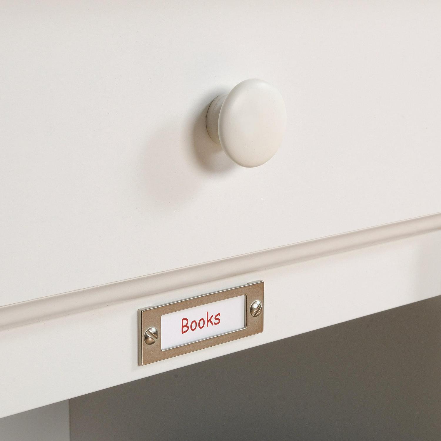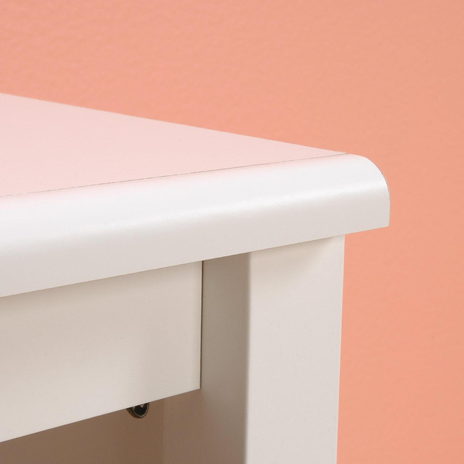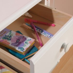 Create a versatile work space that’ll inspire and motivate your child with this desk from the Pogo collection. Its spacious top surface provides your child with ample amount of room to work on their homework or draw in a coloring book while still having space for items like an accent lamp, picture frames, toys and more! It features a storage drawer that opens and closes on smooth metal runners for convenient and easy access storage of items like colored pencils, stickers, notebooks and other miscellaneous items. It also includes a large storage bin for your child to store their games and stuffed animals. This storage bin includes an ID tag for easy labeling and organization of your child’s belongings. It’s detailed with whimsical curves and a solid wood knob to add an extra touch of fun to your child’s room. Finished in Soft White, this adorable desk is just what your child needs.