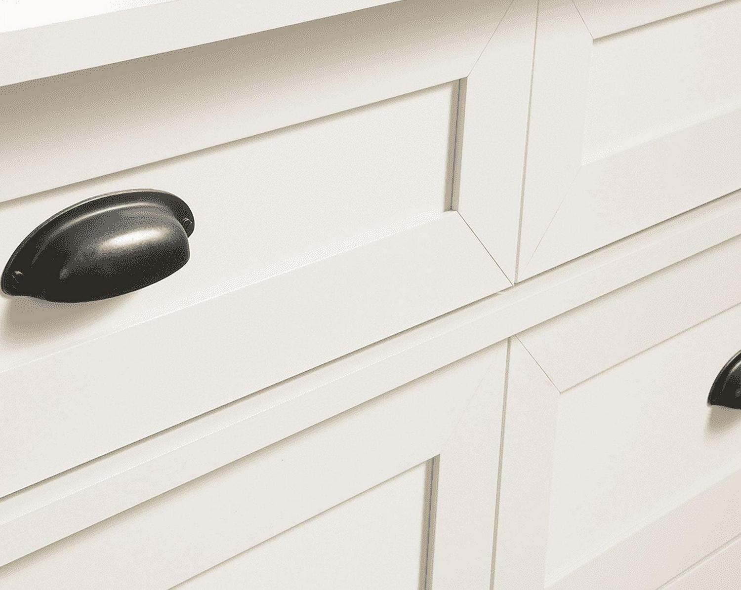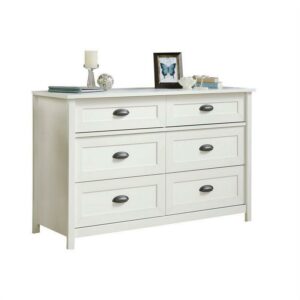 Easily organize your clothes and accessories with this dresser from the County Line collection. It features six drawers that open and close on smooth metal runners. The four lower drawers are extra deep so you can store all your blouses and blue jeans. Finished in Soft White, this charming dresser adds countrified style do your bedroom d cor.