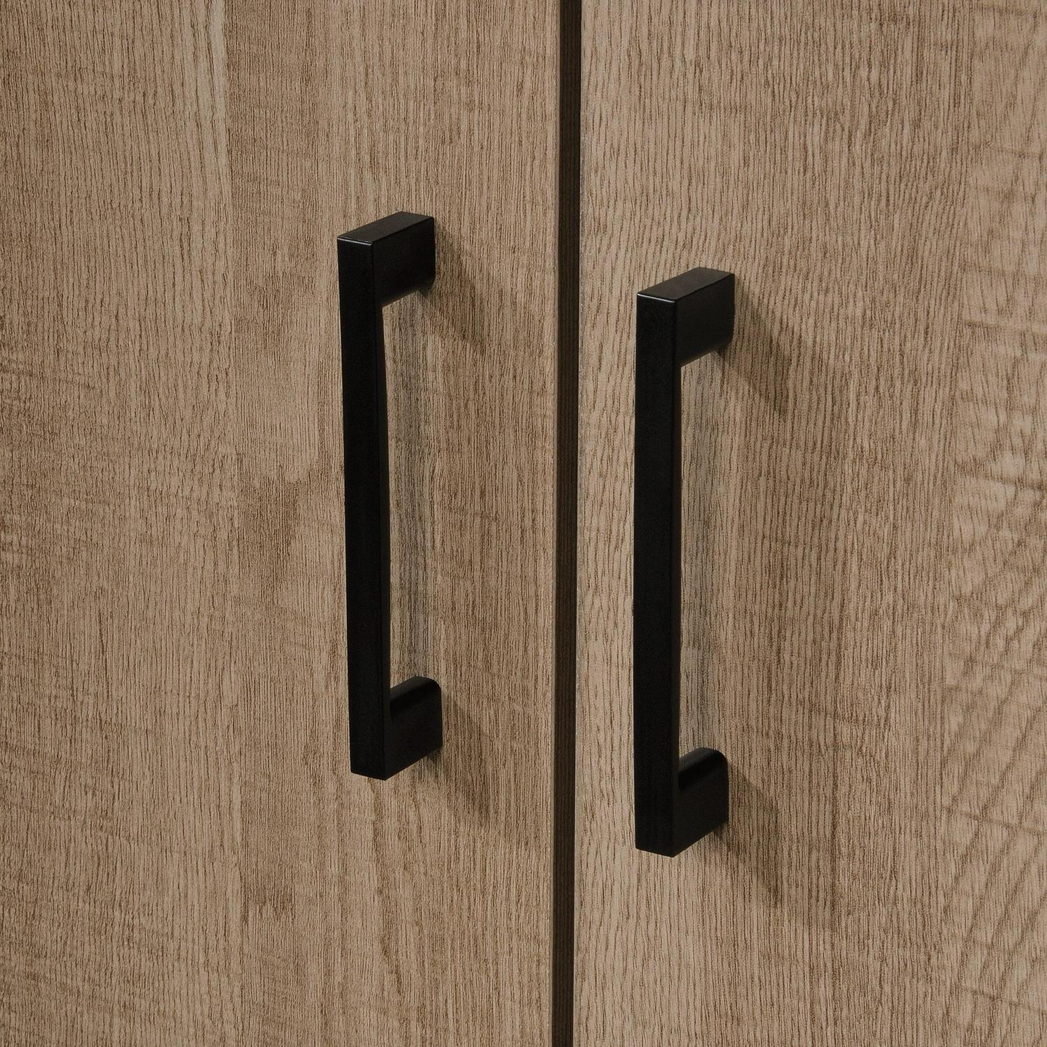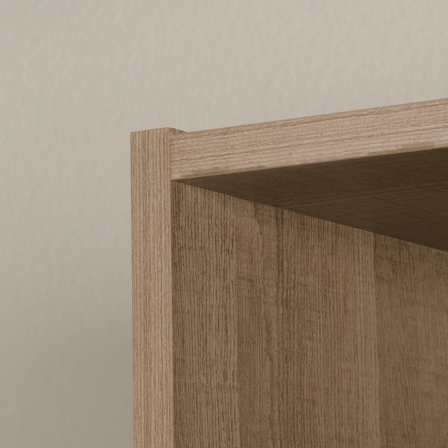 - Open shelving features two adjustable shelves and one fixed shelf for flexible storage options