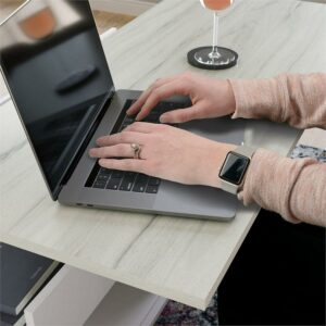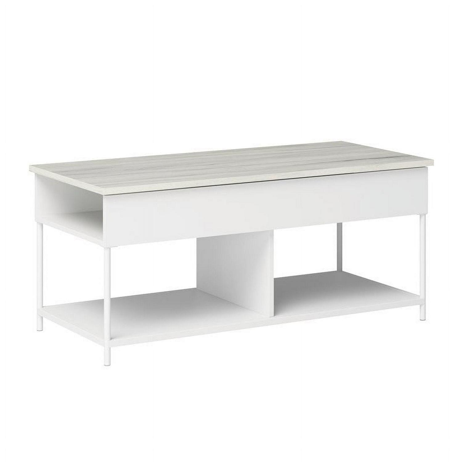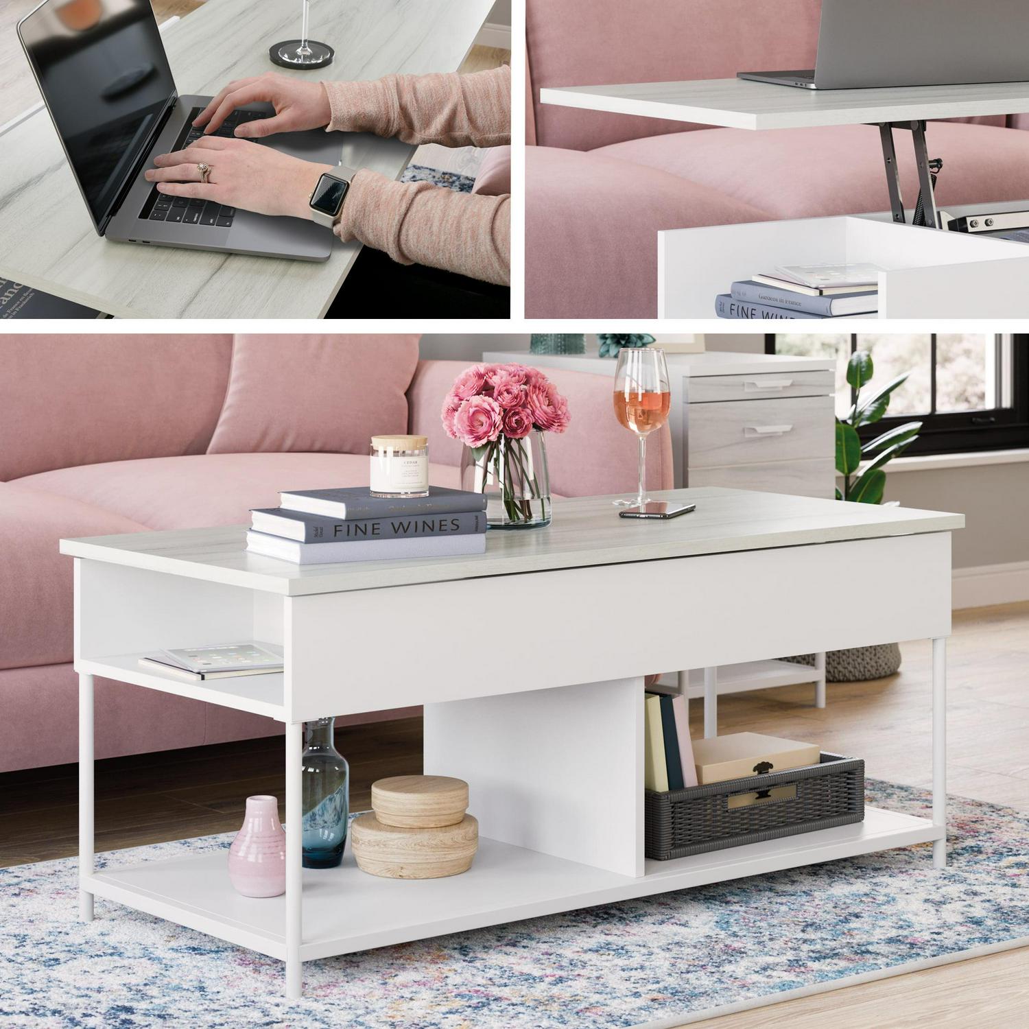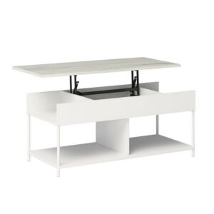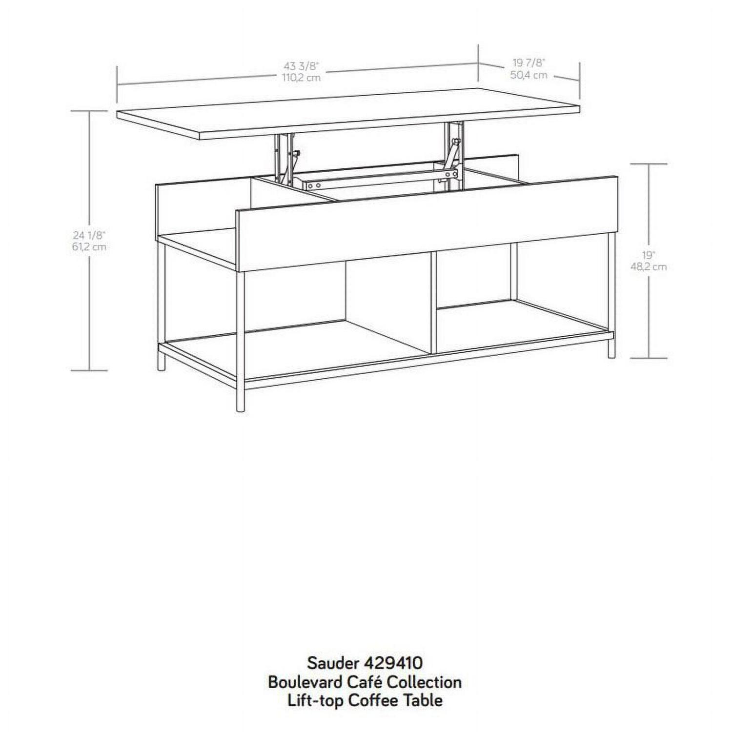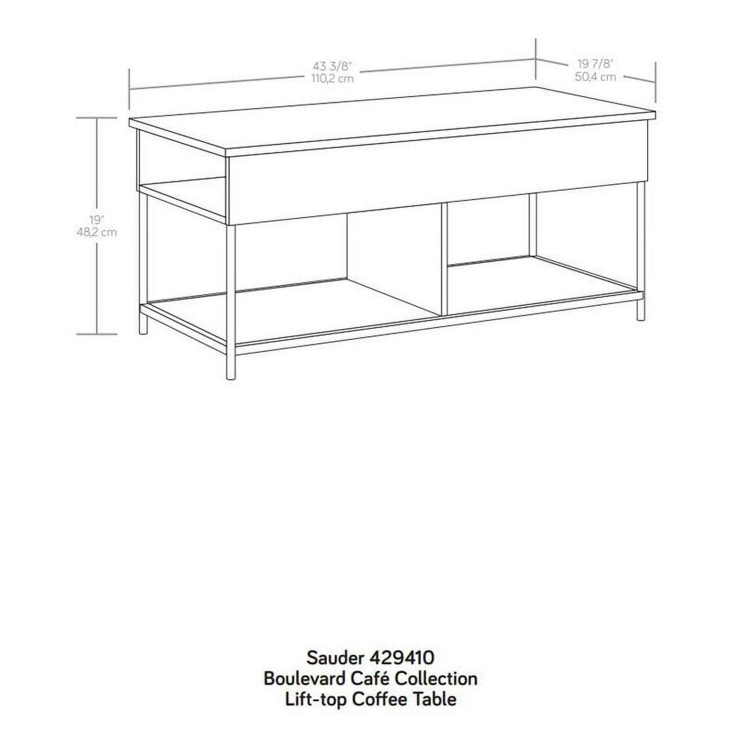 Transform your living room into an active space where memories are made from playing games, lounging with family, and more. This lift-top coffee table from the Boulevard Cafe collection will convert your living room or den into one of those magical, memory-making spaces. This coffee table with open storage features a top that lifts up and forward to create a versatile work surface for activities like snacking or playing board games. A divided area underneath the top of this lift-top coffee table with storage is the perfect hidden space for items like remotes, instruction booklets, and more. Open side access for additional storage beneath the lift top of this coffee table holds books, magazines, collectibles, and more. A lower additional shelf for storage and display of blankets, collectibles, or organizing bins is another multifunctional feature of this pop-up coffee table. Finished on all sides for versatile placement in any room of your home, this coffee table with lift top looks great from every angle. With a durable, white powder coated metal frame with Haze Acacia accents, this coffee table with lift-top has enough features to impress anyone, and it looks good doing it.