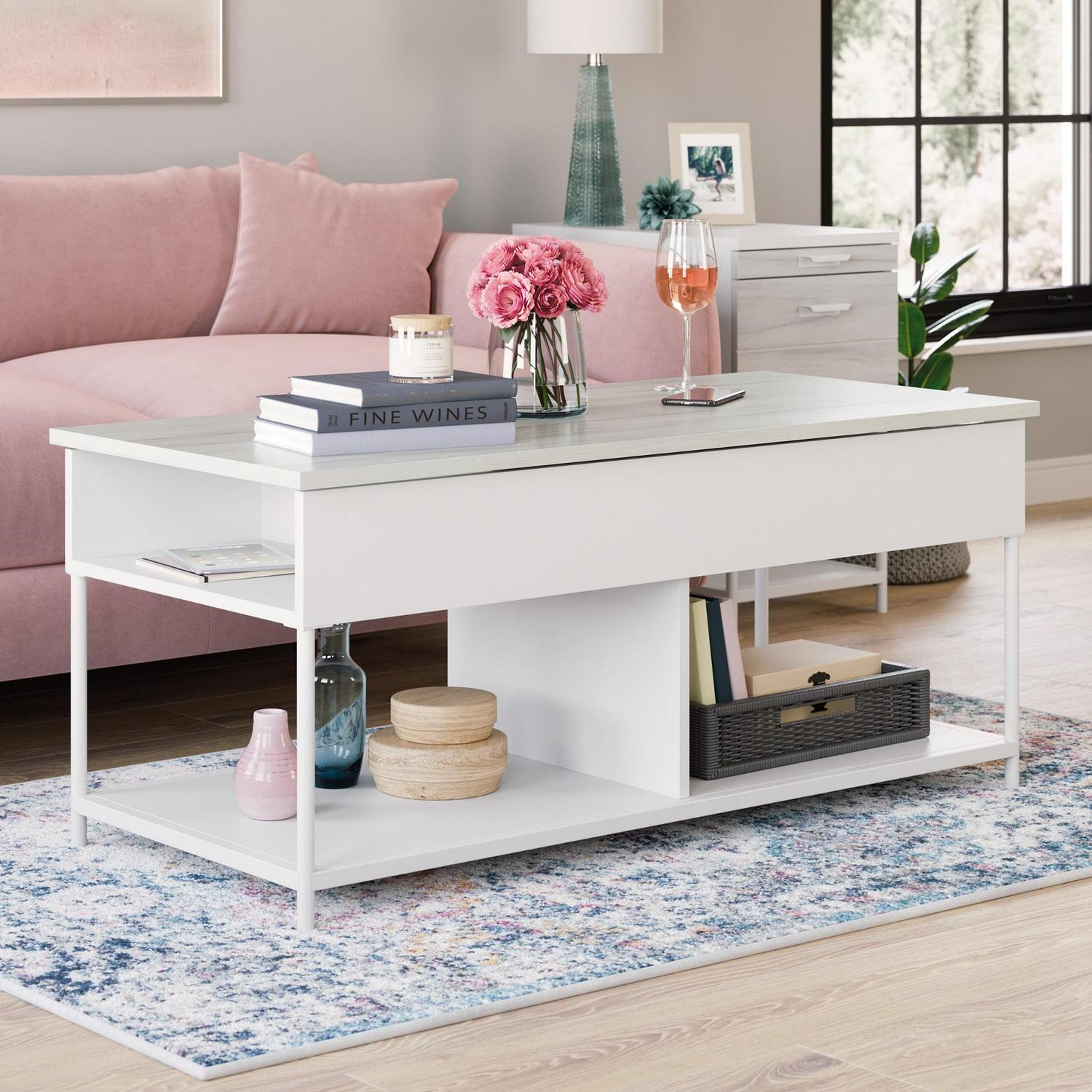 – Sauder Boulevard Cafe Lift-Top Coffee Table with Open Shelves, White Finish:
