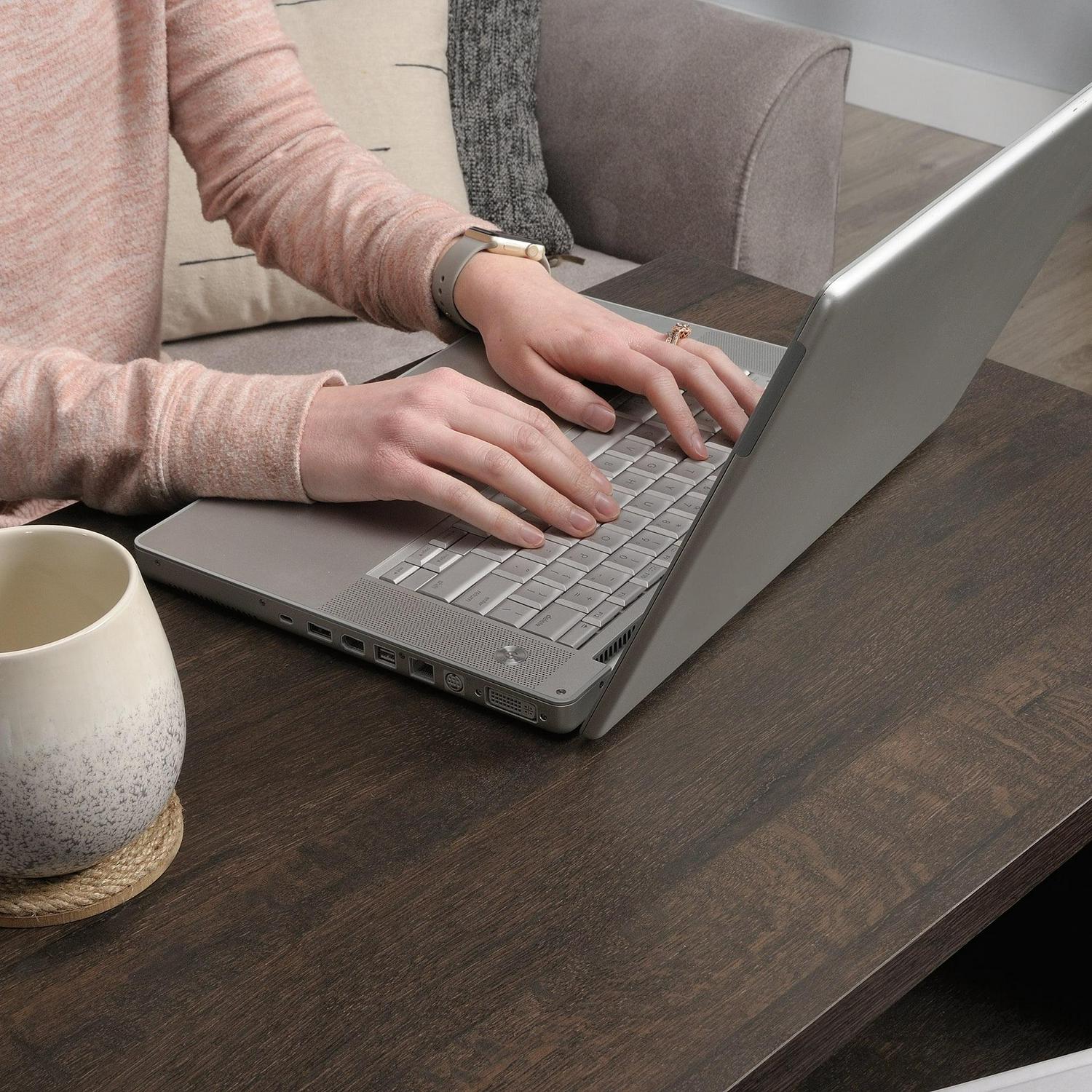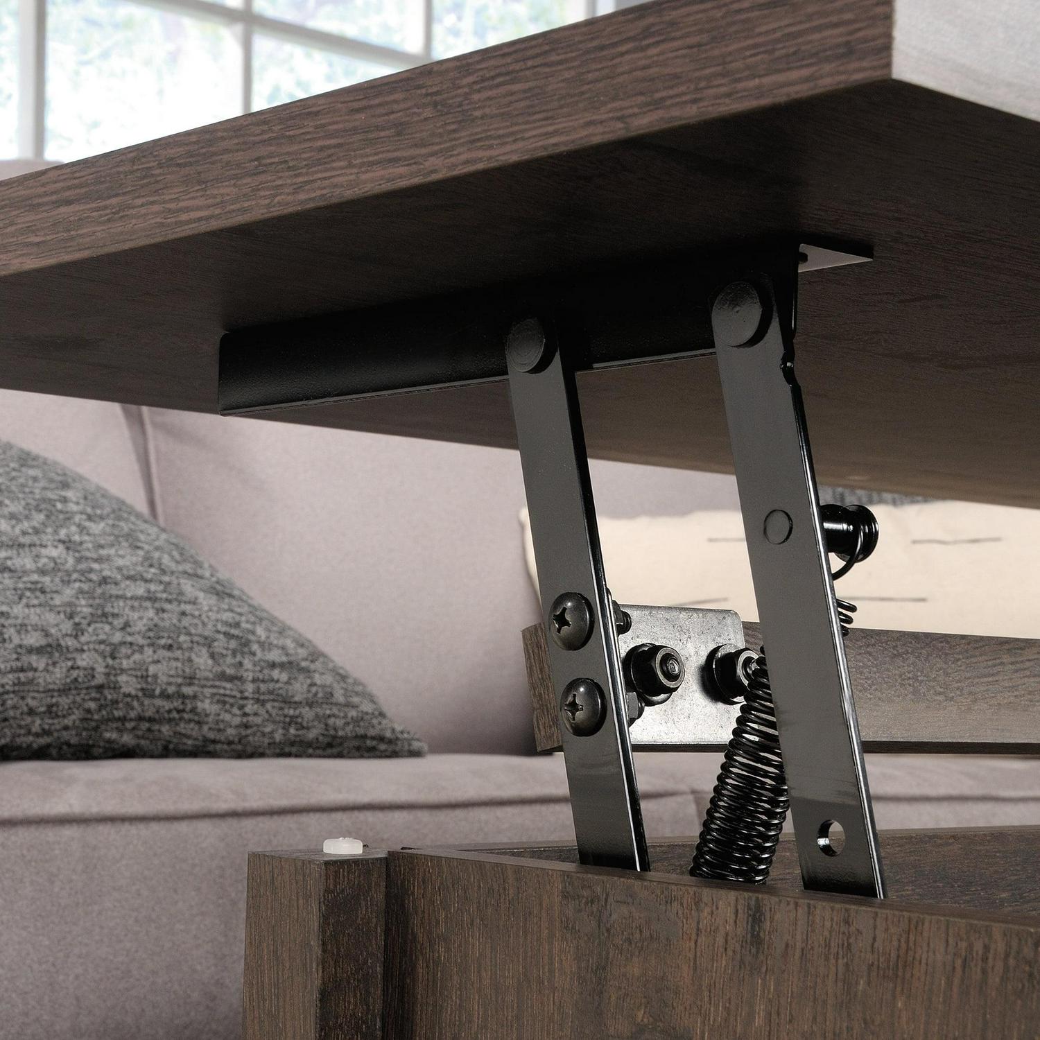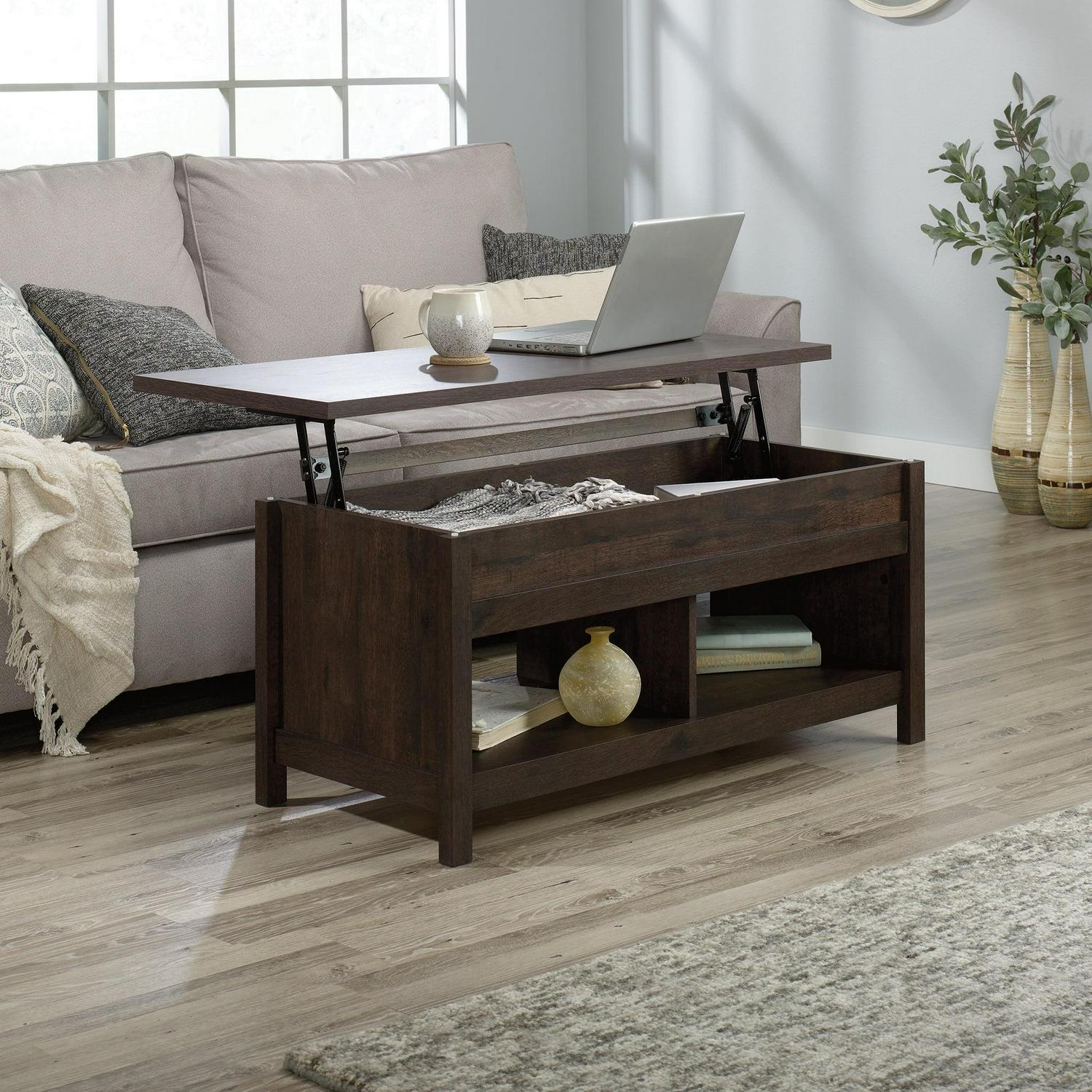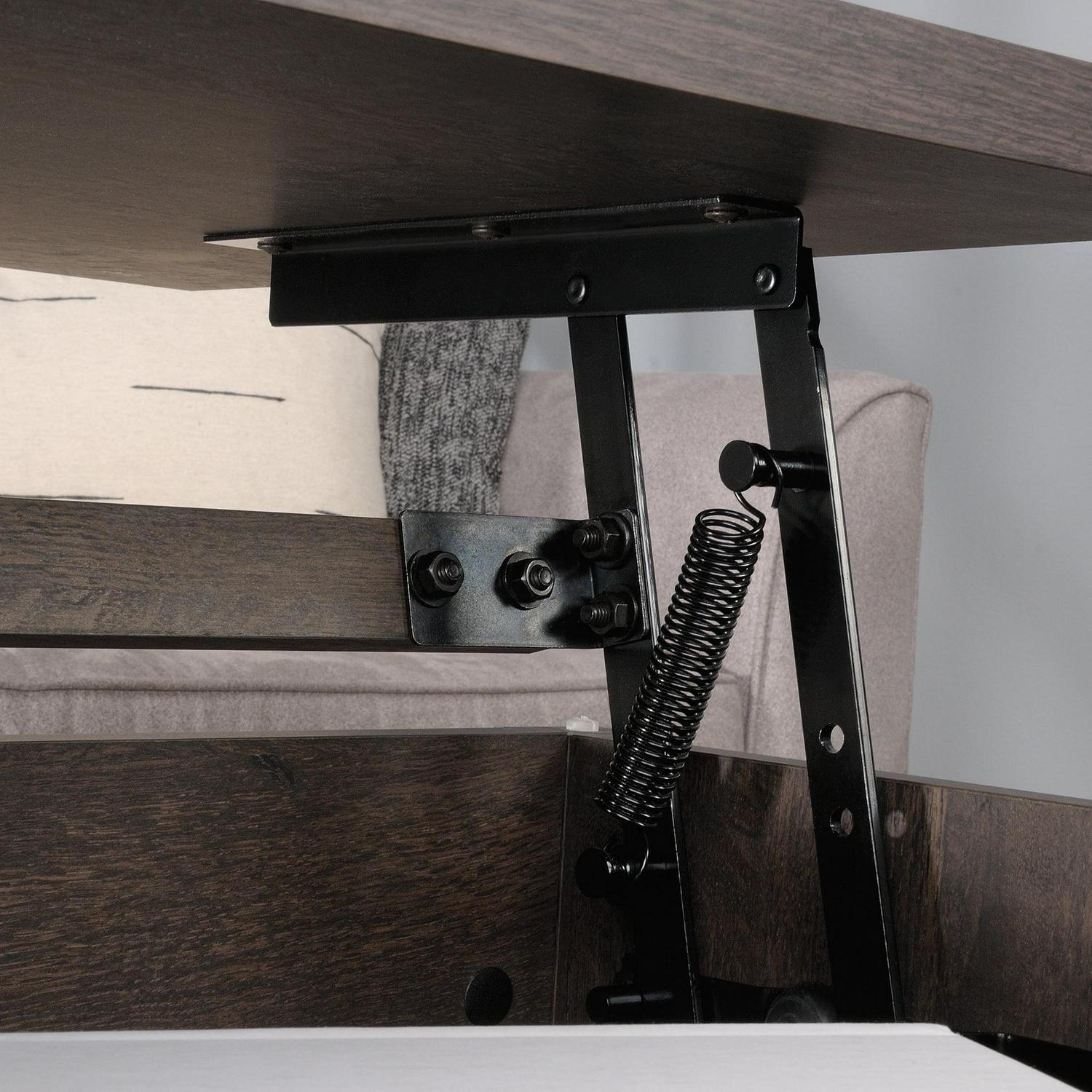 The centerpiece of your living room should look just as great as the rest of your home. Add beautiful style and one-of-a-kind functionality to your living room with this lift-top coffee table from the cannery bridge collection. This coffee table with storage features a unique design that allows the top to lift up and move forward to create a versatile surface for you to work on projects, surf the web, or enjoy a yummy dinner all while relaxing from the comfort of your own couch. Beneath the top surface of this coffee table with a lift-top is a hidden storage area that provides you with the perfect spot to stow away items like stacks of books, your collection of magazines, and spare blankets. The lower open shelves provide you with additional storage space for items like organizing bins and home decor. This coffee table with lift-top is finished on all sides for versatile placement anywhere in your home. Finished in coffee oak, this storage coffee table is just what your home needs.