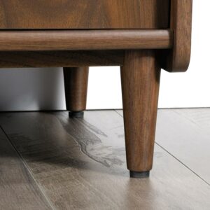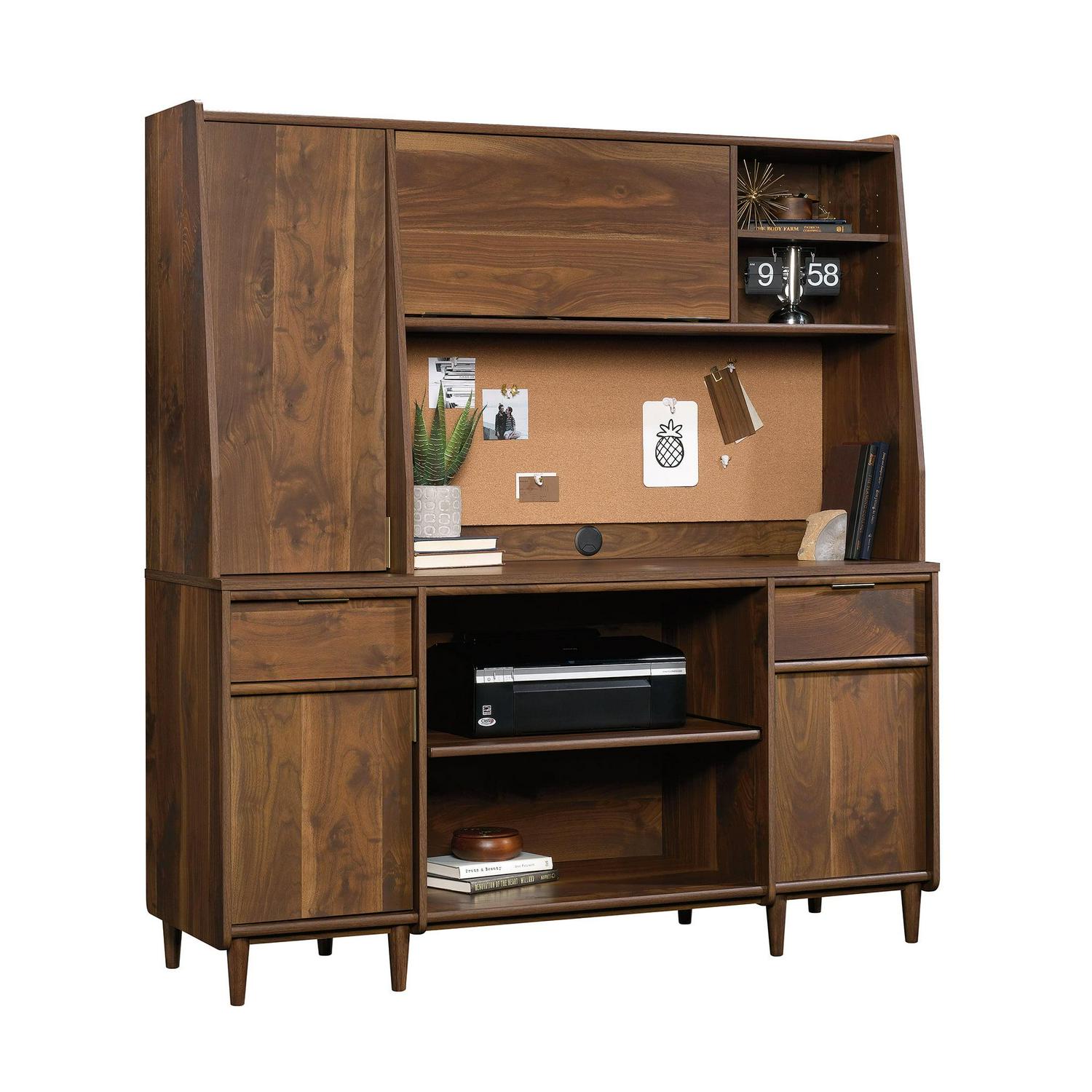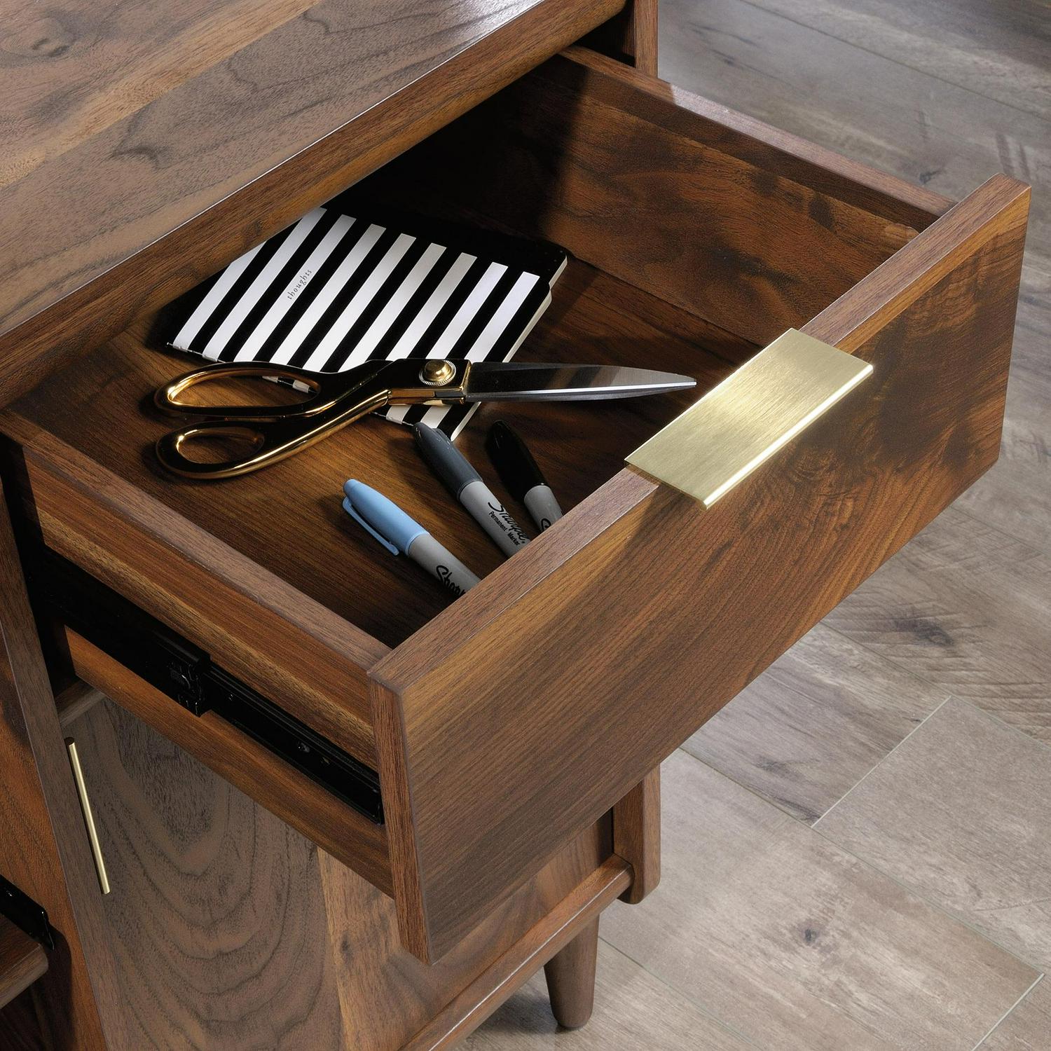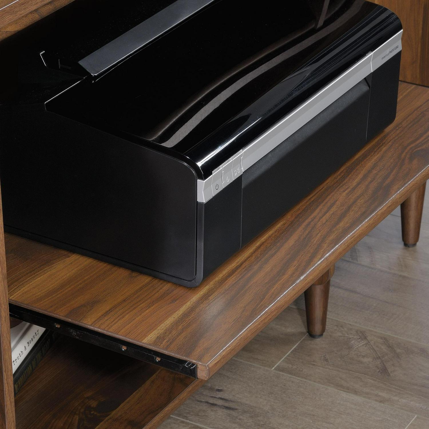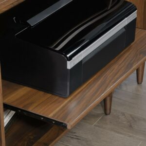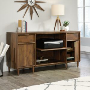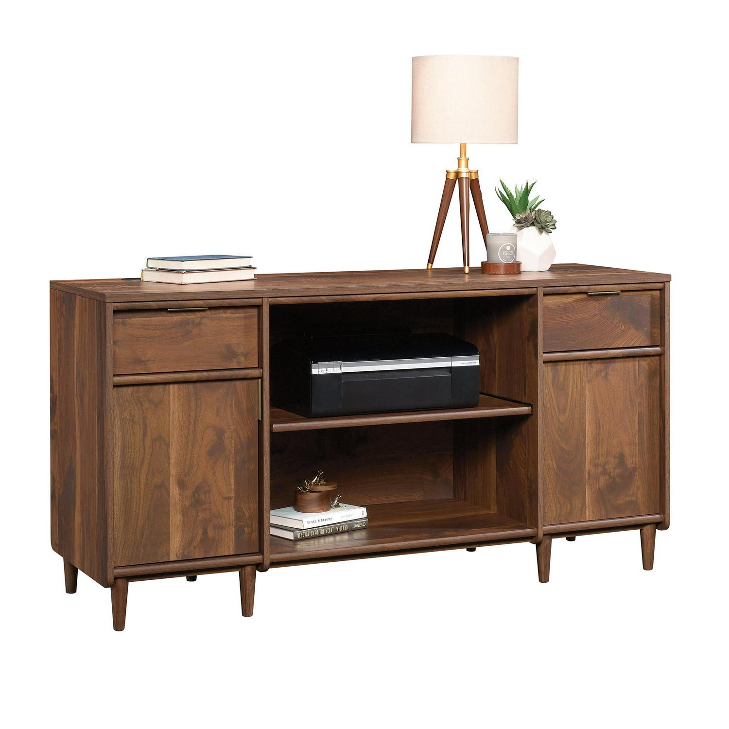 Living room or office space beginning to look a little blah Spruce it up with this mid-century-inspired credenza from the Clifford Place collection. Does this handsome credenza offer a spacious tabletop surface that provides you with room to display all your favorite home decor a stylish accent lamp, a decorative plant and a sweet-smelling candle. It also makes the perfect spot to set your keys as you walk in the door. It features two drawers that open and close on smooth full extension slides. These easy gliding drawers offer the ideal amount of room to store and stash away miscellaneous around home clutter. Behind each door is hidden storage that includes an adjustable shelf, making it a prime spot for all your additional storage needs. The open storage in the center includes a slide-out printer shelf so you can easily access your printer or other office equipment. It also features a grommet hole and pass-through so you can keep all your cords and wires neatly out of the way. Finished on all sides in a warm Grand Walnut and accented with solid wood feet and bold brass hardware, this stylish credenza makes a beautiful focal point for any room in your home.
