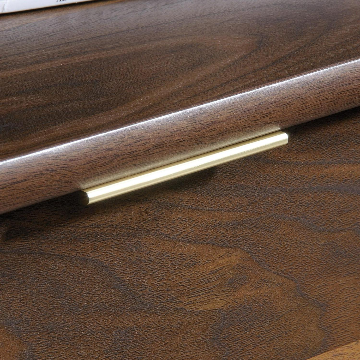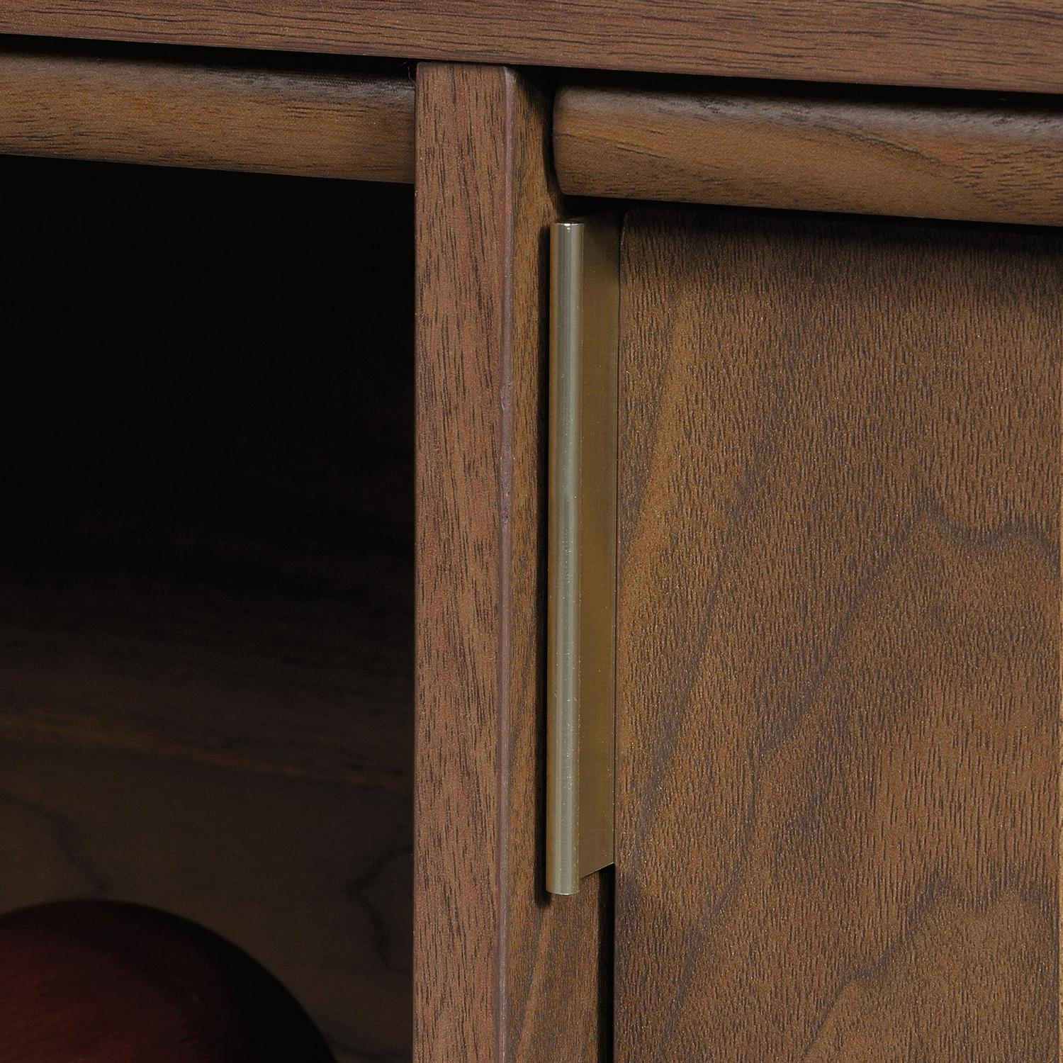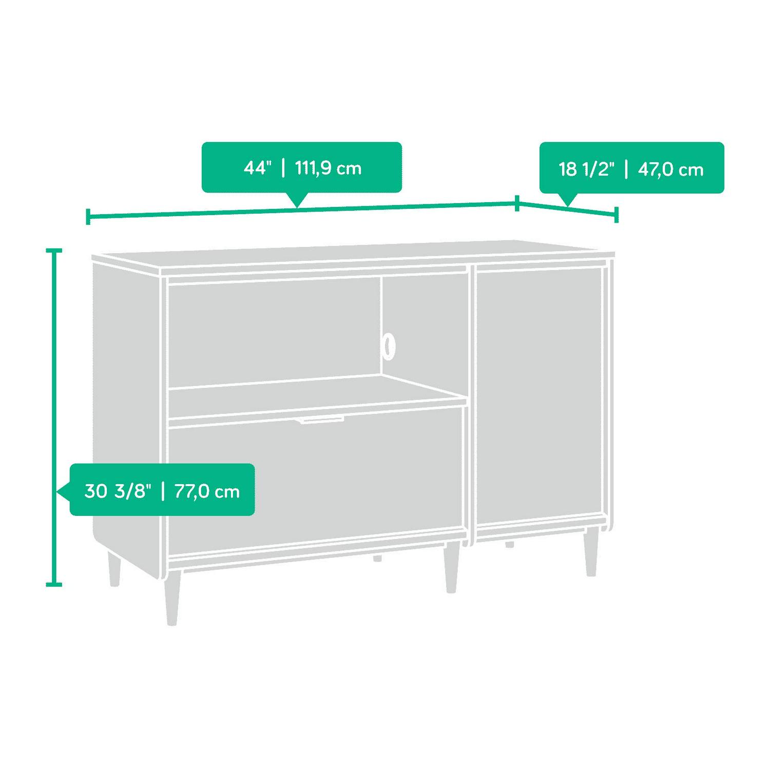 Bring a touch of elegant, mid-century-inspired style to your home with this credenza from the Clifford Place collection. This beautiful credenza offers a spacious tabletop surface that provides you with room to display a stylish accent lamp, a decorative clock, and photos of family and friends. Switch it up and use it as a TV stand! It accommodates up to a 46″ TV, making it perfect for binge-watching all your favorite shows. Its large open shelf provides you with the ideal amount of space to store and display movies, books, bins, and another home decor. Behind the door is hidden storage that includes an adjustable shelf for all your additional storage needs. The lower file drawer opens and closes on smooth full extension slides and holds letter or legal size hanging files so you’ll always be organized! It also features cord pass-throughs to keep all your wires neat and out of the way. Finished on all sides in Grand Walnut and accented with solid wood feet and bold brass hardware, this stylish credenza will stand out in any room.
