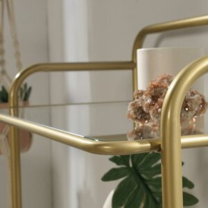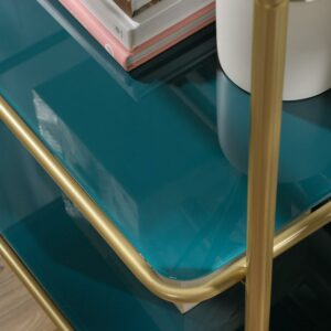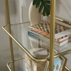 Boring living room decor is a thing of the past. Its time to give your home a fresh new look with this bookcase from the Coral Cape collection. This stunning gold bookcase features spacious open shelving for convenient storage and display. It includes five safety-tempered glass shelves that are ideal for storing an array of different items like stacks of books, work binders, and organizing bins. These large shelves are also great for displaying home decor items like decorative plants, your collection of knick-knacks, and photos from your latest family vacation. The two lower shelves of this metal bookshelf feature teal tined silk-screened glass for an extra touch of style that is sure to stand out. This display bookshelf is constructed from a powder-coated metal frame for added style and durability. Finished in Satin Gold, this mid-century modern bookcase gives your home the style you want with the functionality that you need.